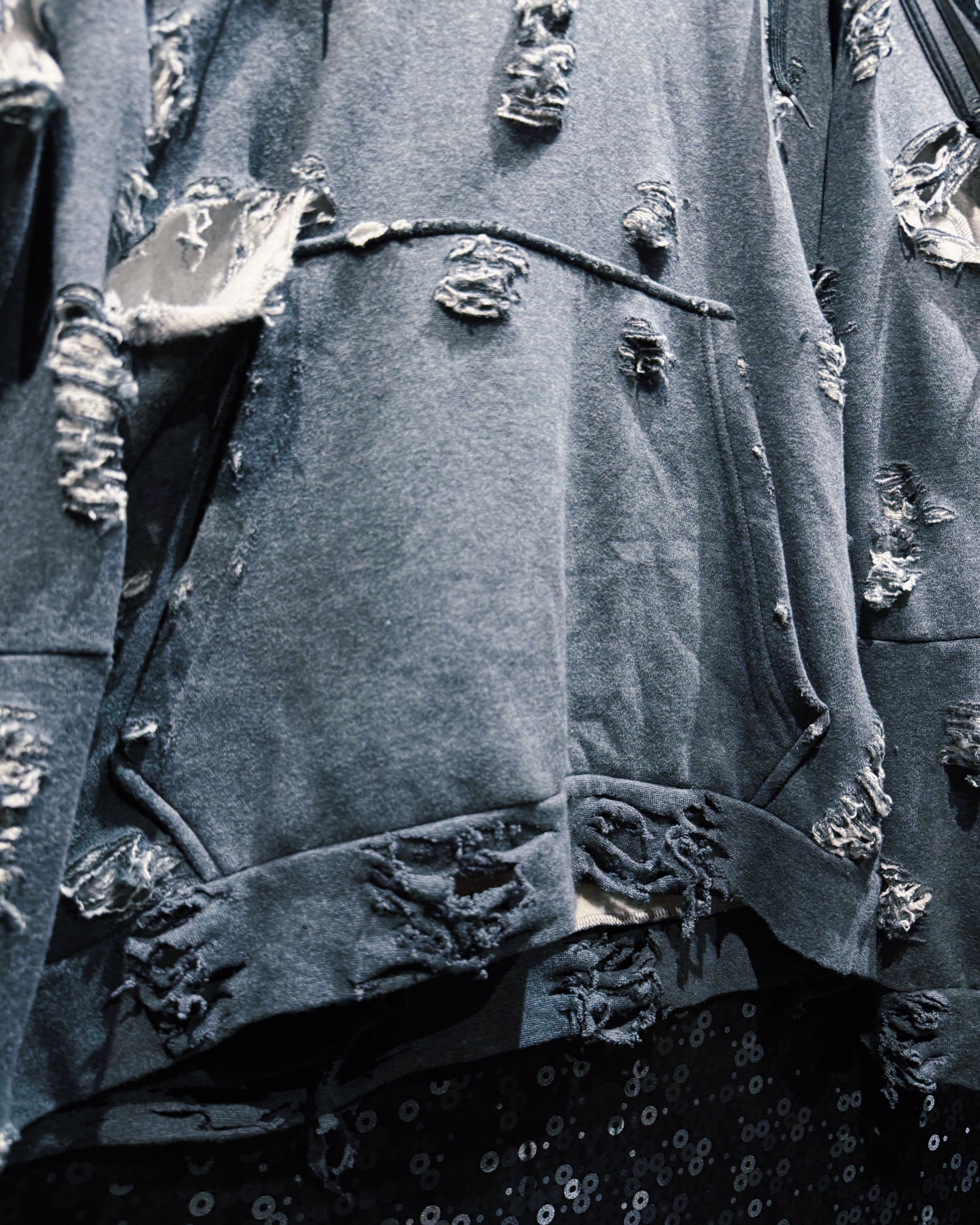 徹底的に施されたクラッシュダメージは、袖からボディ、裾に至るまで大胆に配置され、レイヤー下の白地が覗くことでより立体的な表情を生み出している。