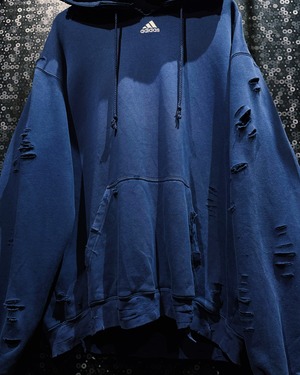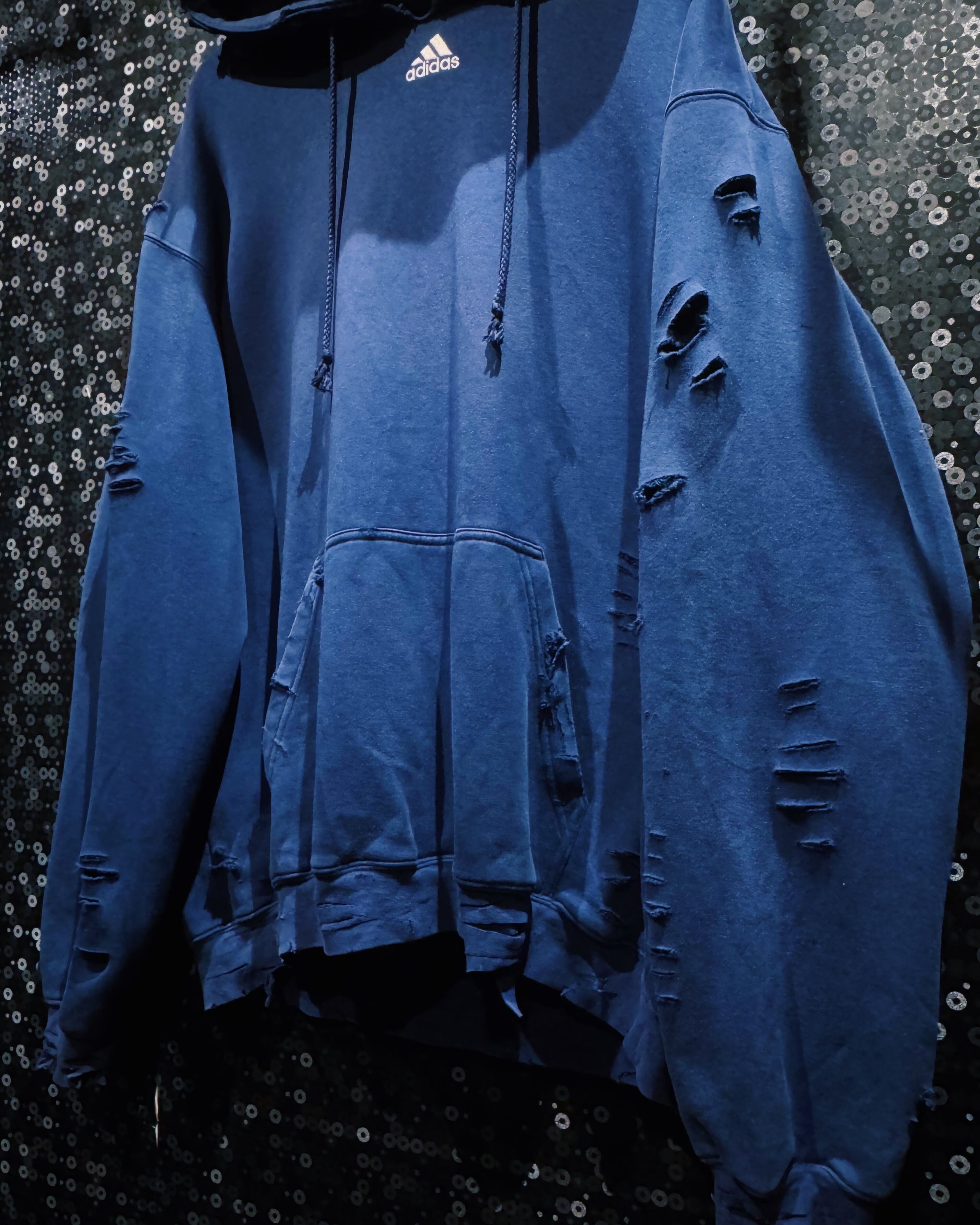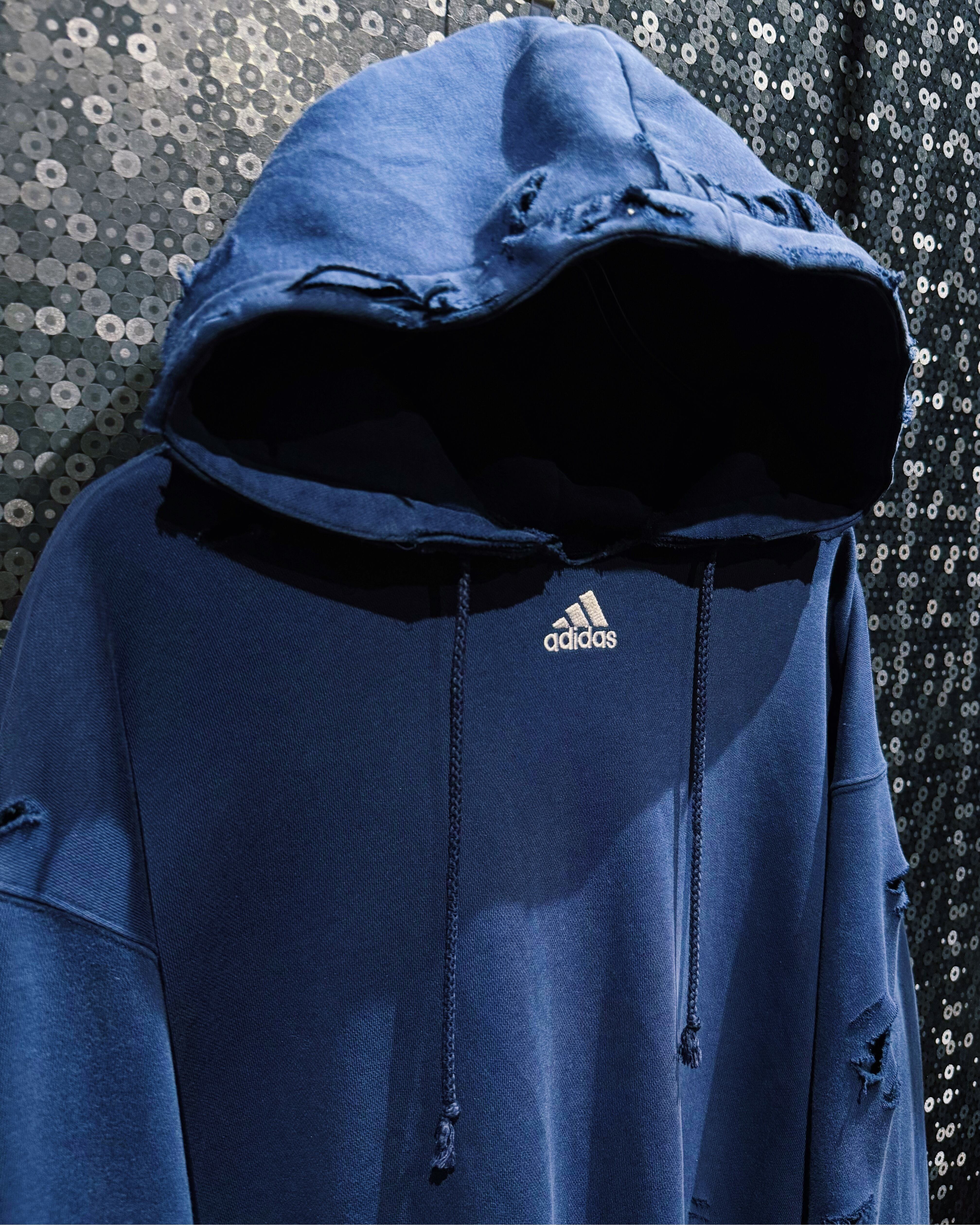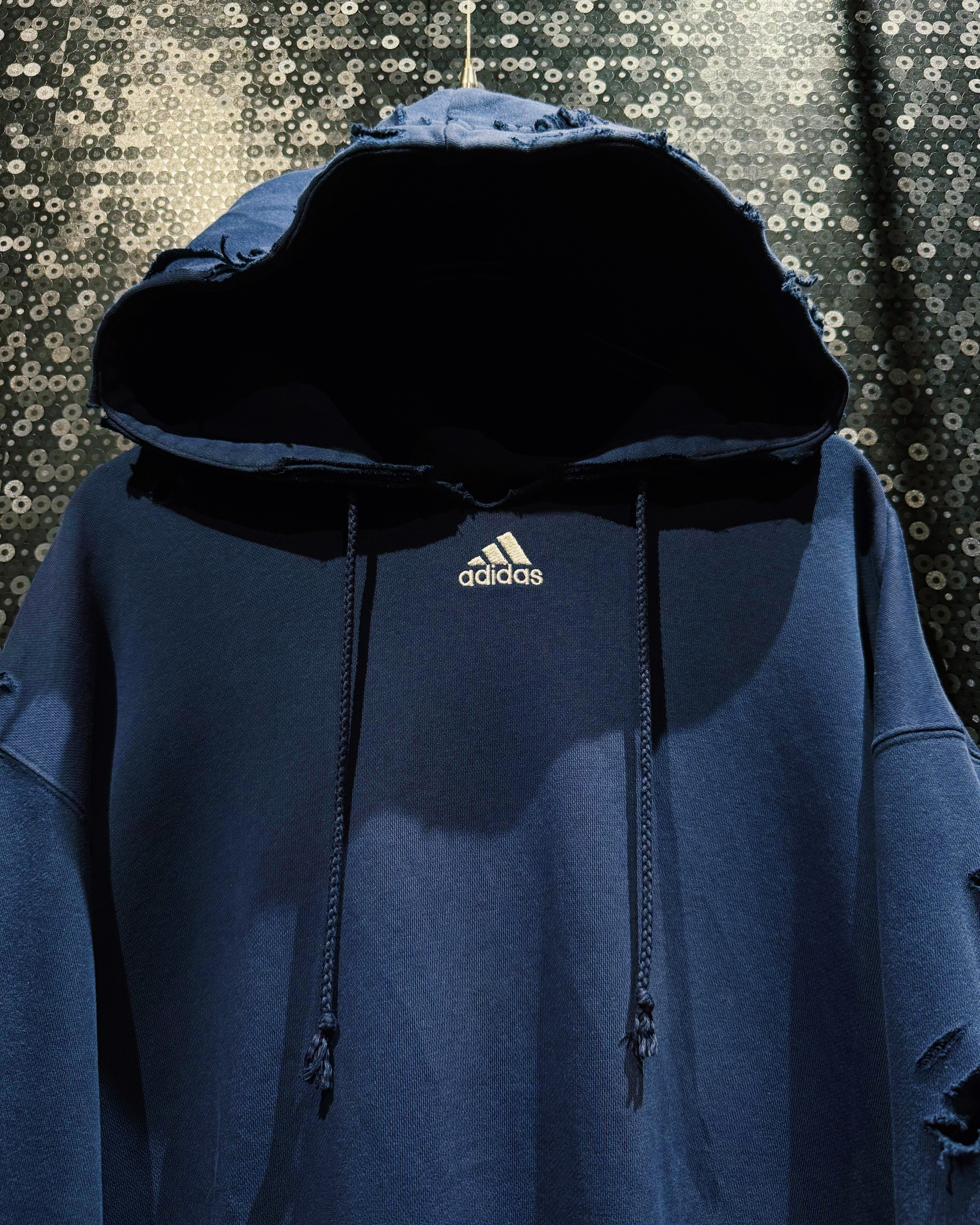 ネイビーボディにホワイトのadidasパフォーマンスロゴが映えるフーディーをベースに、クラッシュ加工を施したオリジナルボロリメイク仕様。