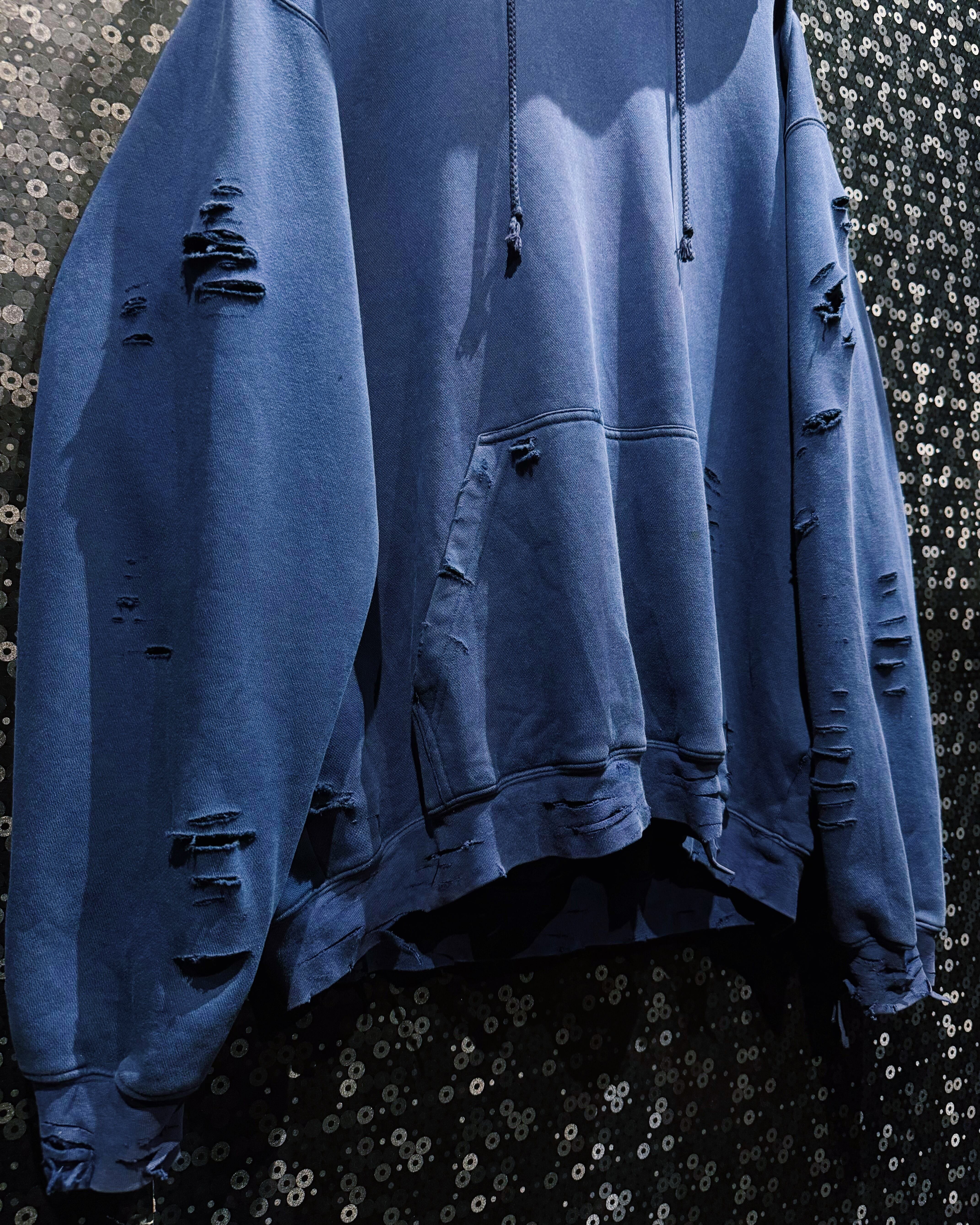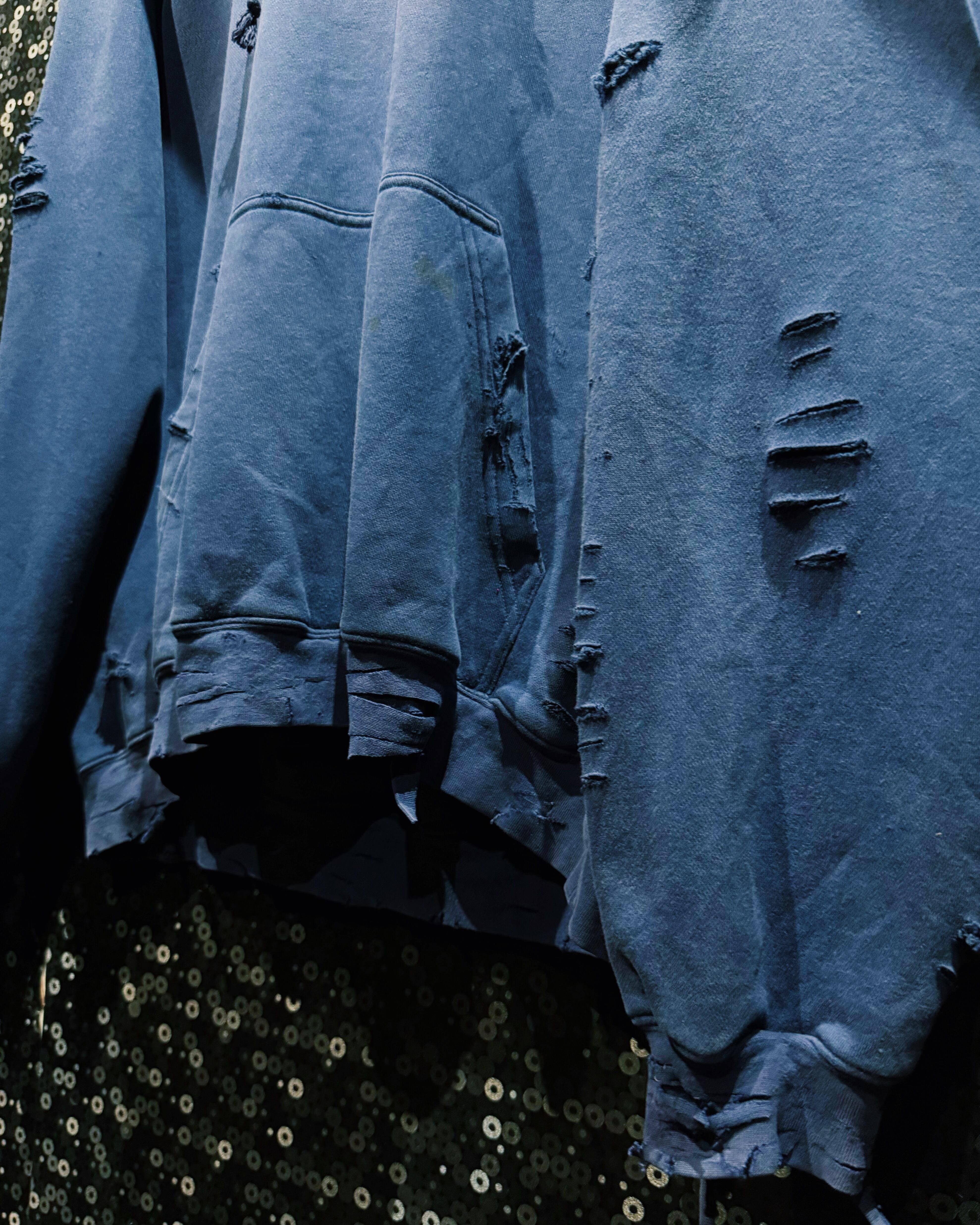 フード周りや袖、ボディに大胆なダメージを加え、着古したようなリアルな経年変化を再現している。