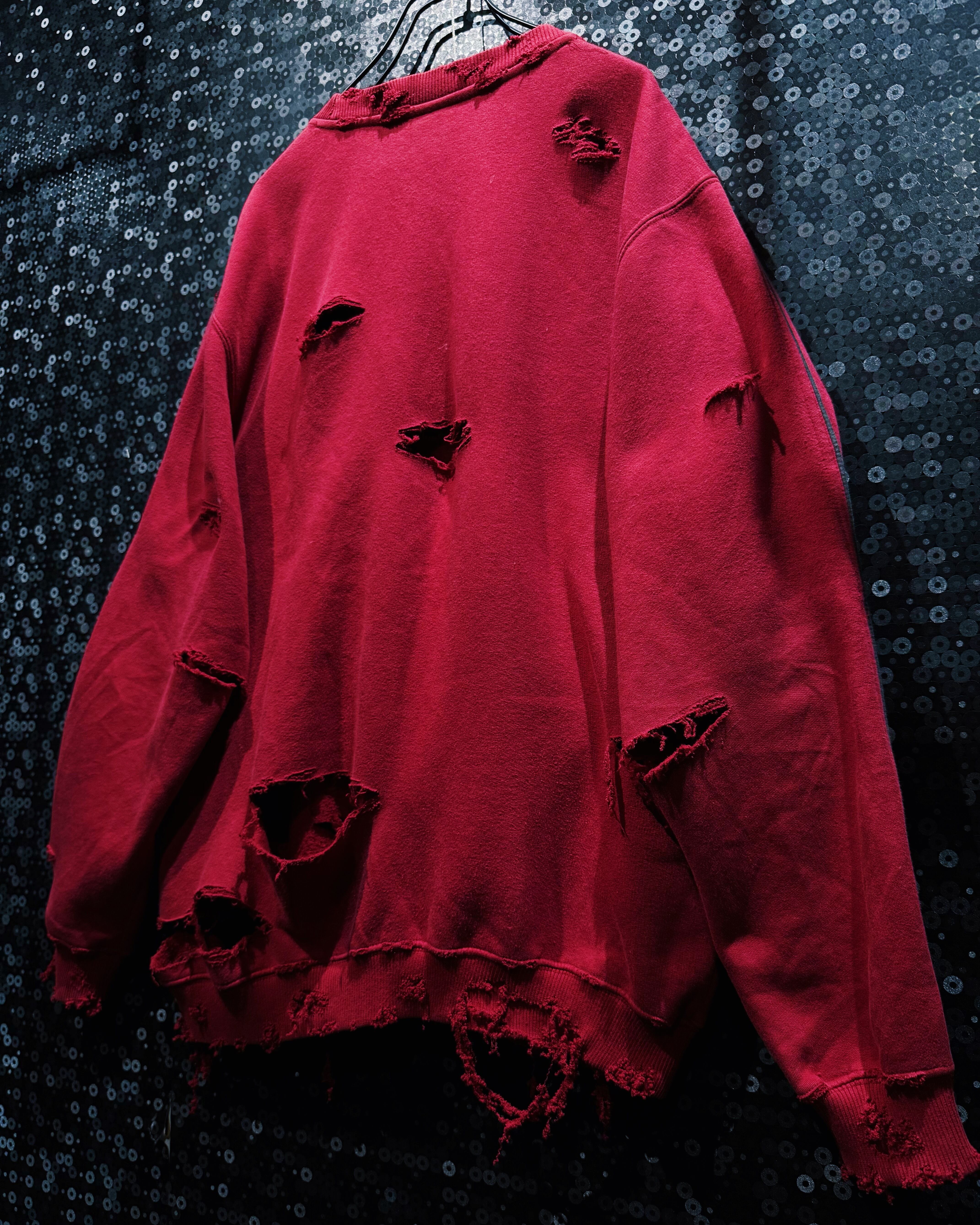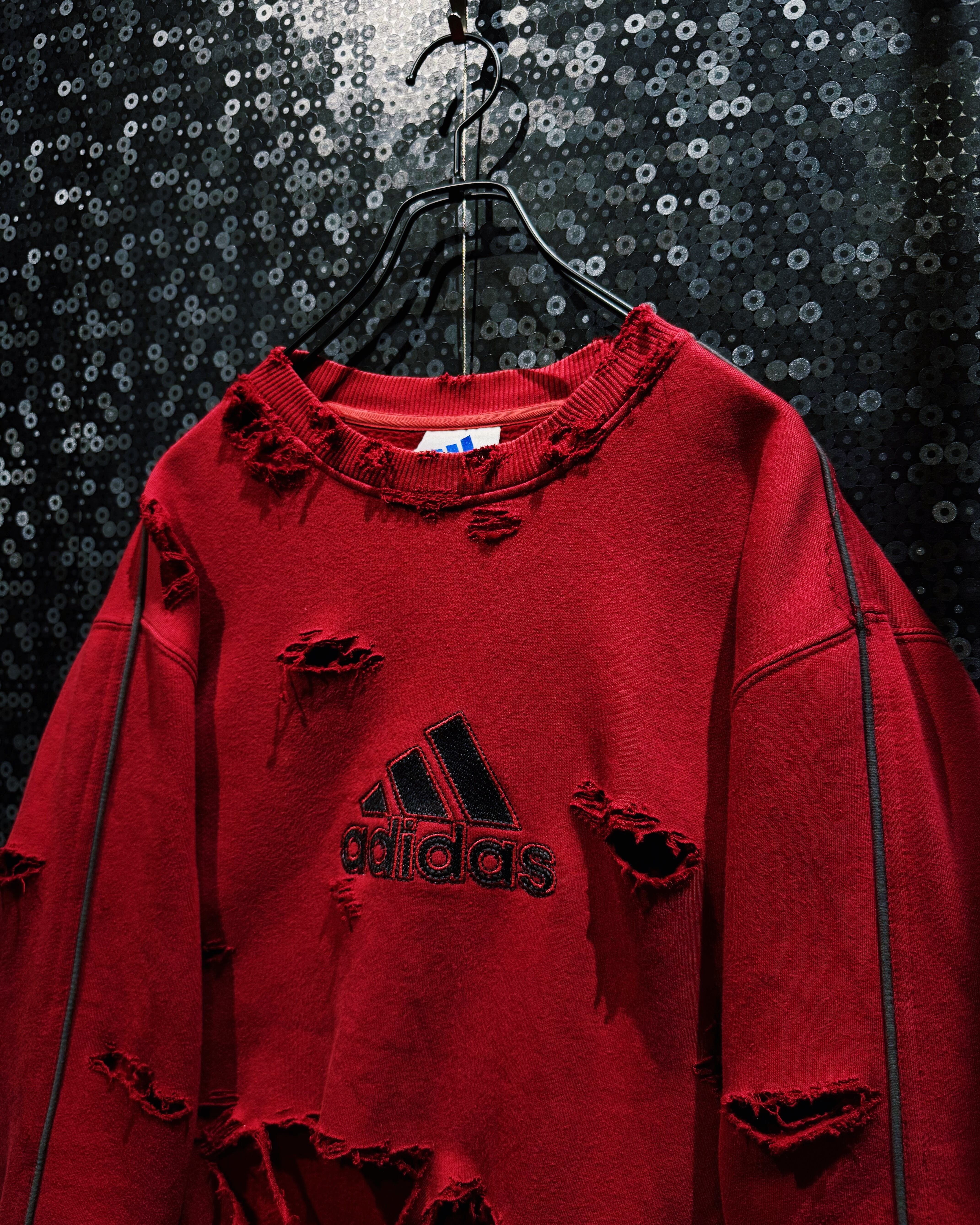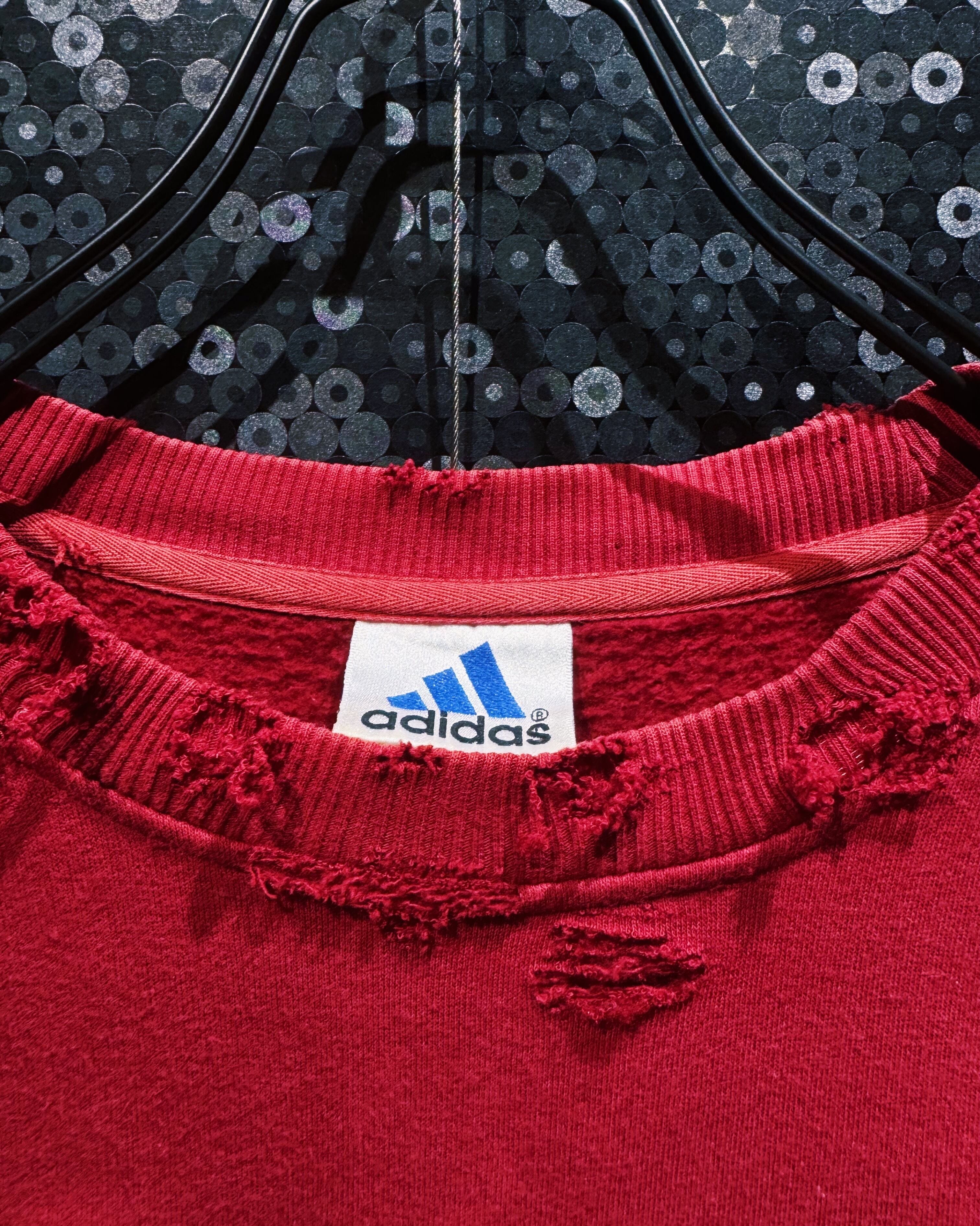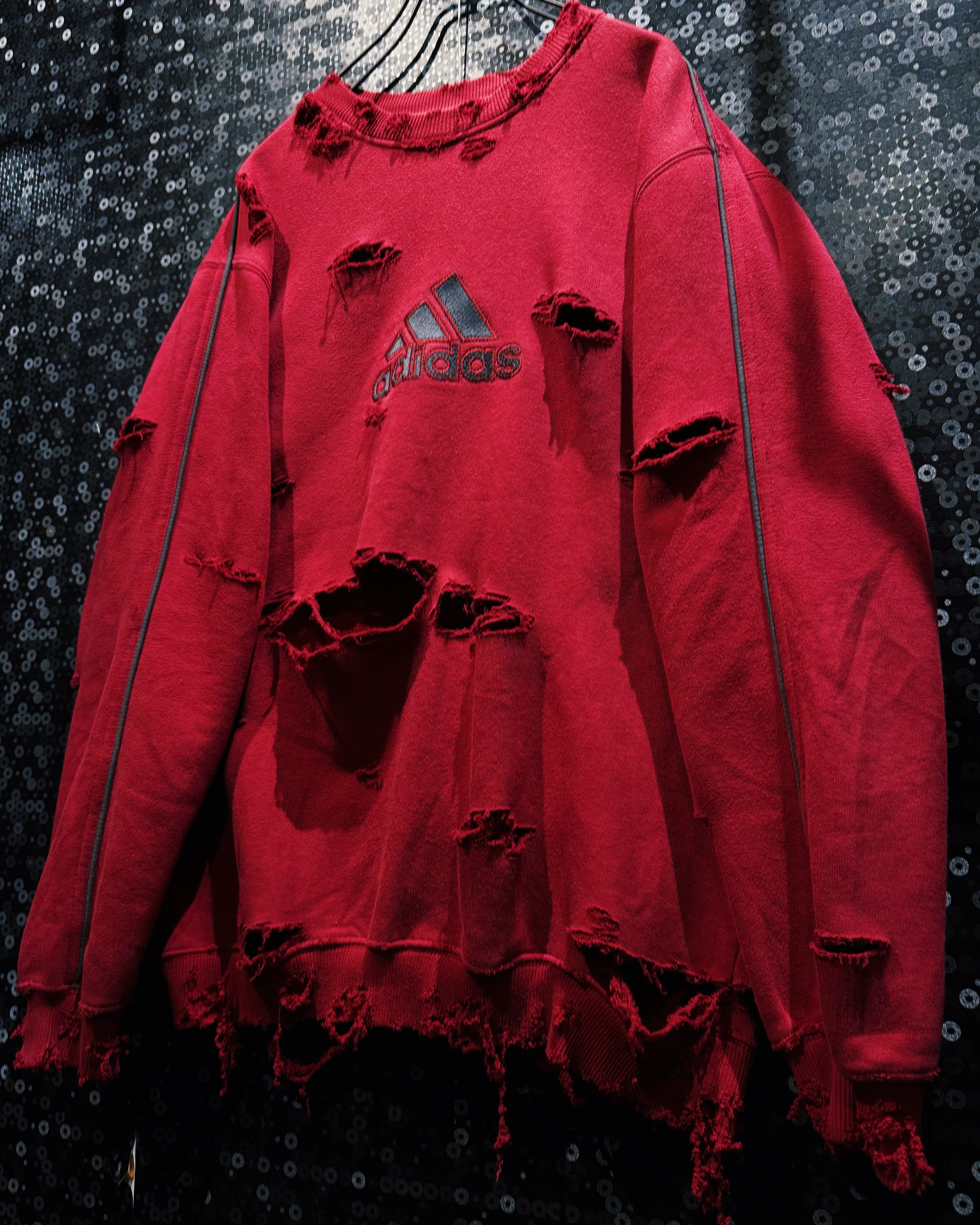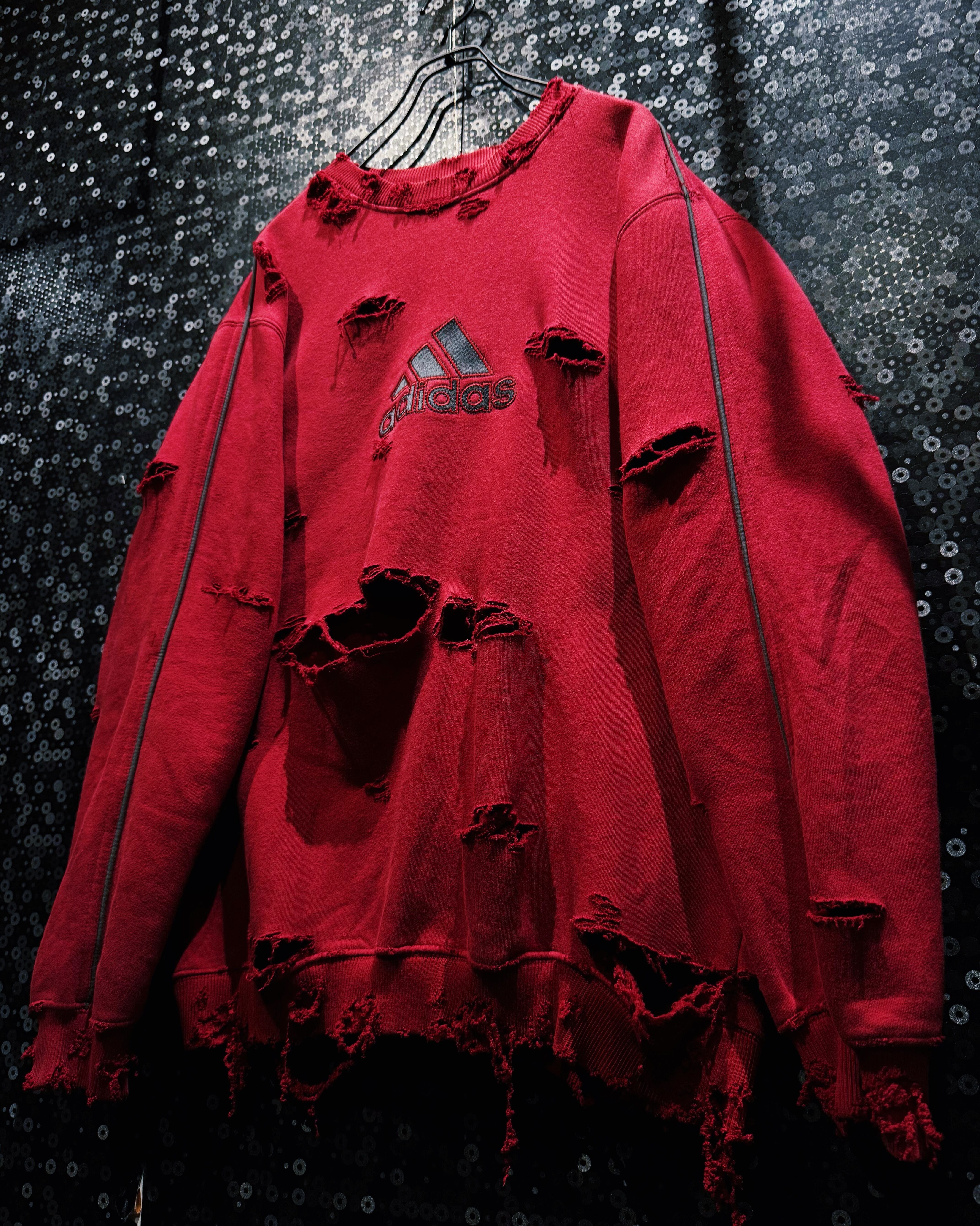 adidasのパフォーマンスロゴをフロントに大きく配したレッドスウェットをベースに、ダメージ加工を大胆に施したオリジナルリメイクアイテム。