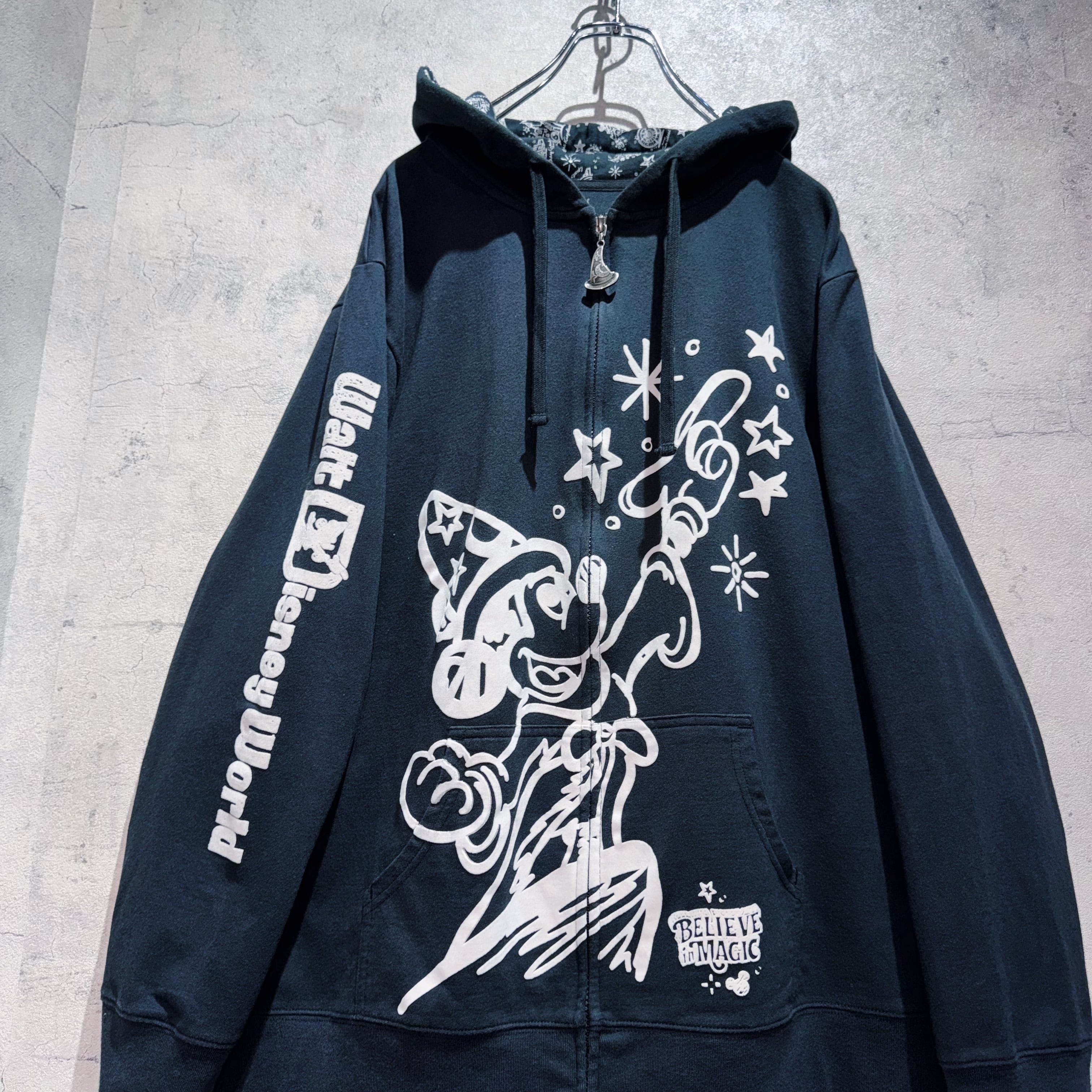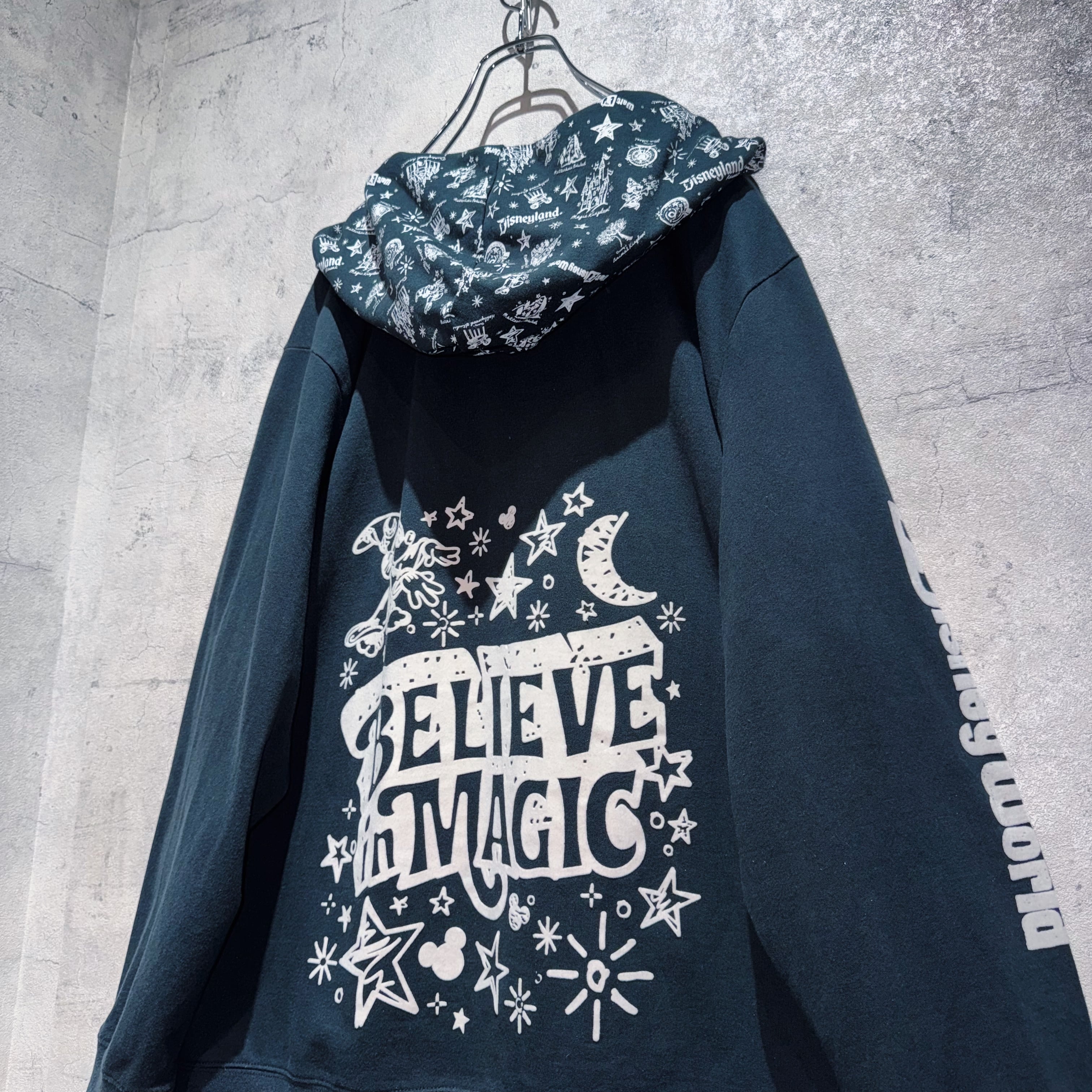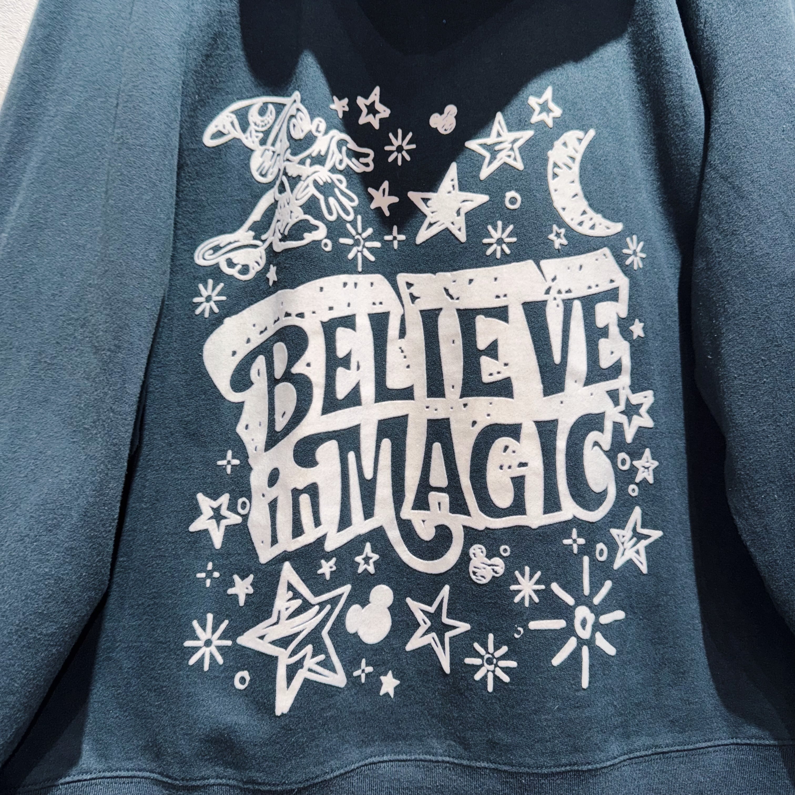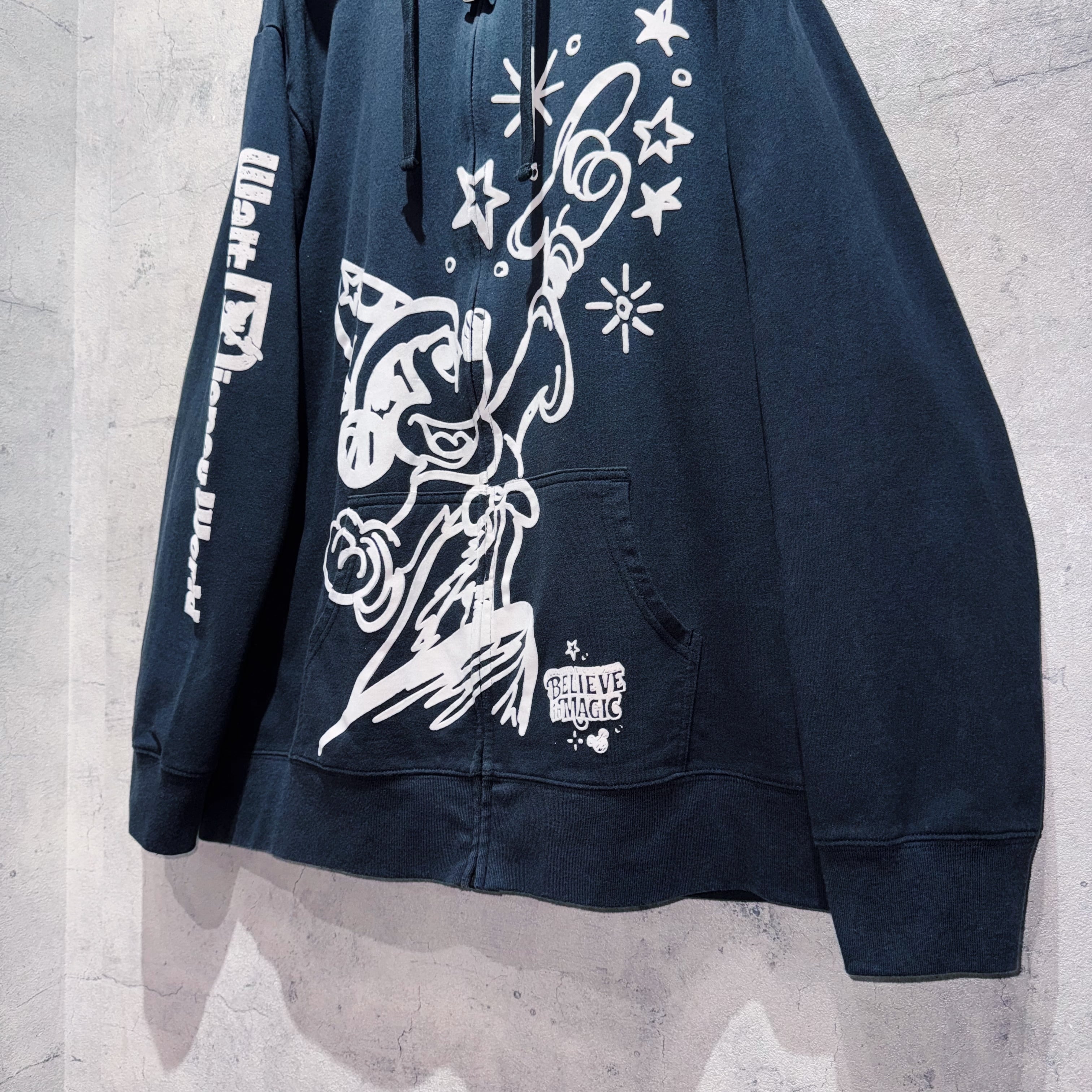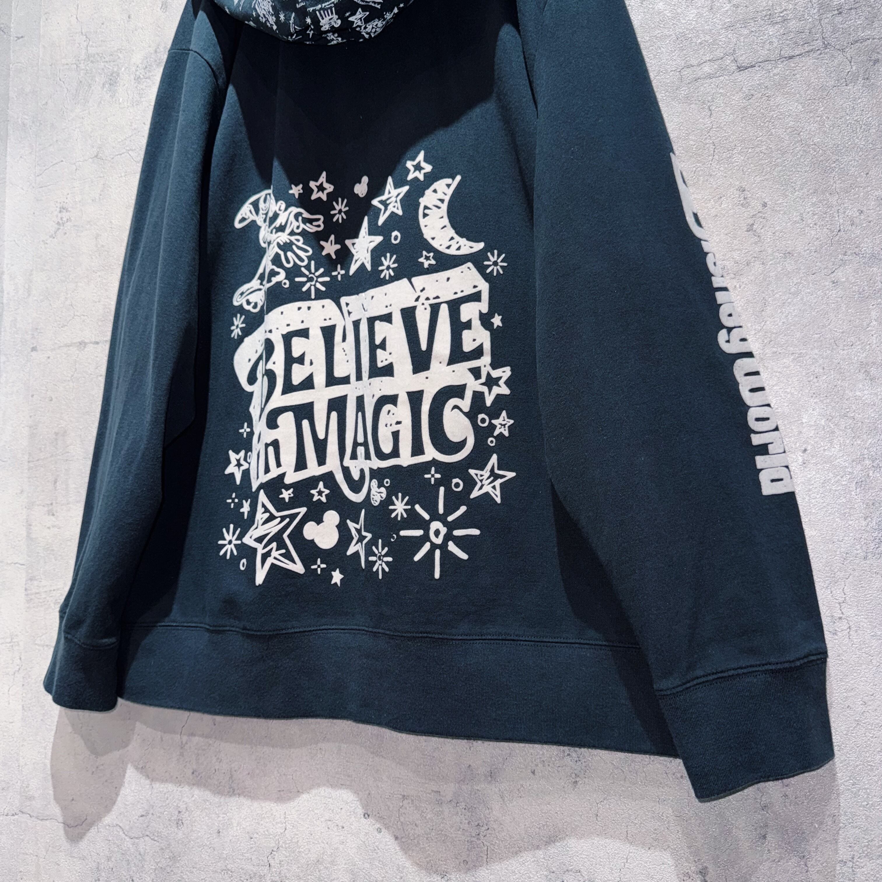 こちらはWDW販売されていた「BELIEVE in MAGIC」デザインのジップフーディー。フロントには魔法を掛けるソーサラーミッキーがベロアのような素材感でプリントされ立体的な仕上がりに。