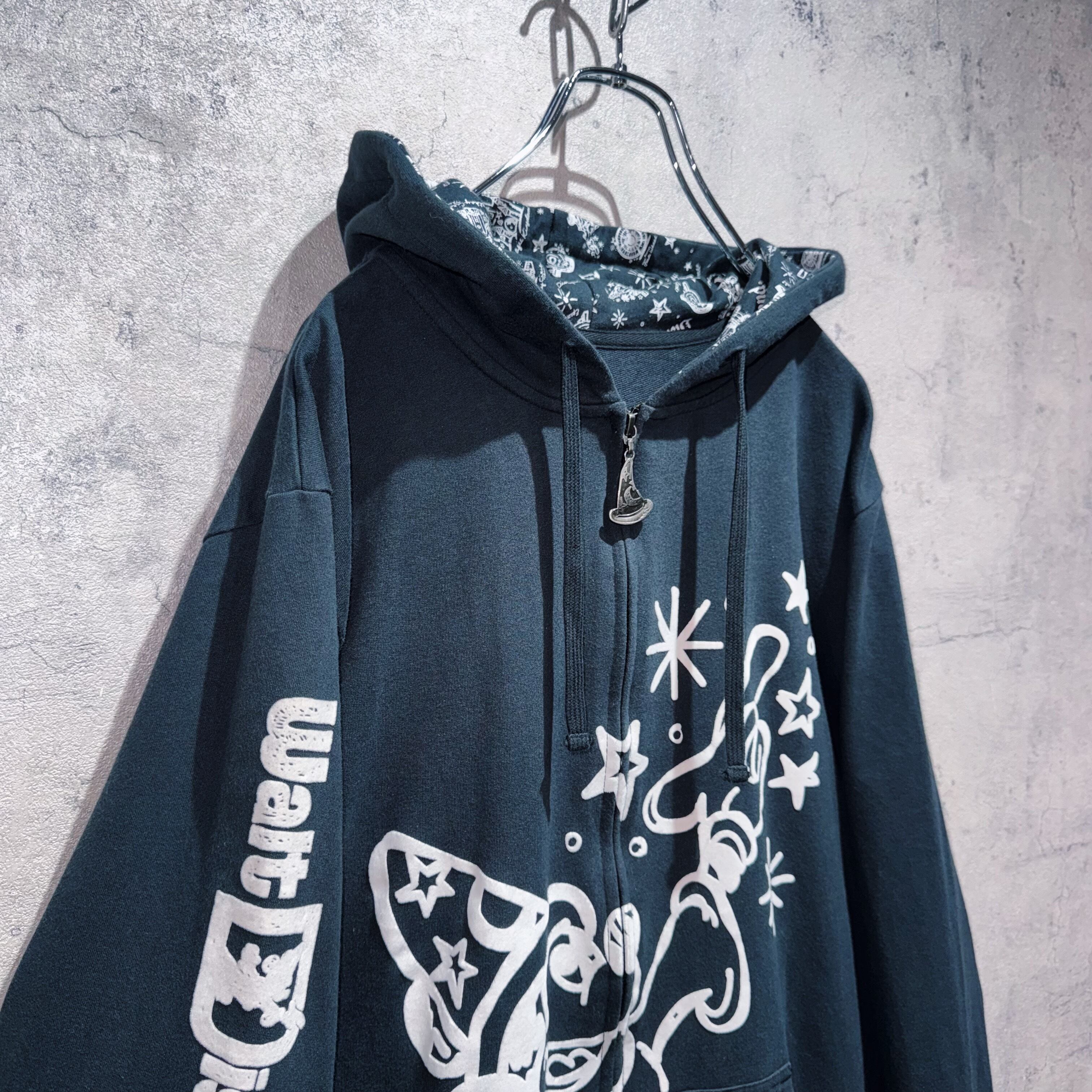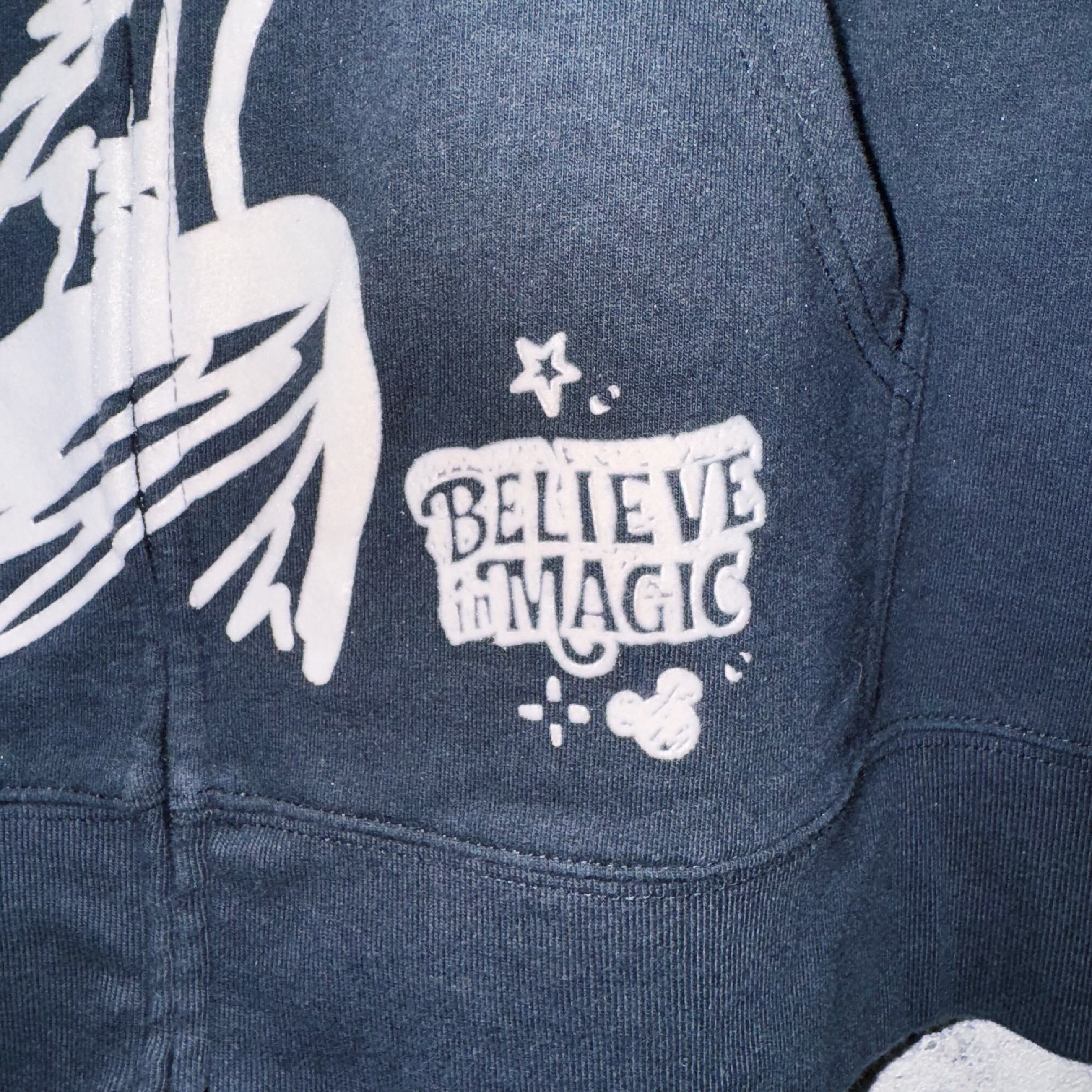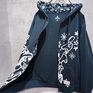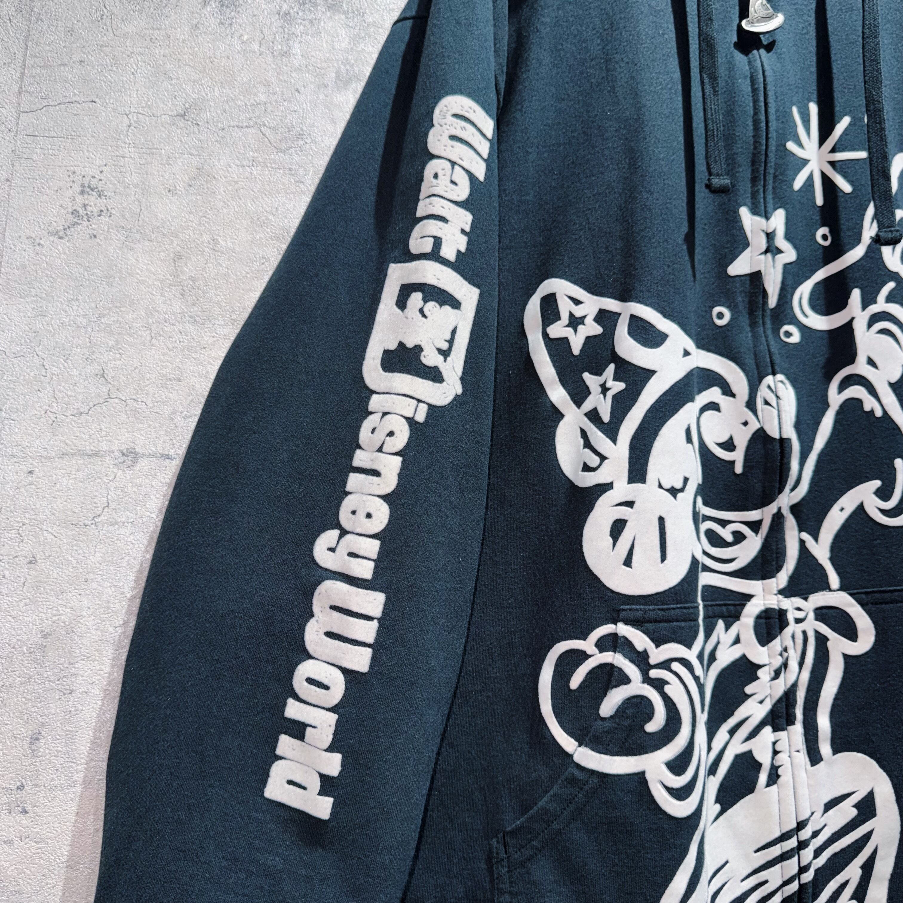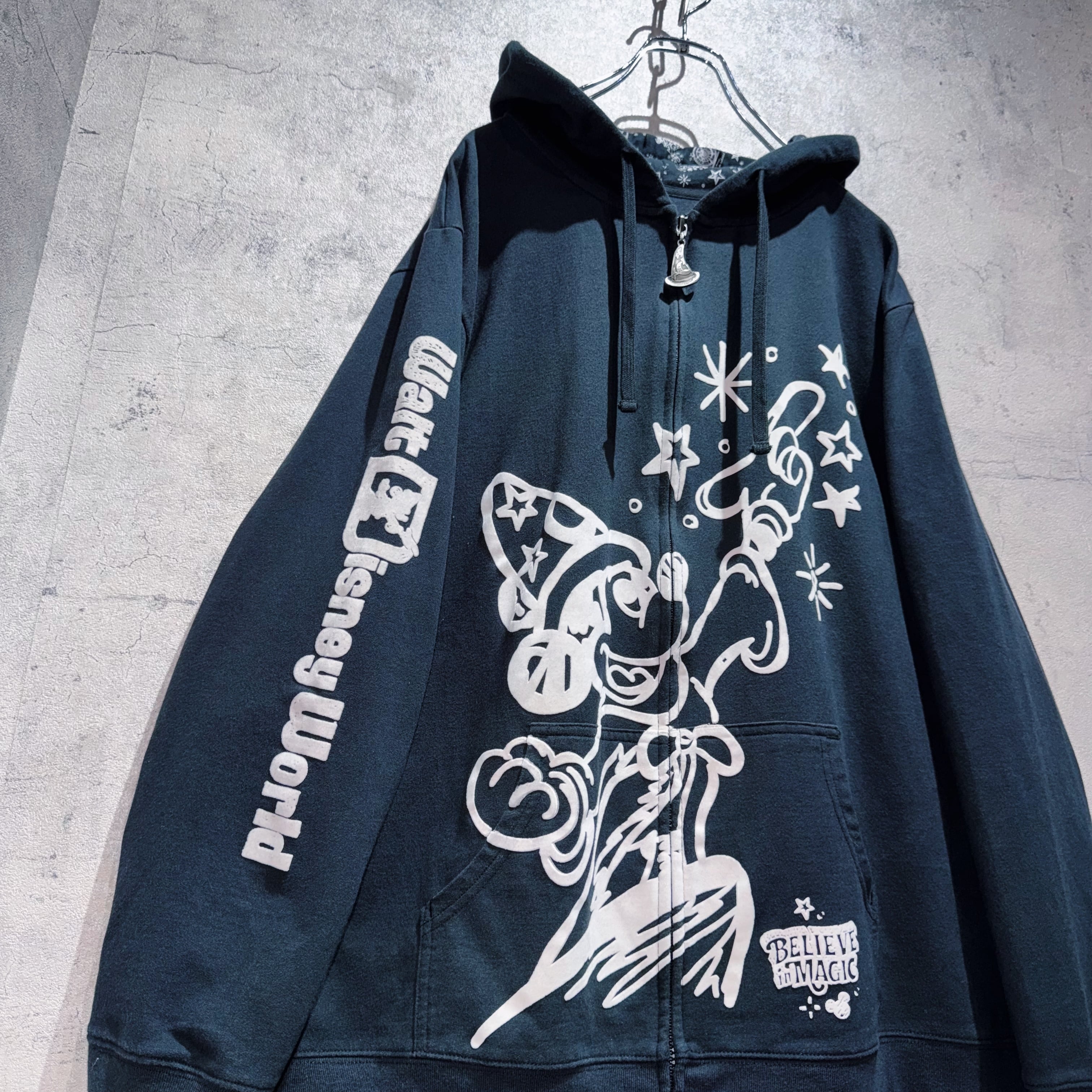 こちらはWDW販売されていた「BELIEVE in MAGIC」デザインのジップフーディー。フロントには魔法を掛けるソーサラーミッキーがベロアのような素材感でプリントされ立体的な仕上がりに。