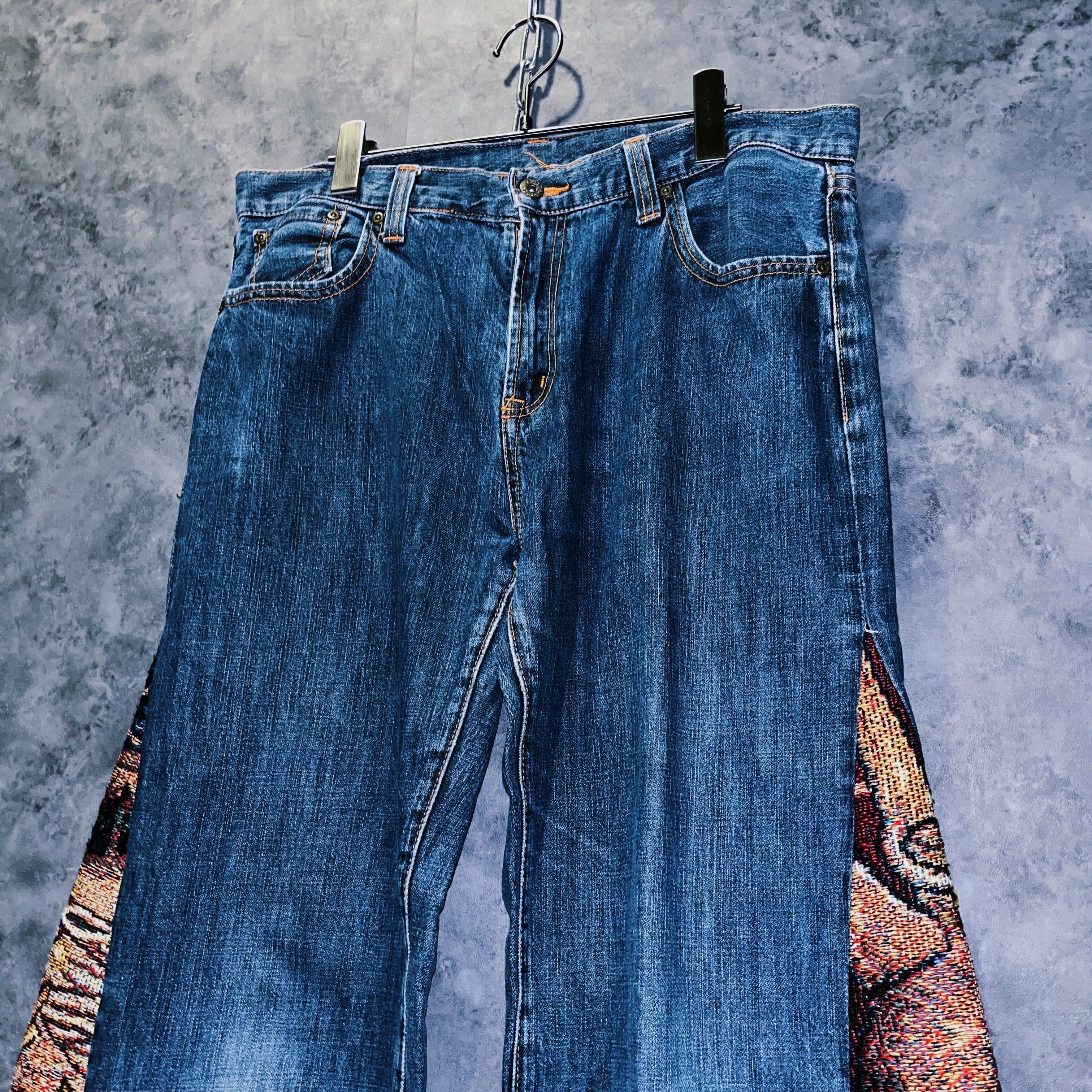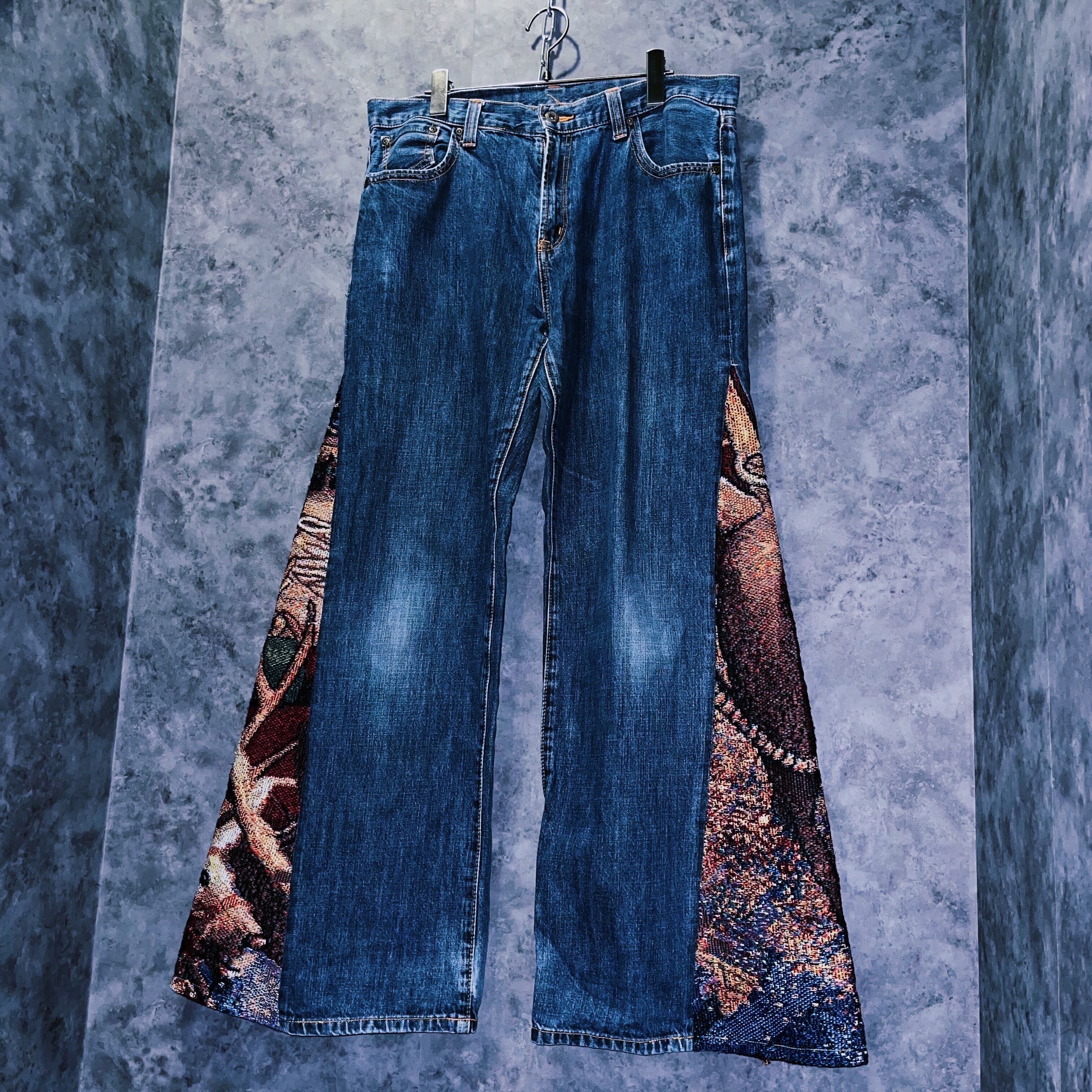 ローライズのデニムをベースに裾から新たにアンティークのユーロラグをパネル状に取り入れ極上のかつ美しいフレアシルエットに変えたフレアデニム。