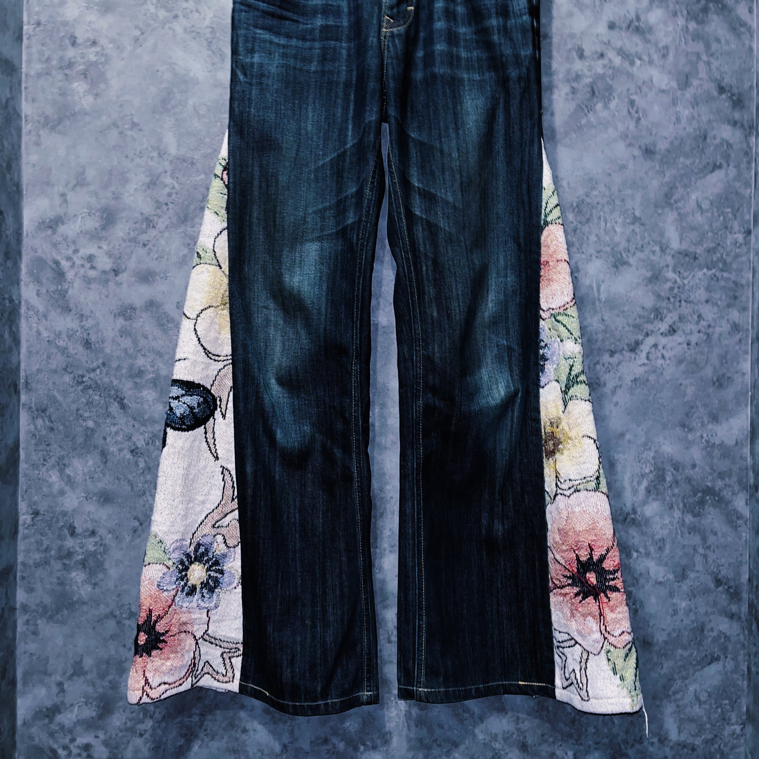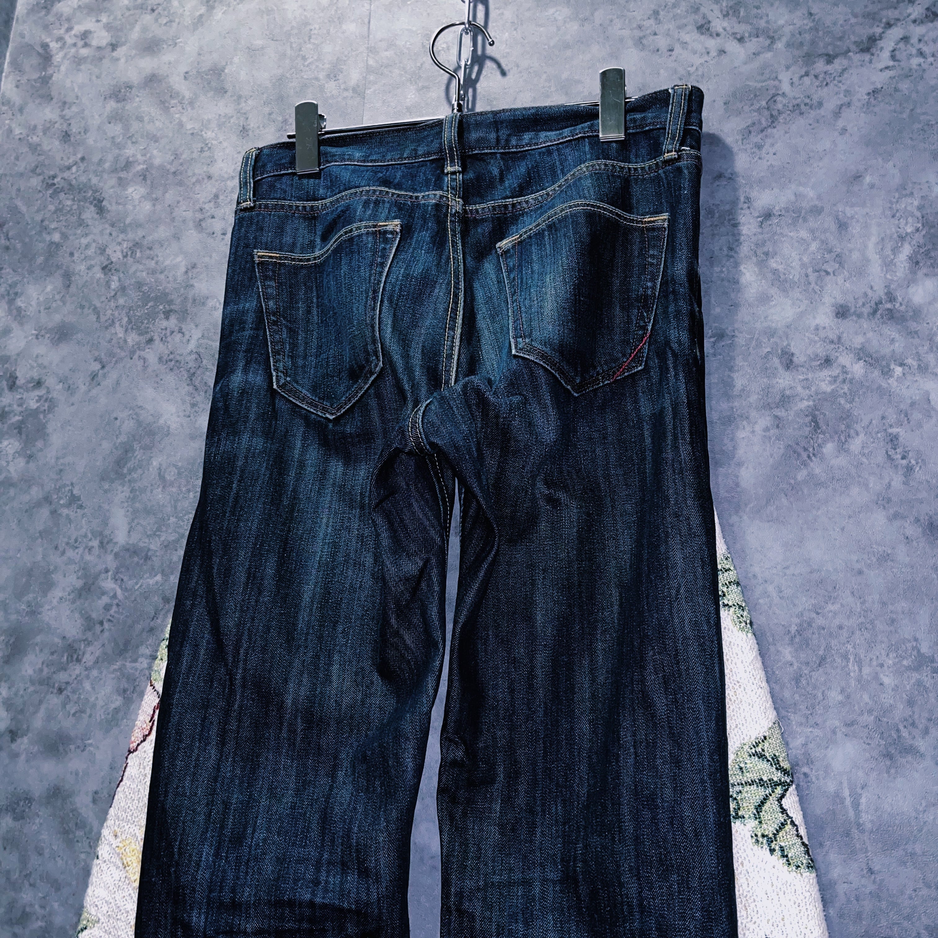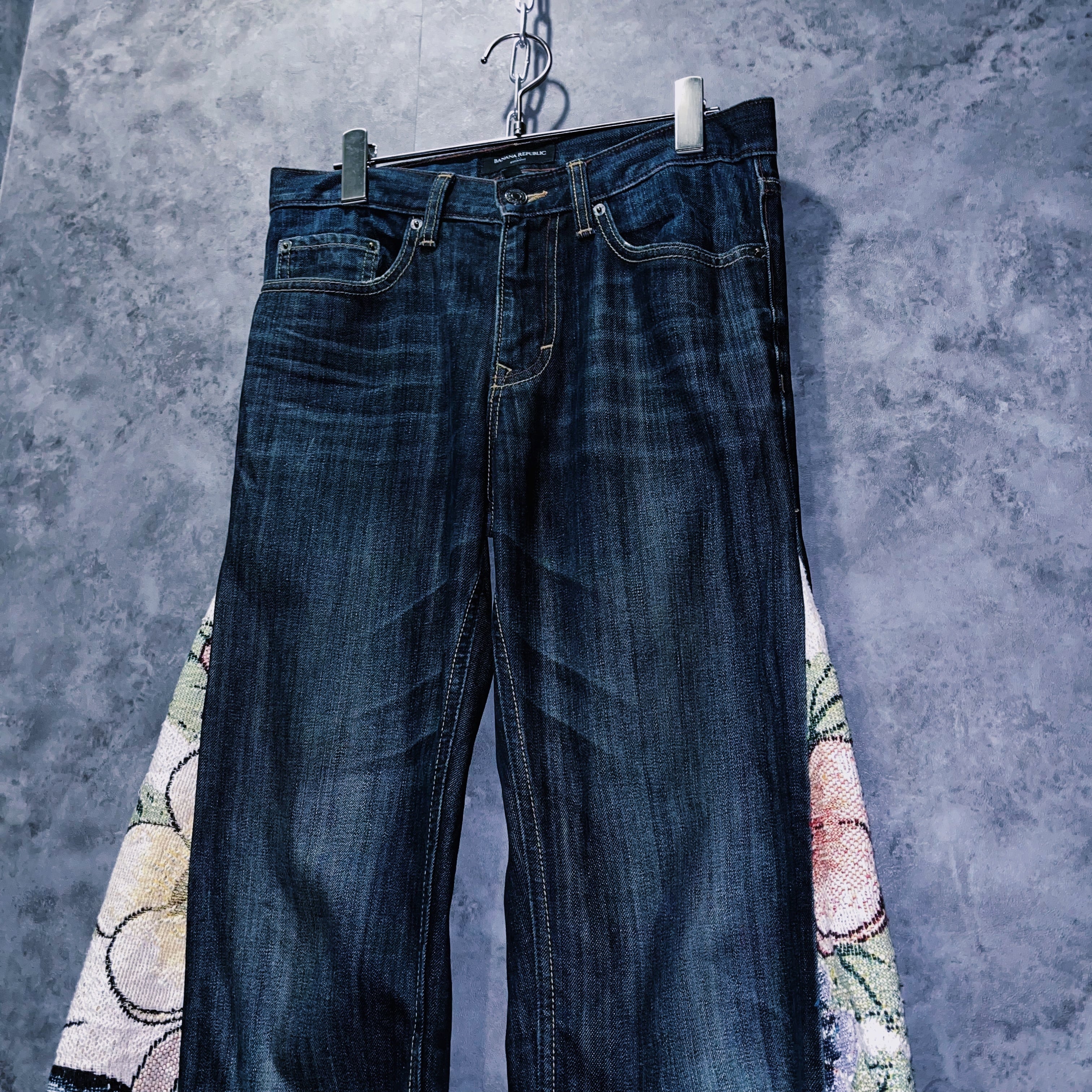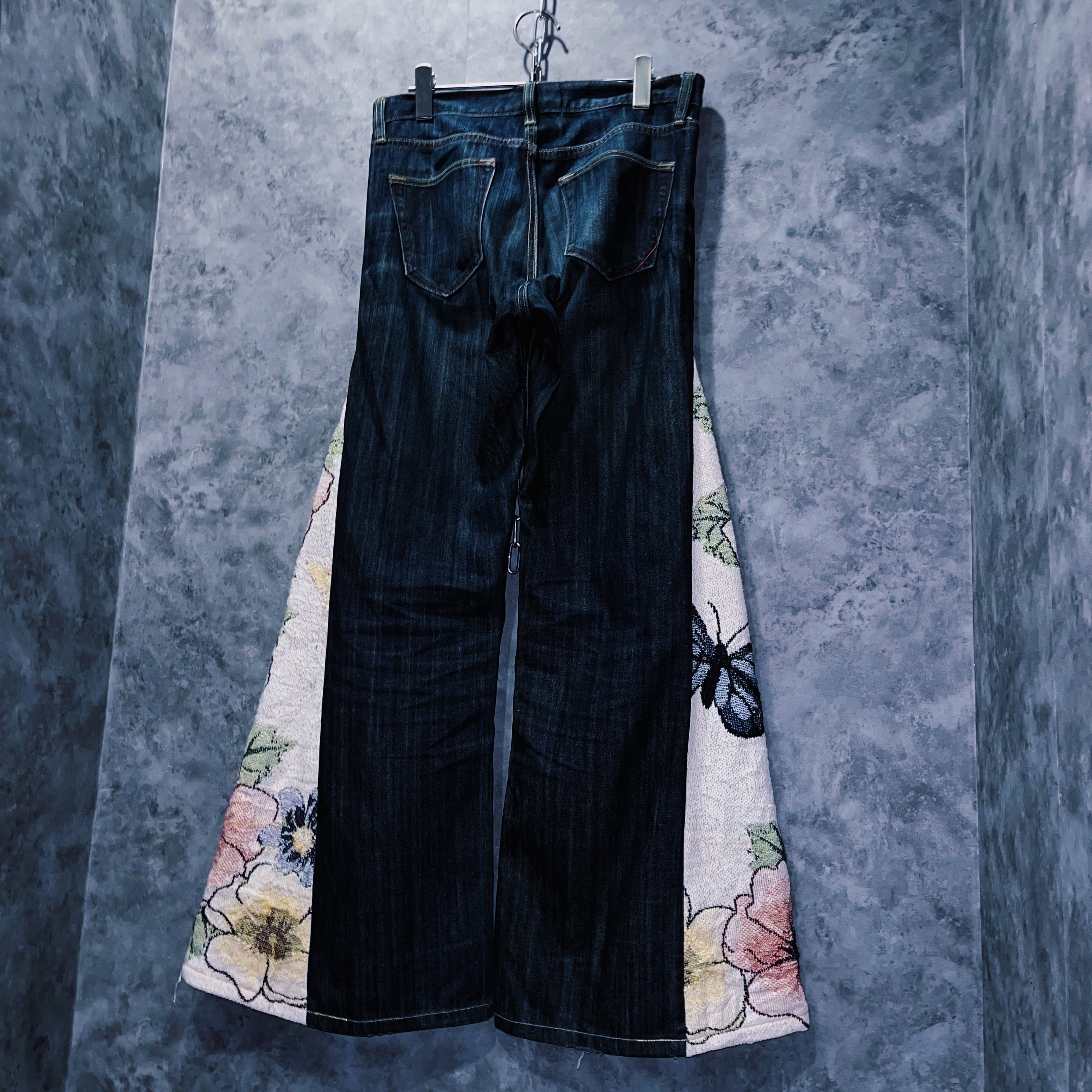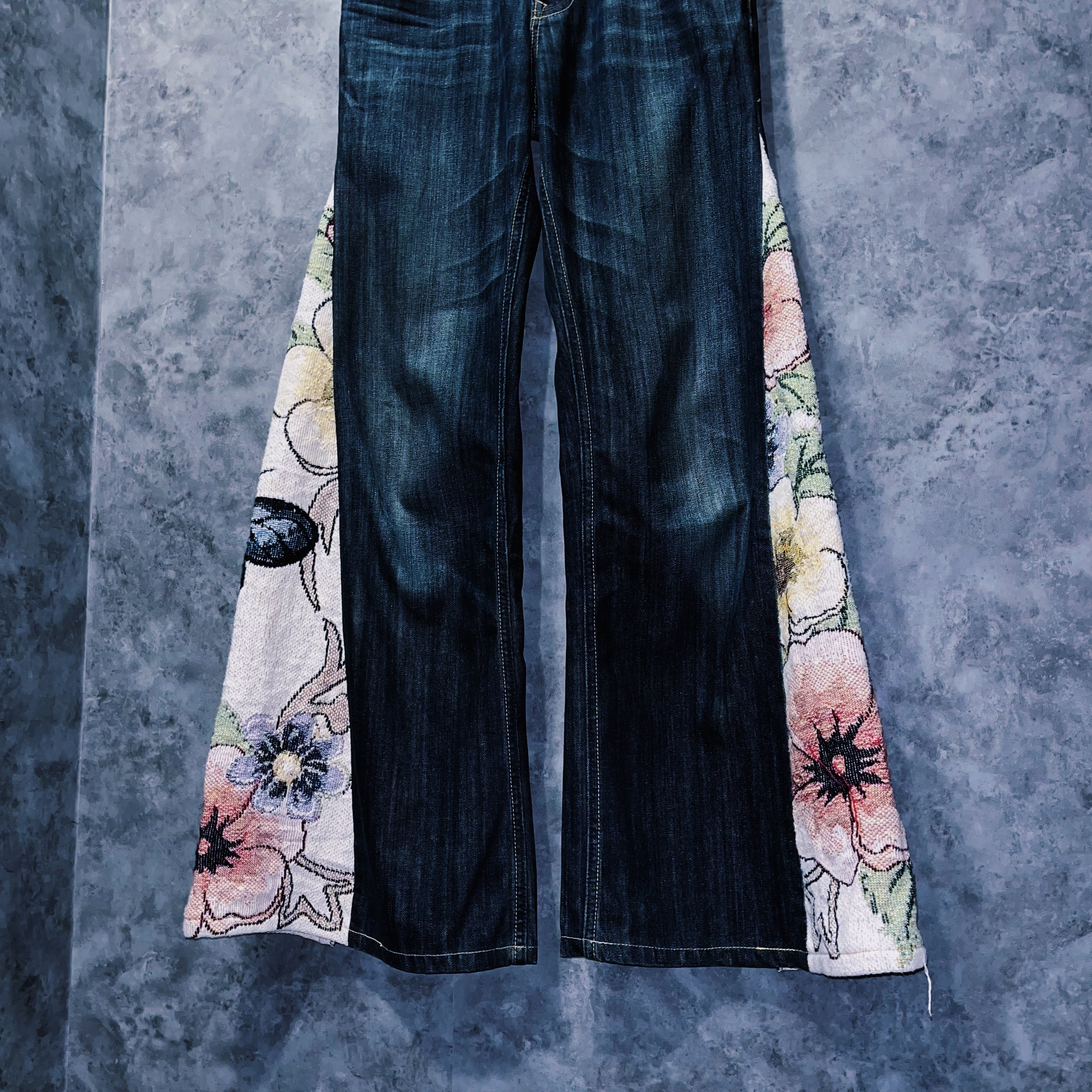 ローライズのデニムをベースに裾から新たにアンティークのユーロラグをパネル状に取り入れ極上のかつ美しいフレアシルエットに変えたフレアデニム。