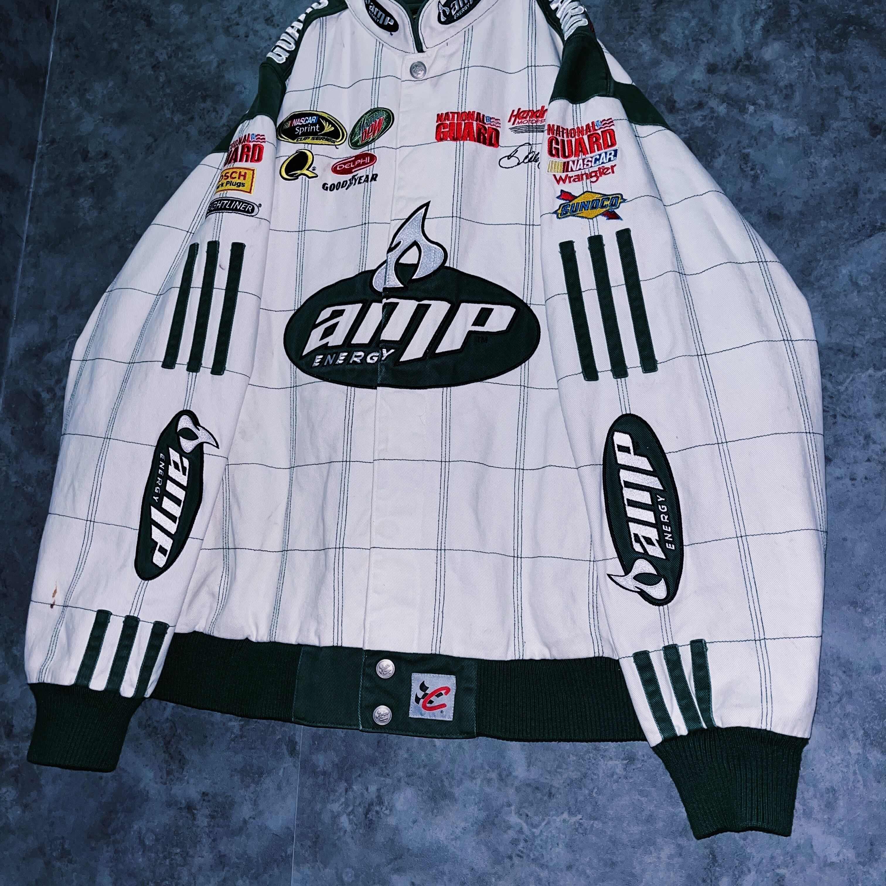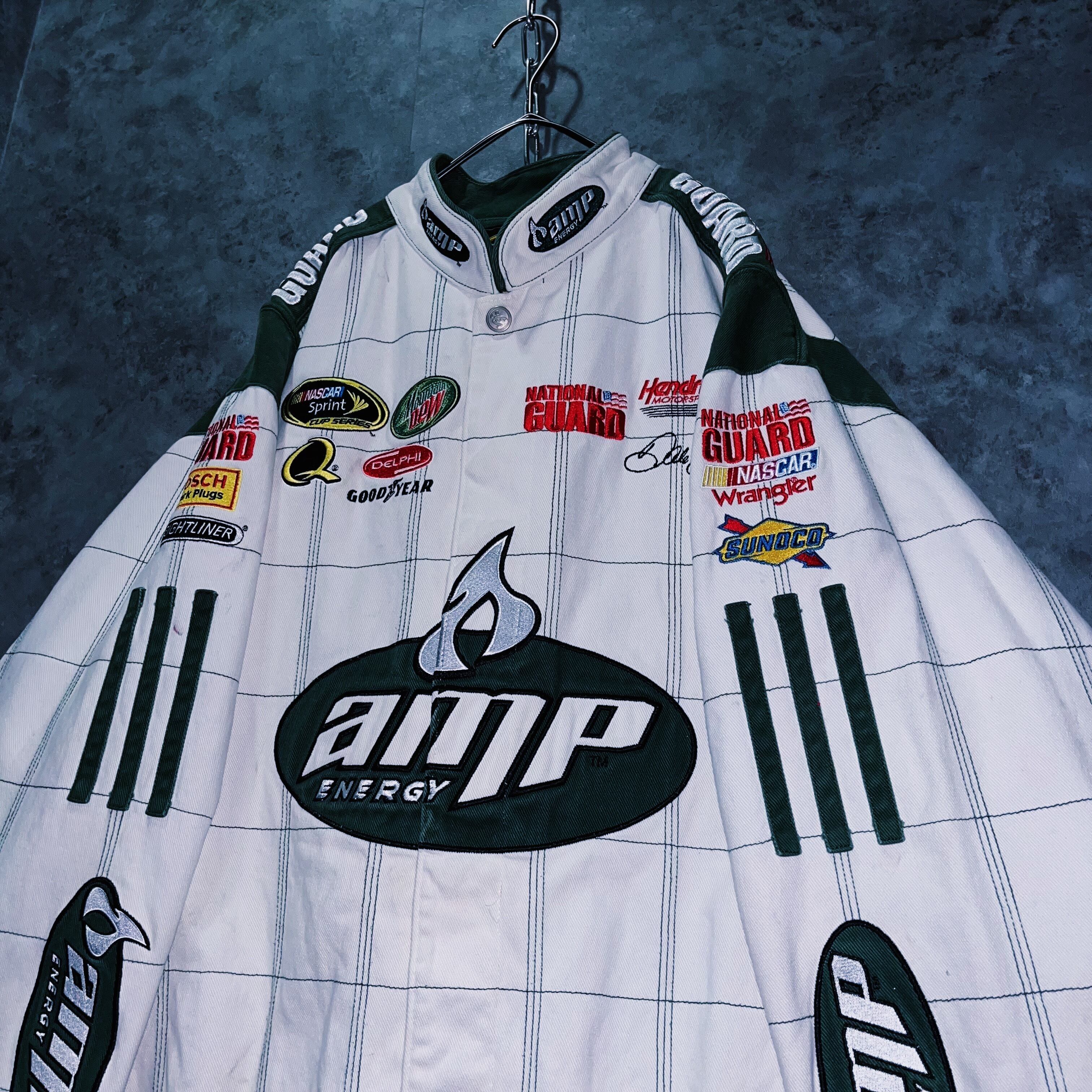 “Mountain Dew”や“NASCAR”をはじめとした様々な企業のパッチワークが施されたデザインの一枚。