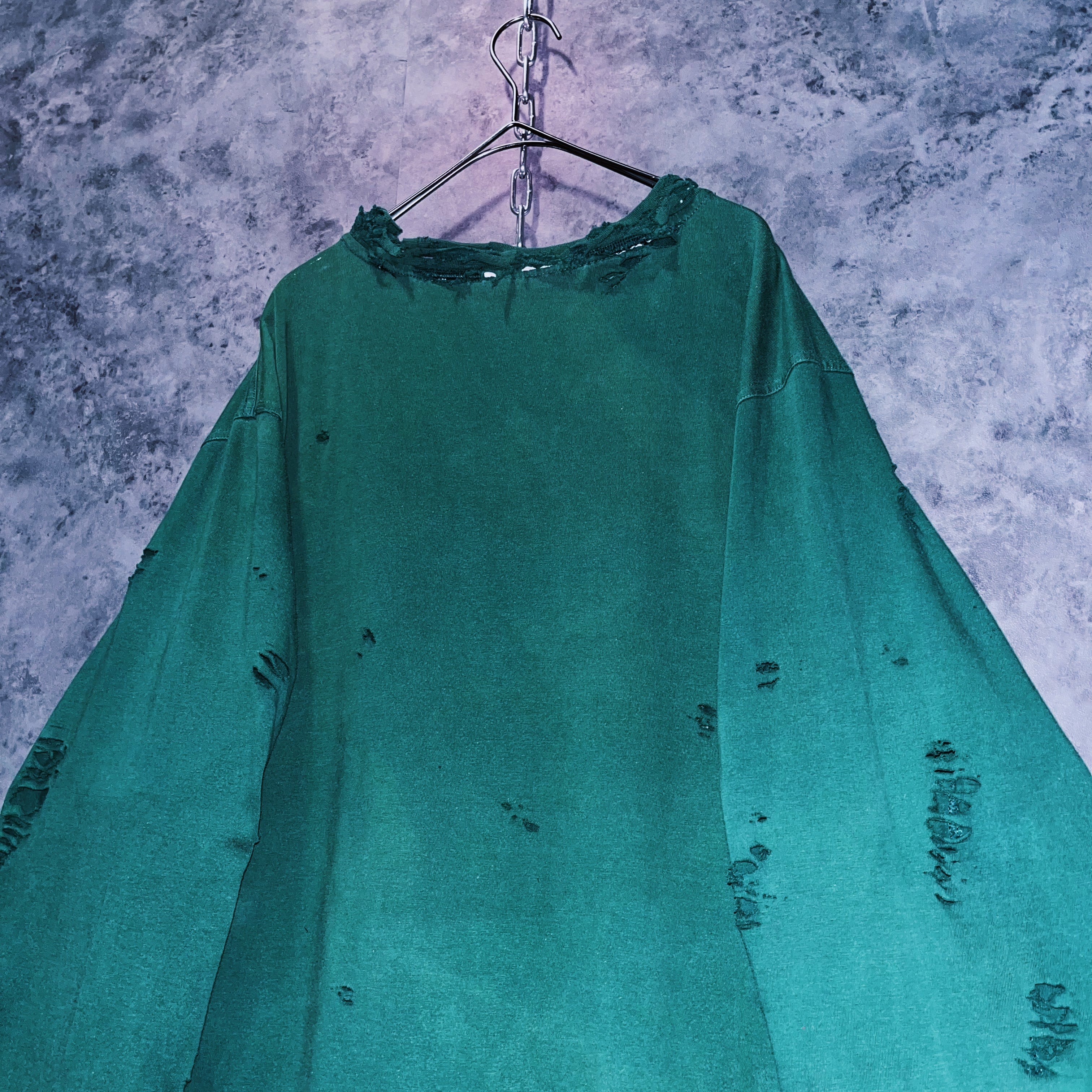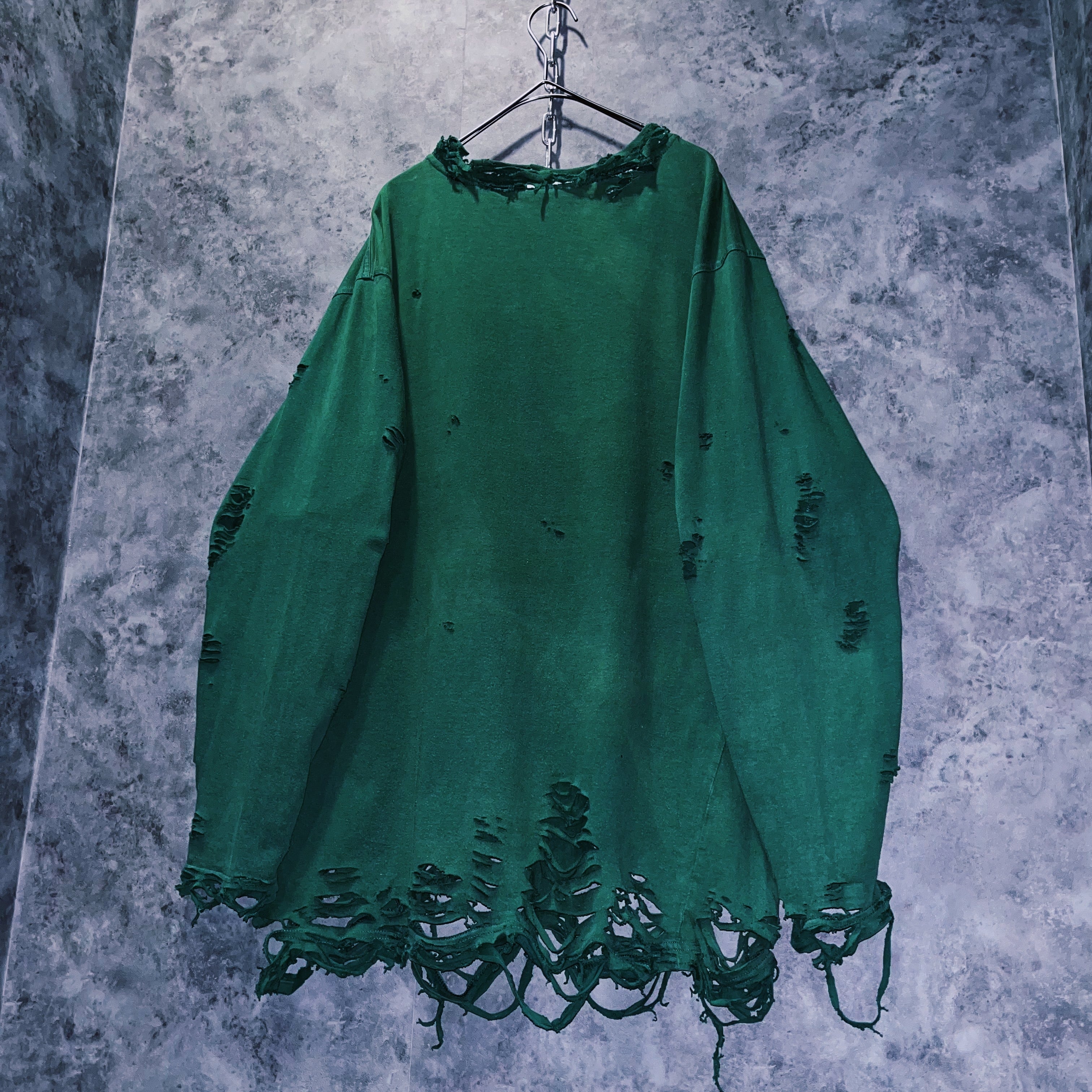 リブ中心に絶妙な加減で施されたダメージにオーバーなサイズ感がトレンドであるグランジ・ロック感も含んだ逸品。