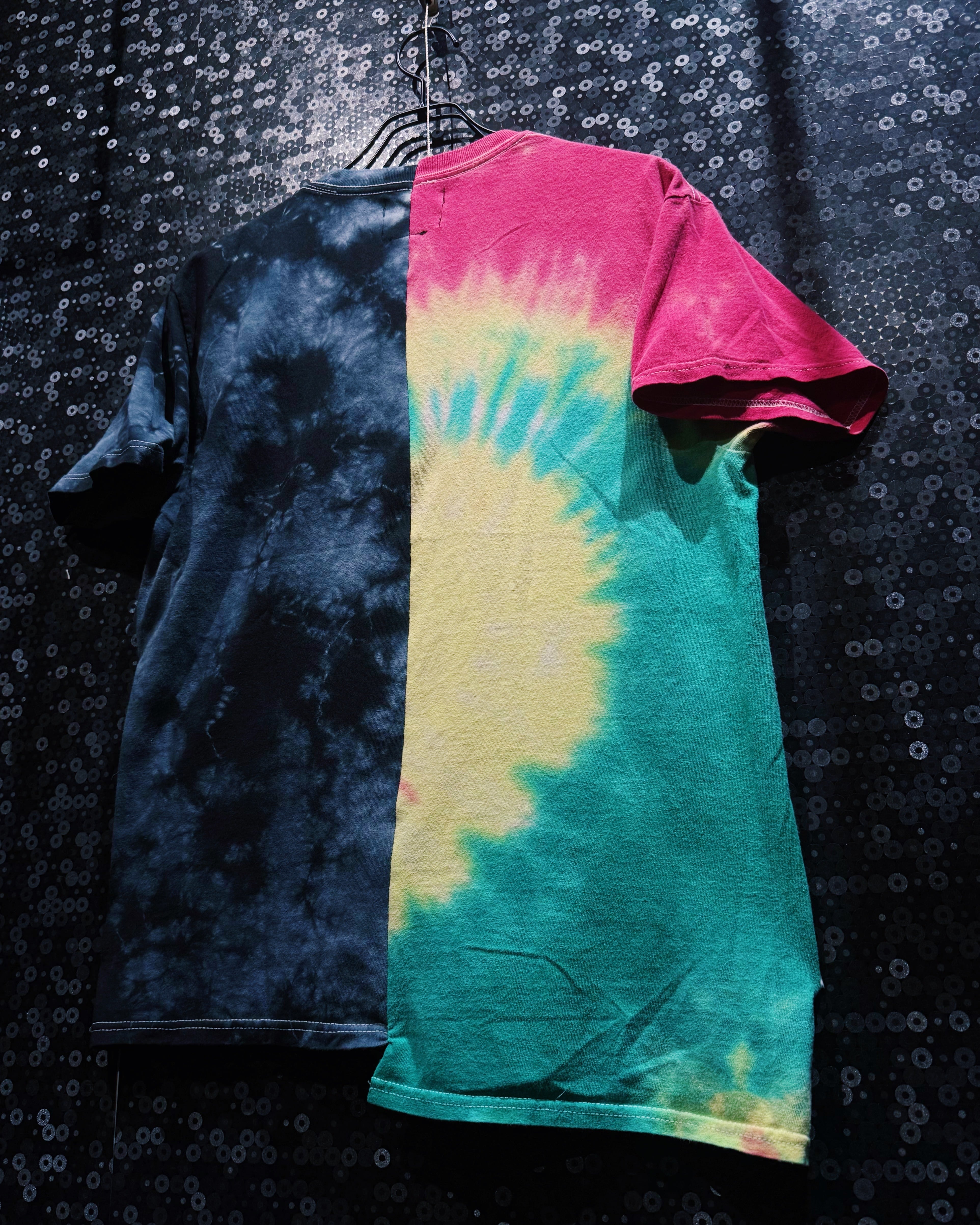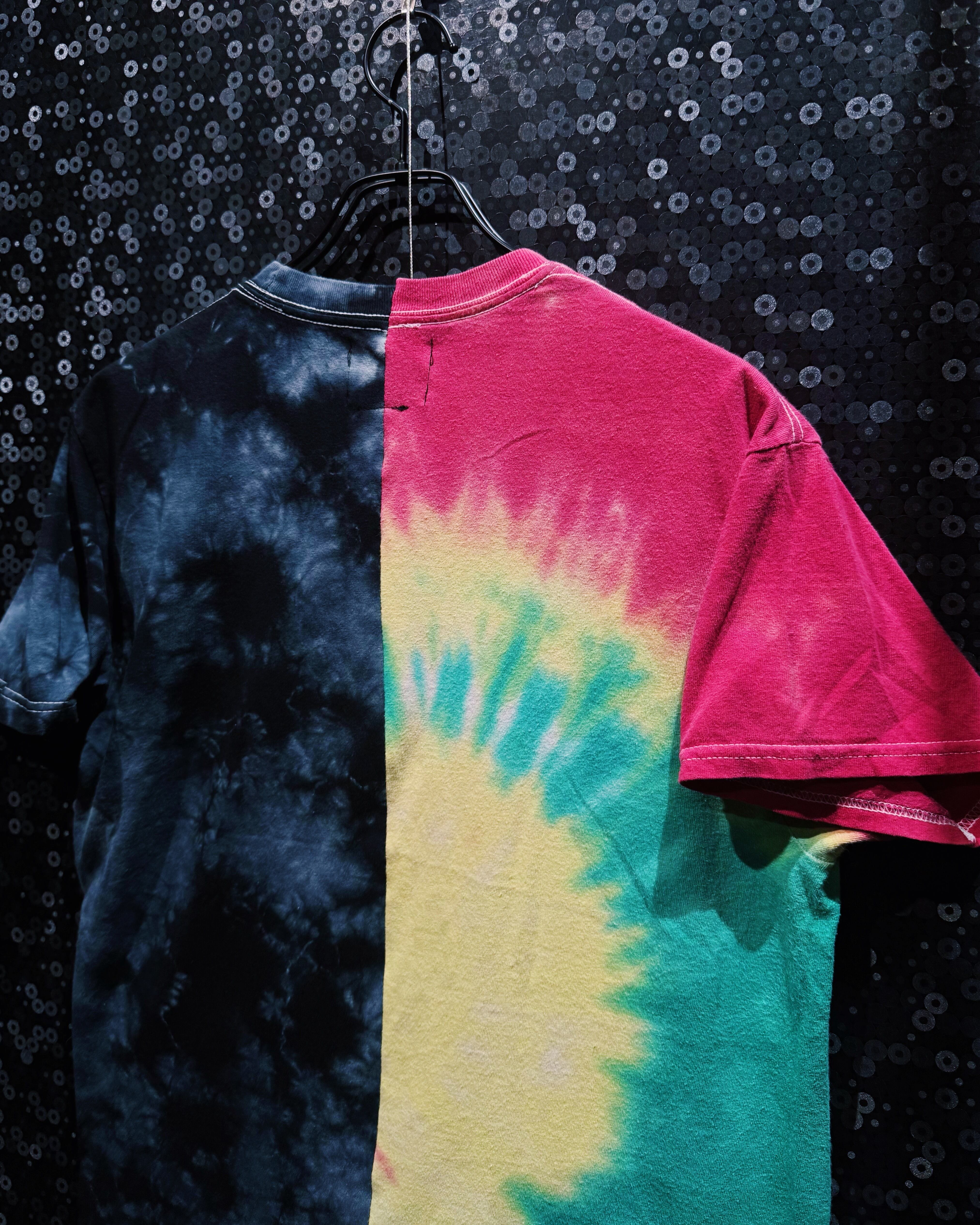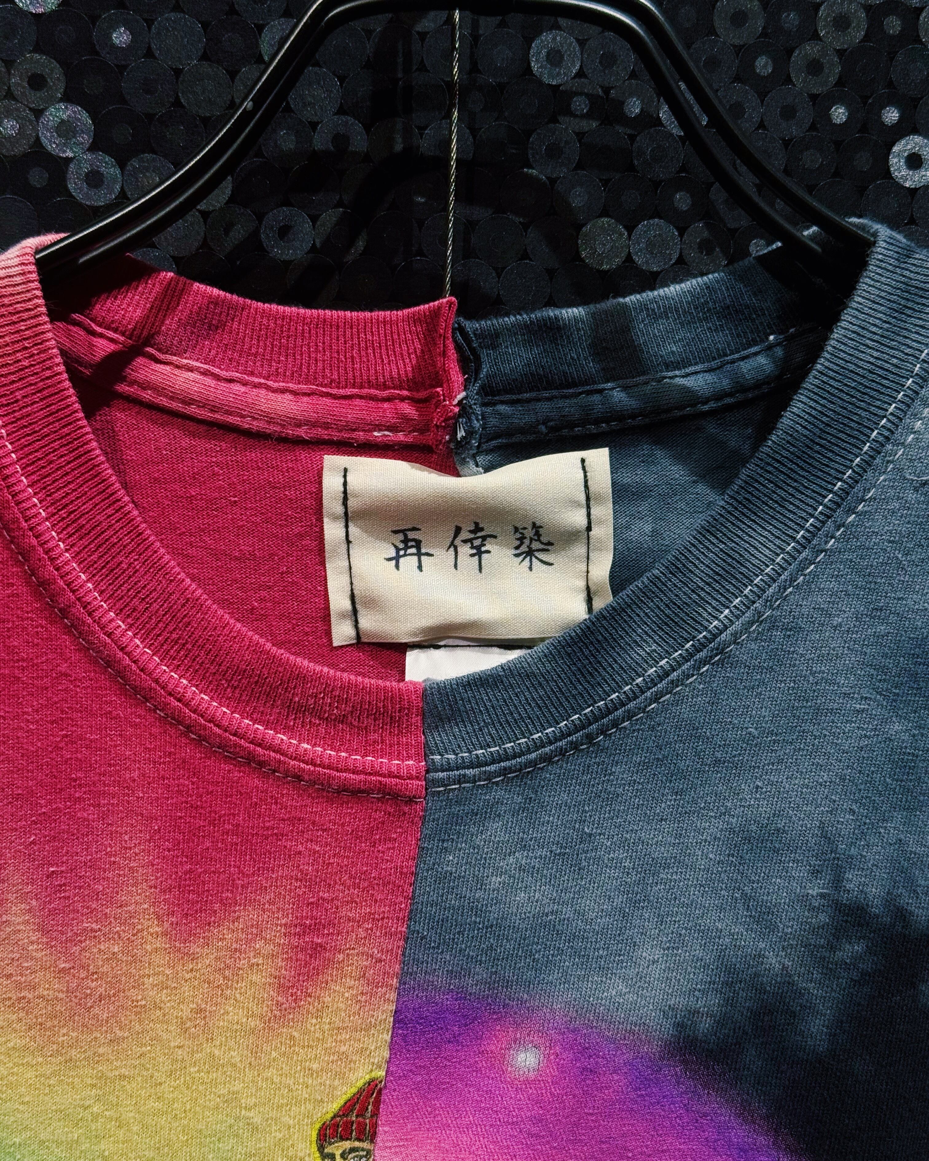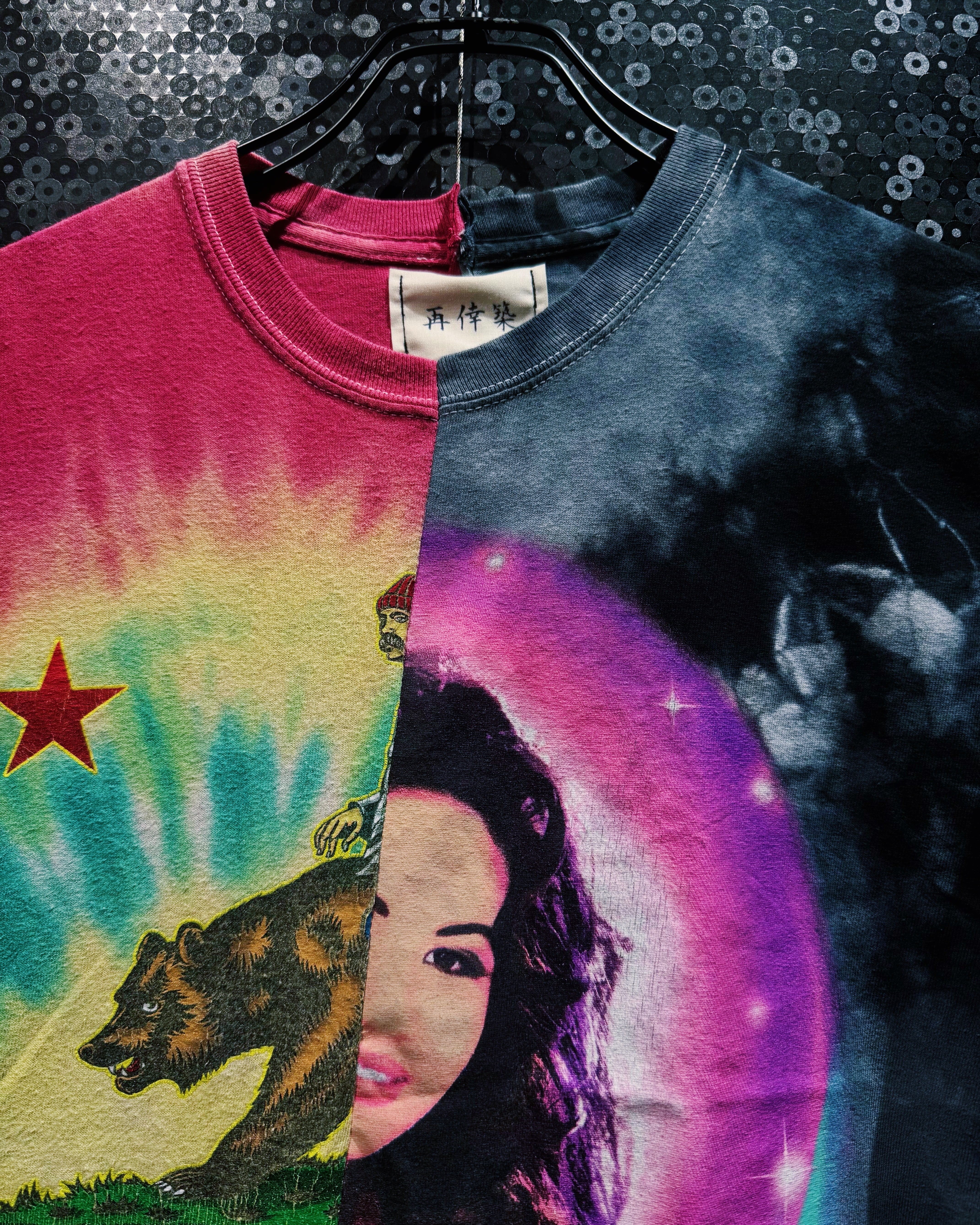 再倖築によるドッキングTシャツ。左右でまったく異なるカルチャーを背負ったグラフィックを一着に縫い合わせることで、新しい文脈を生み出している。左身頃はタイダイ染めを背景に、カリフォルニア州旗をモチーフとした「CHEECH」プリント。