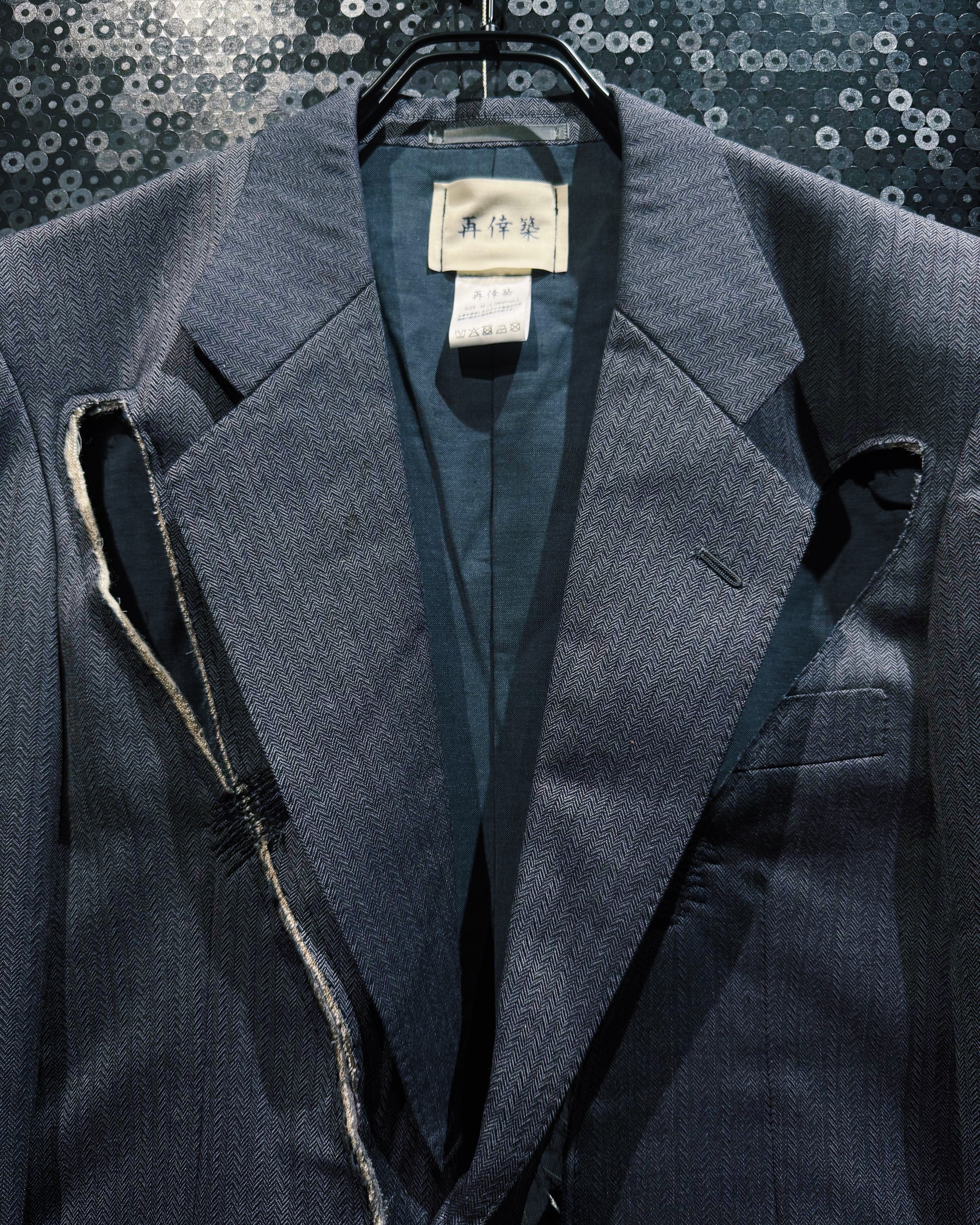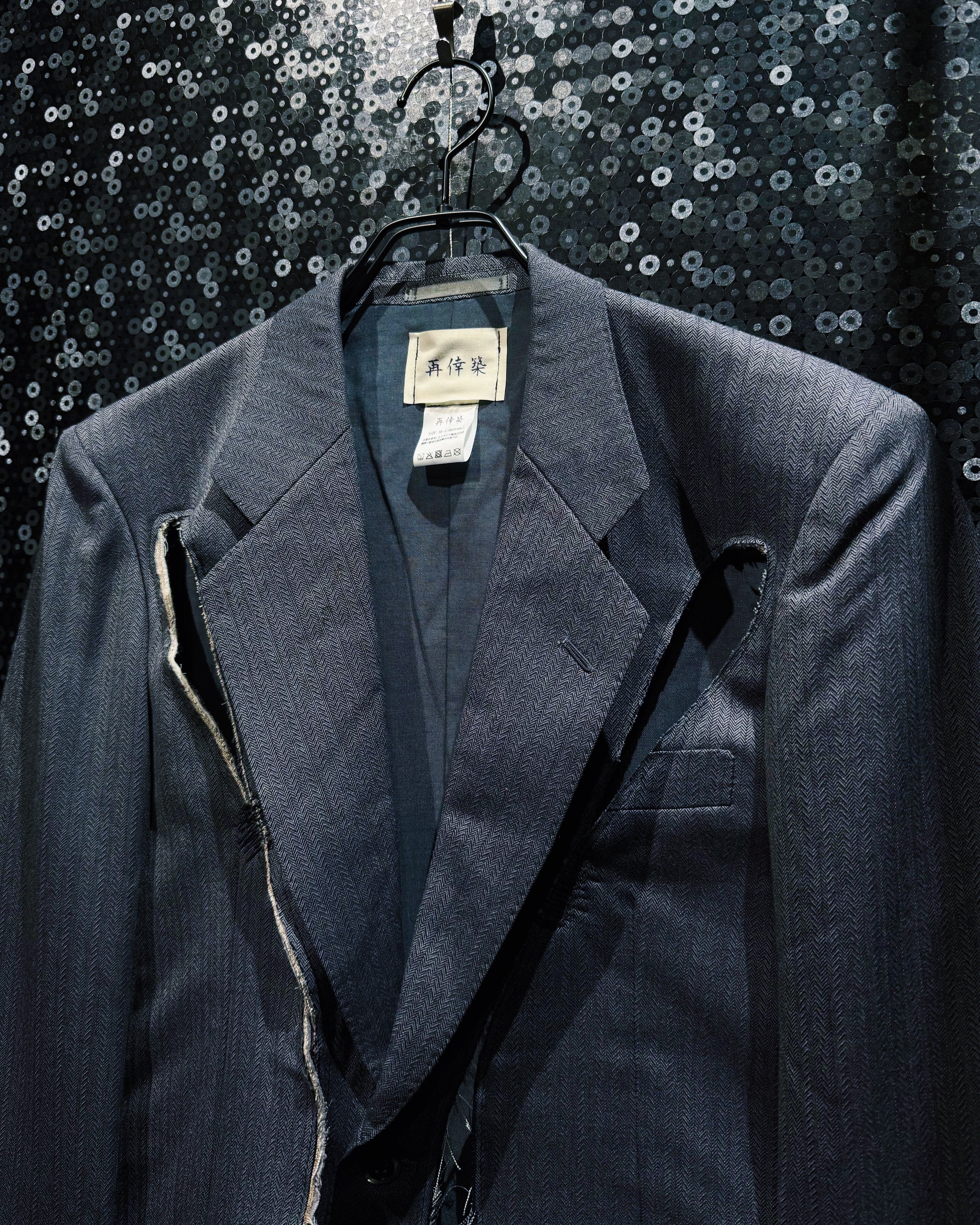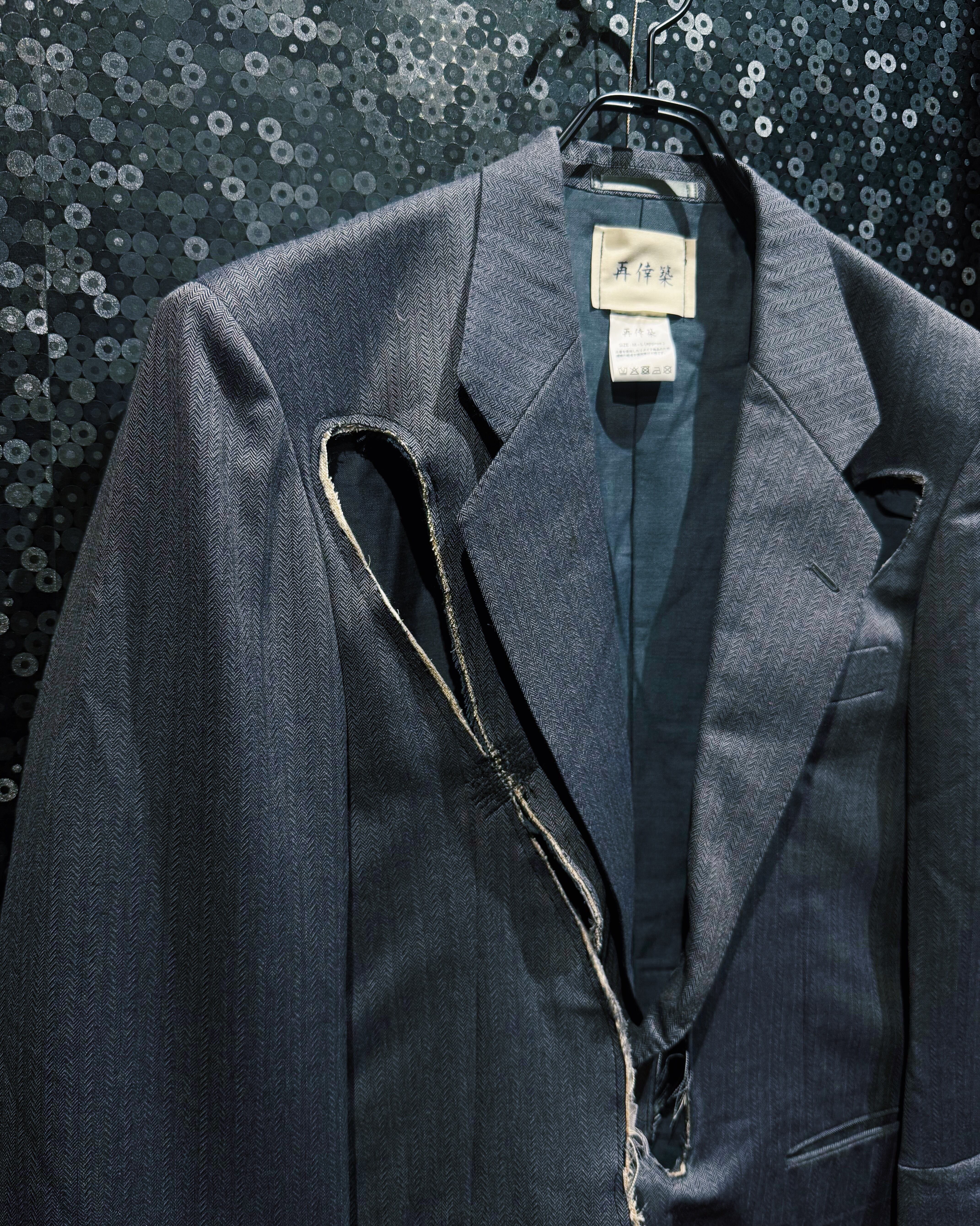 クラシックなヘリンボーン柄のスーツ地をベースにしながら、ラペルからフロントにかけて大胆にカットを施し、まるで「穴ぼこ」が空いたような解体的デザインを表現。