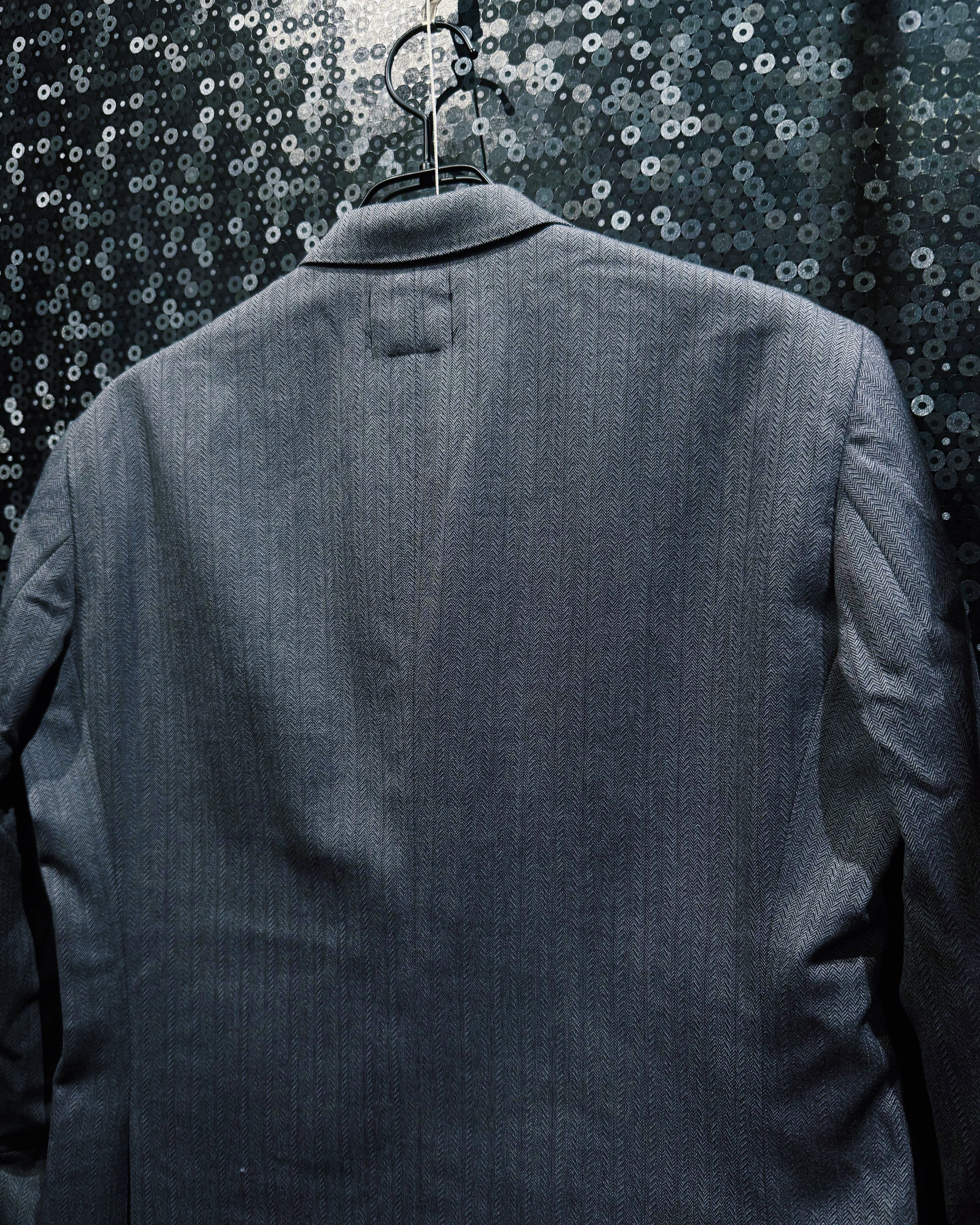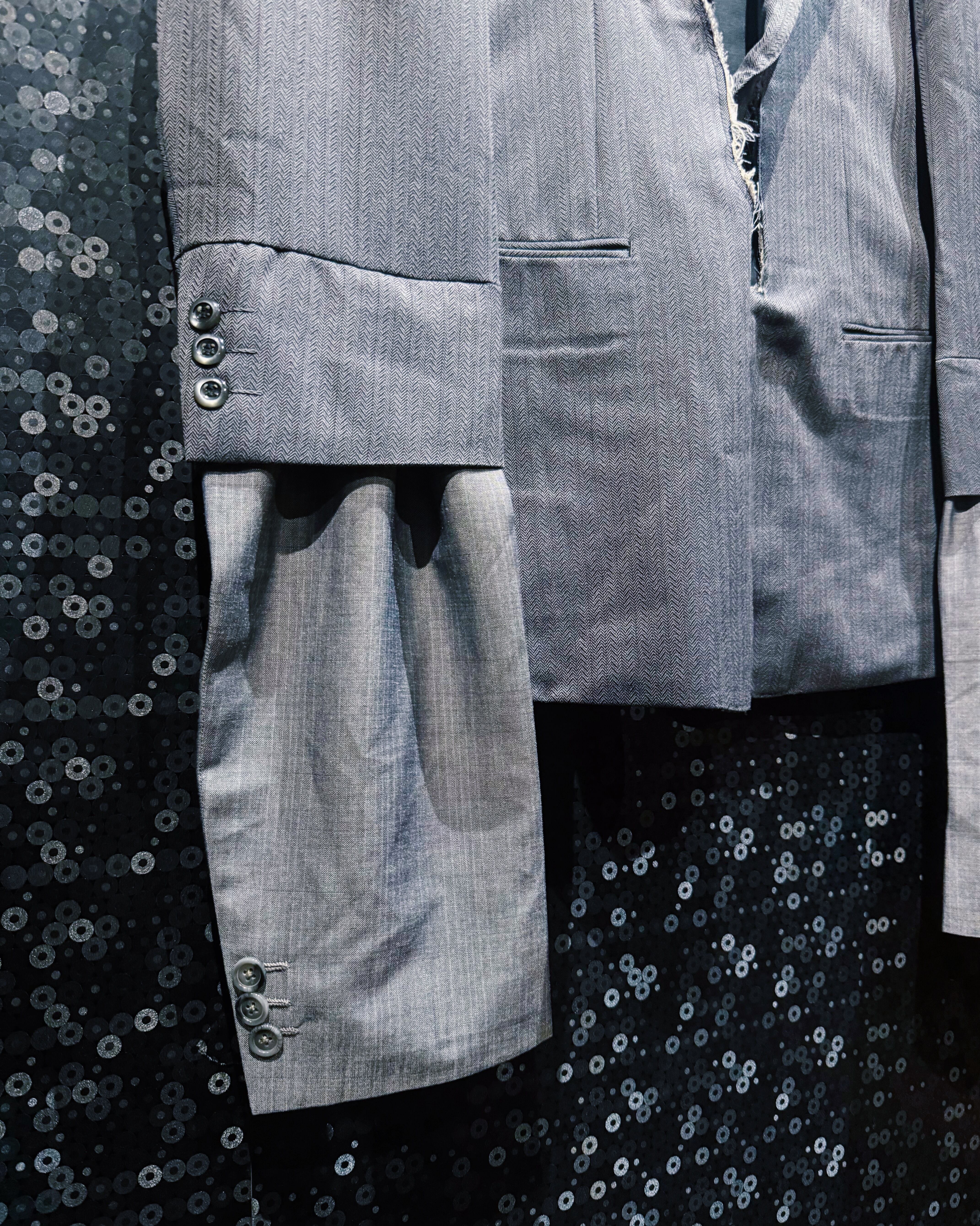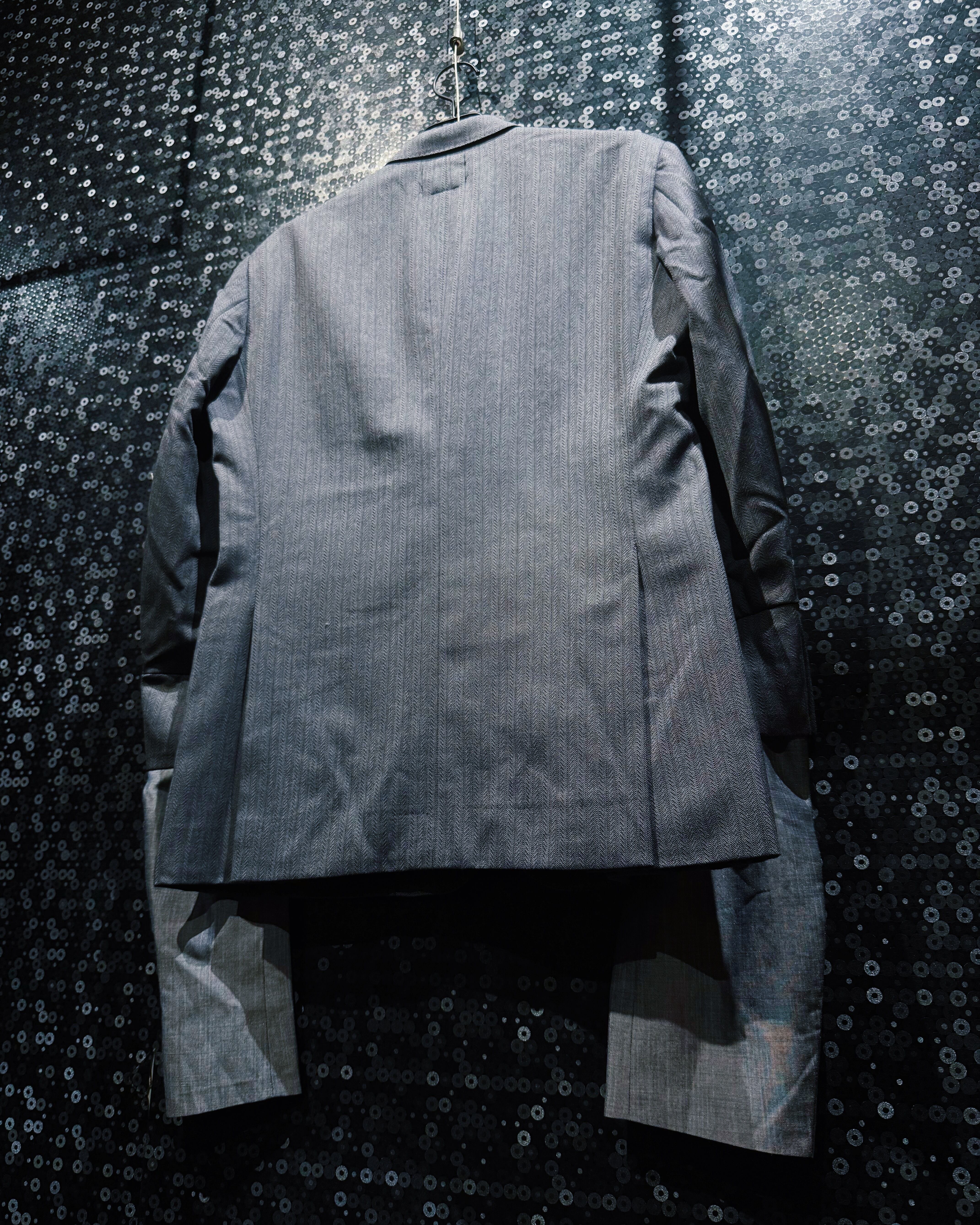 クラシックなヘリンボーン柄のスーツ地をベースにしながら、ラペルからフロントにかけて大胆にカットを施し、まるで「穴ぼこ」が空いたような解体的デザインを表現。