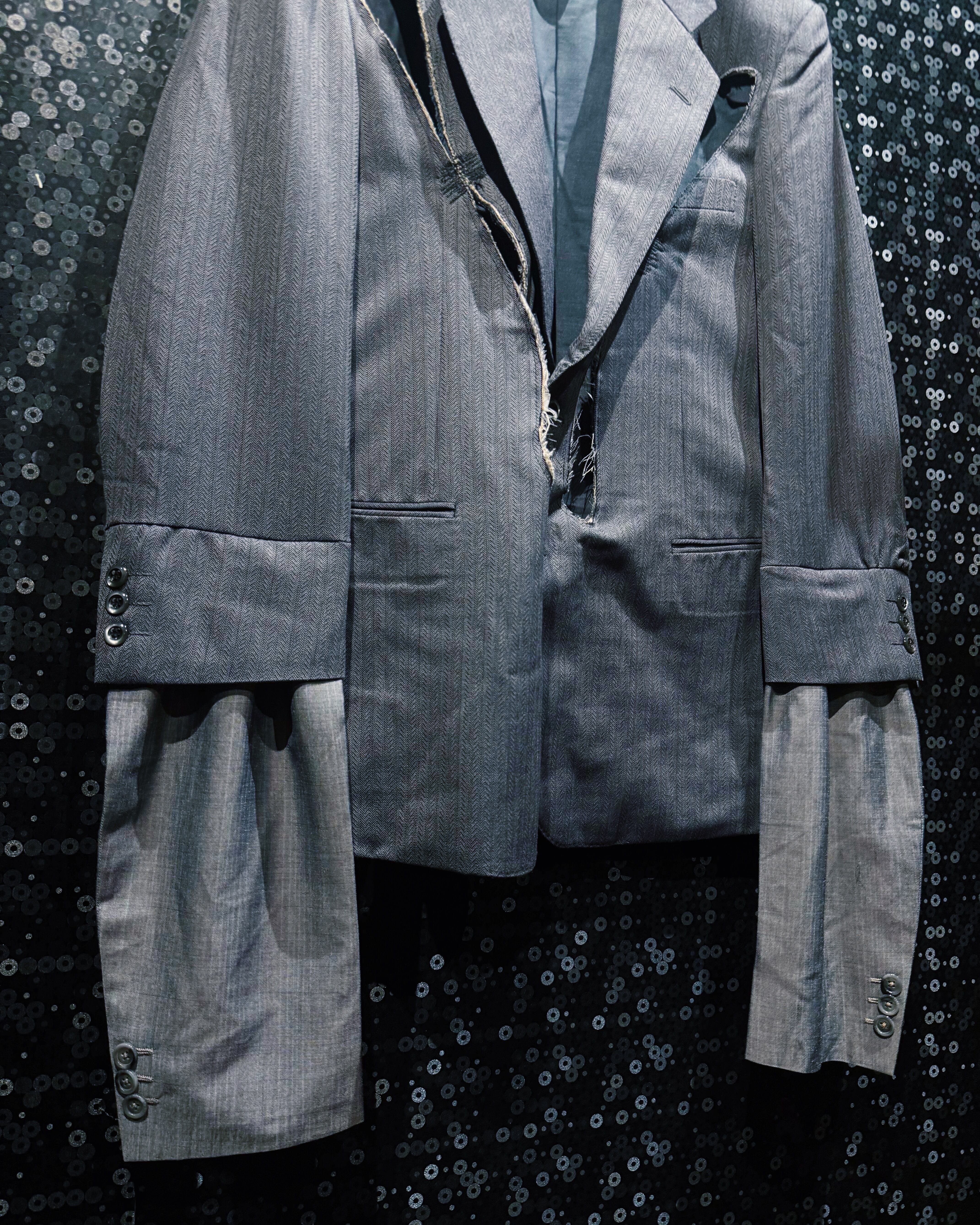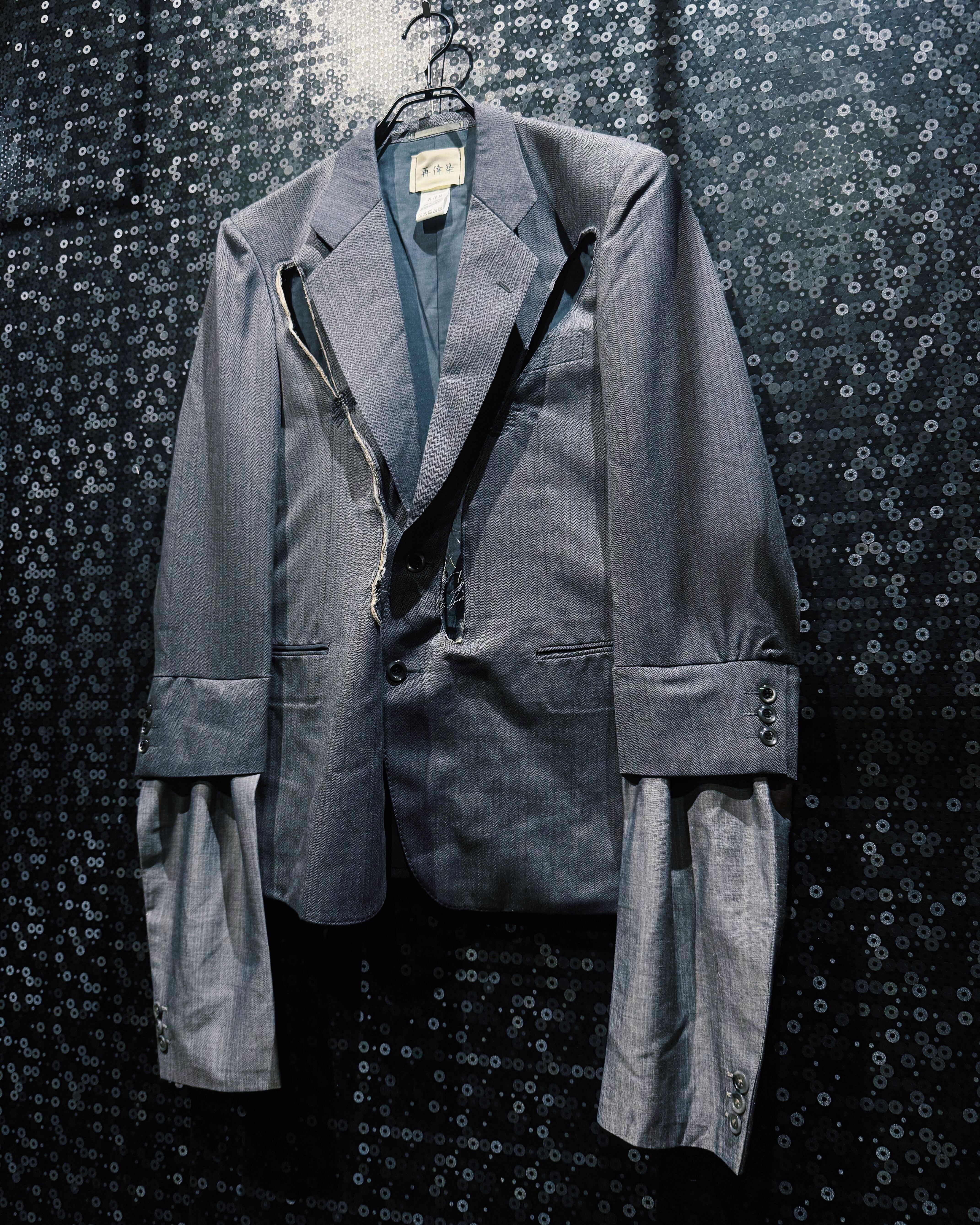さらにスリーブ部分は既存の袖を延長するようにレイヤードされ、異様に長いシルエットを描き出している。フォーマルさの象徴であるテーラードをあえて崩壊させ、未完成のようでいて完成された独自のバランスに落とし込むのが再倖築の真骨頂。