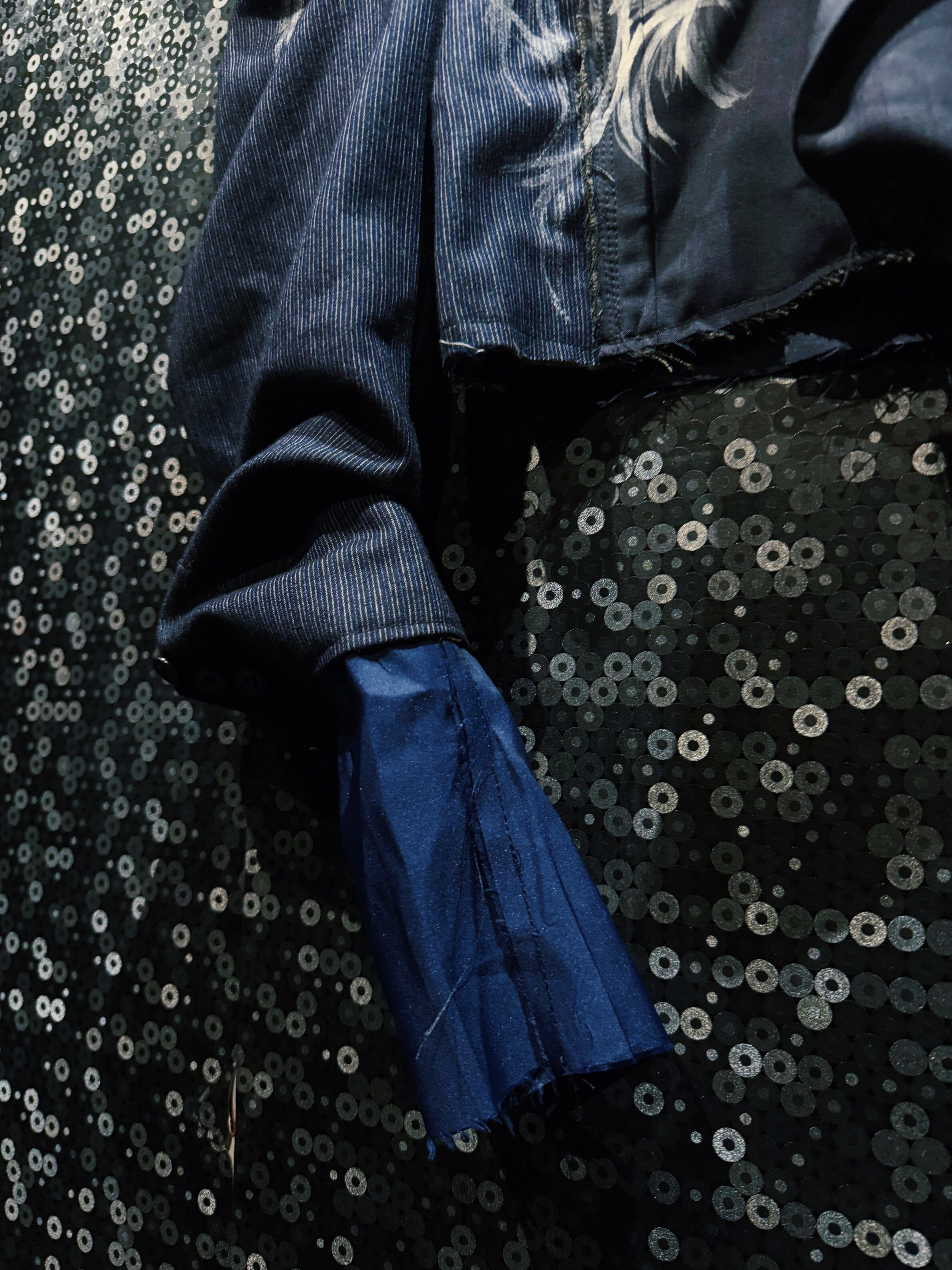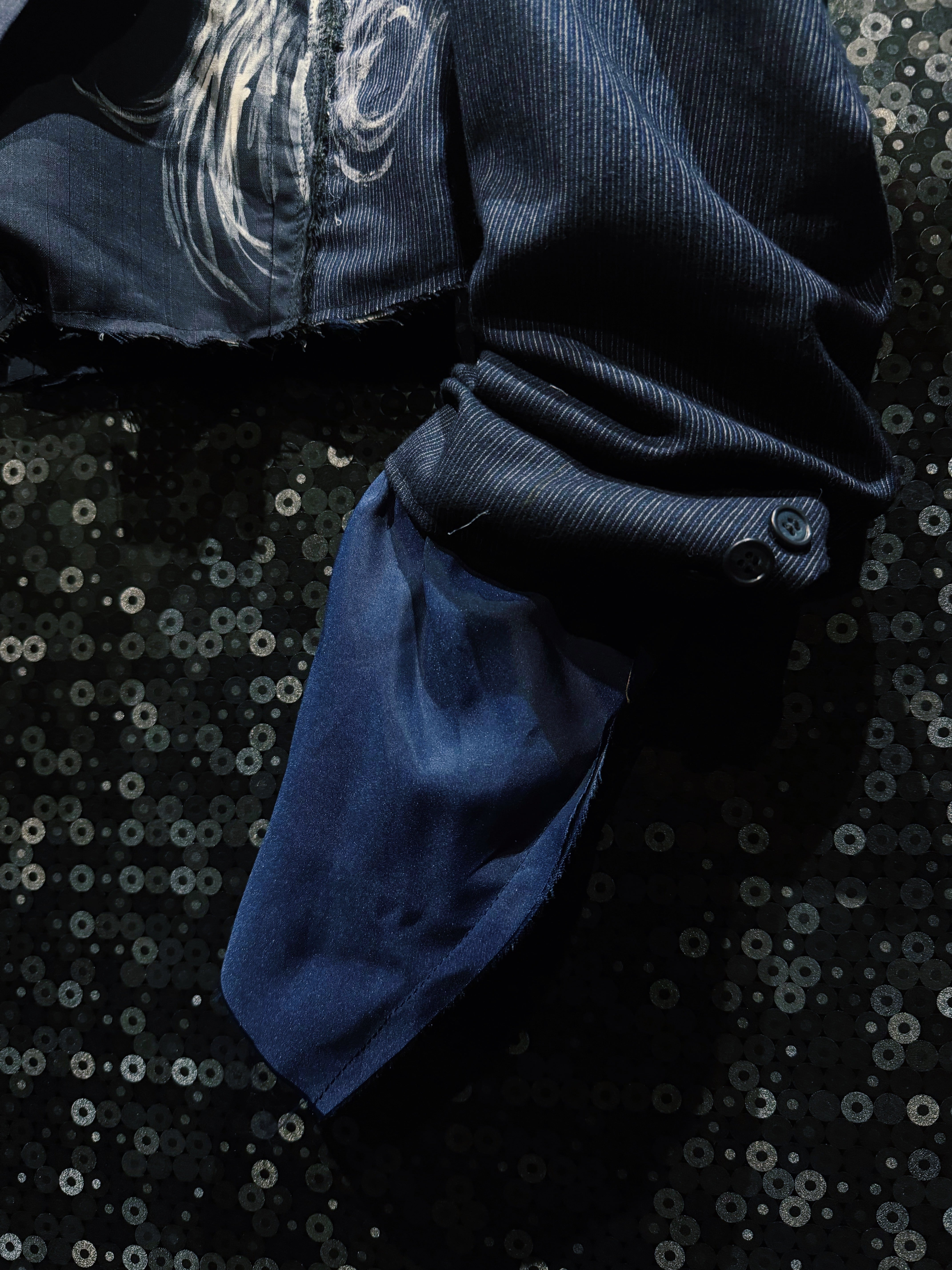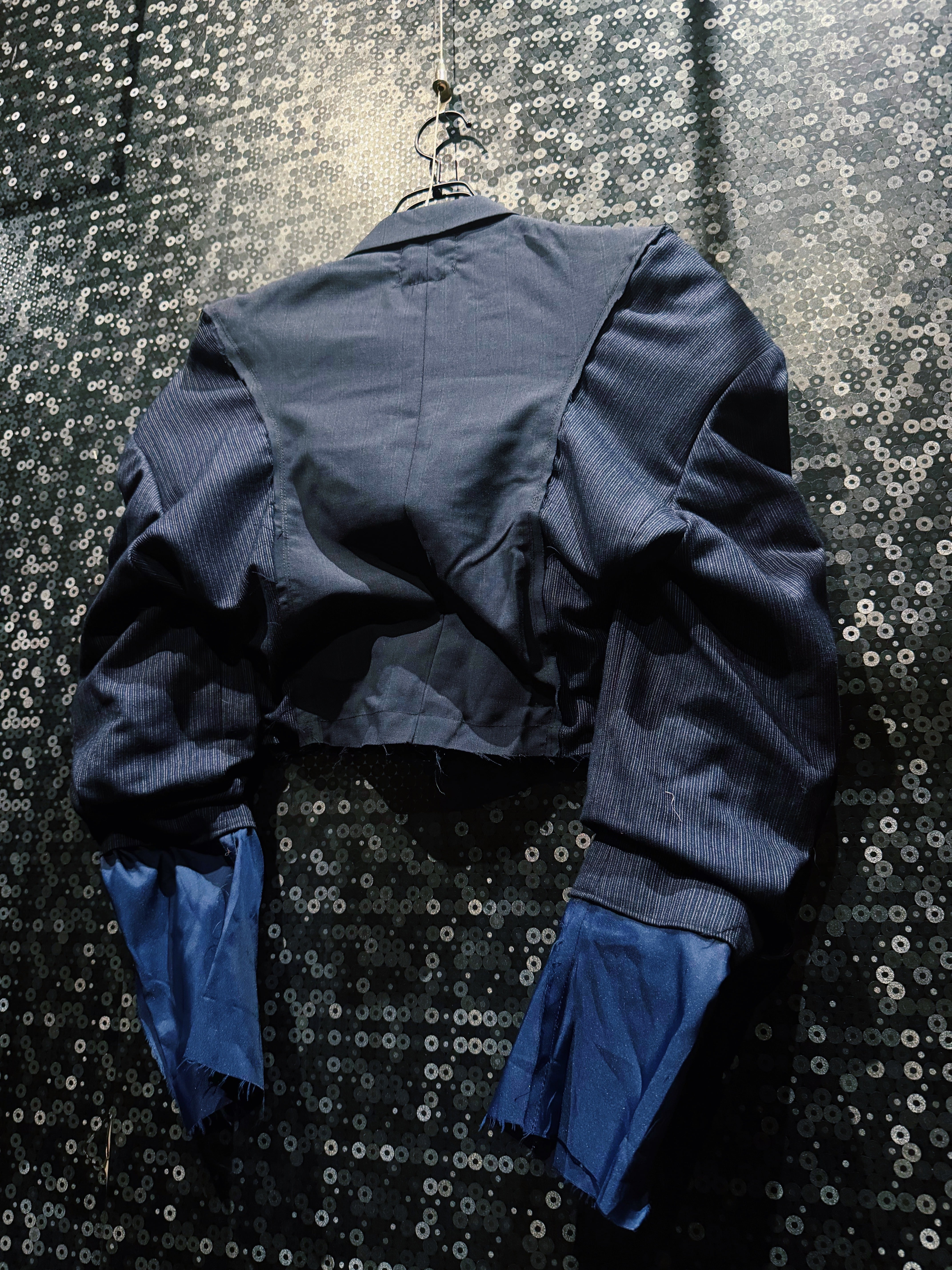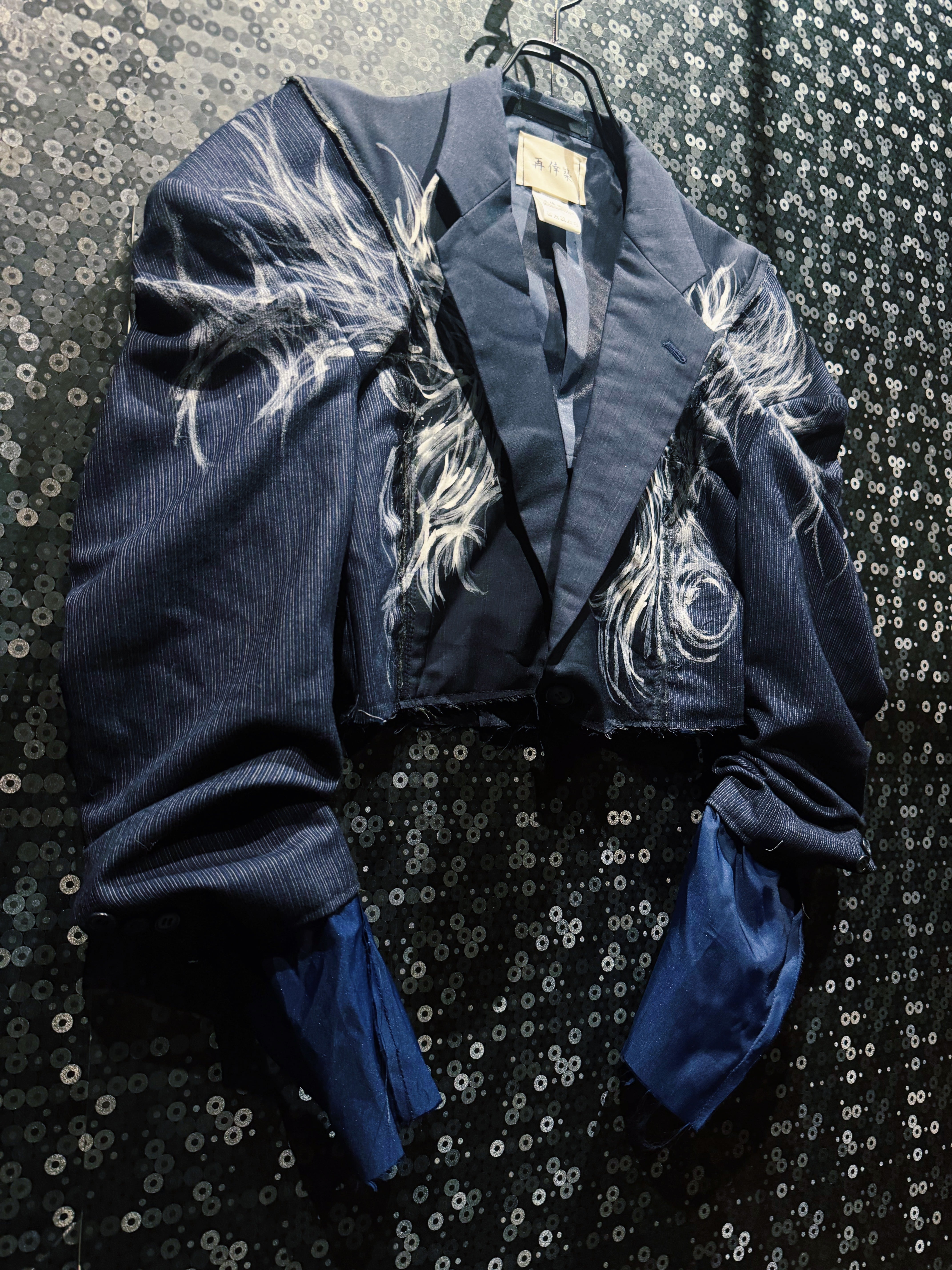裾はクロップド丈に再構築され、端を断ち切りにすることでラフで前衛的なムードを強調。スリーブはオリジナルの長さを活かしつつ、レイヤード感を強調した再構築仕様になっており、クラシックなテーラードとアバンギャルドなアート性が融合した仕上がりとなっている。