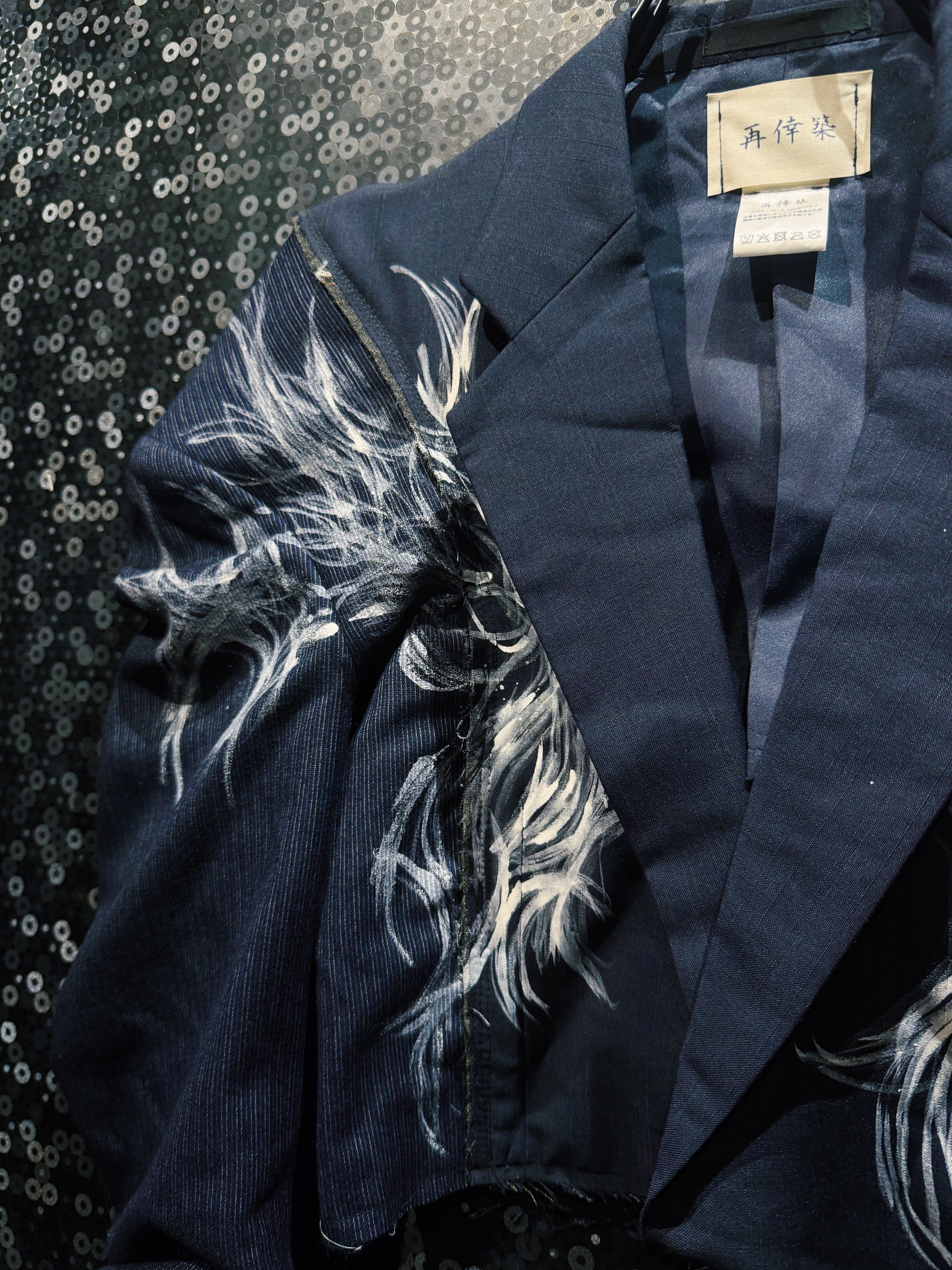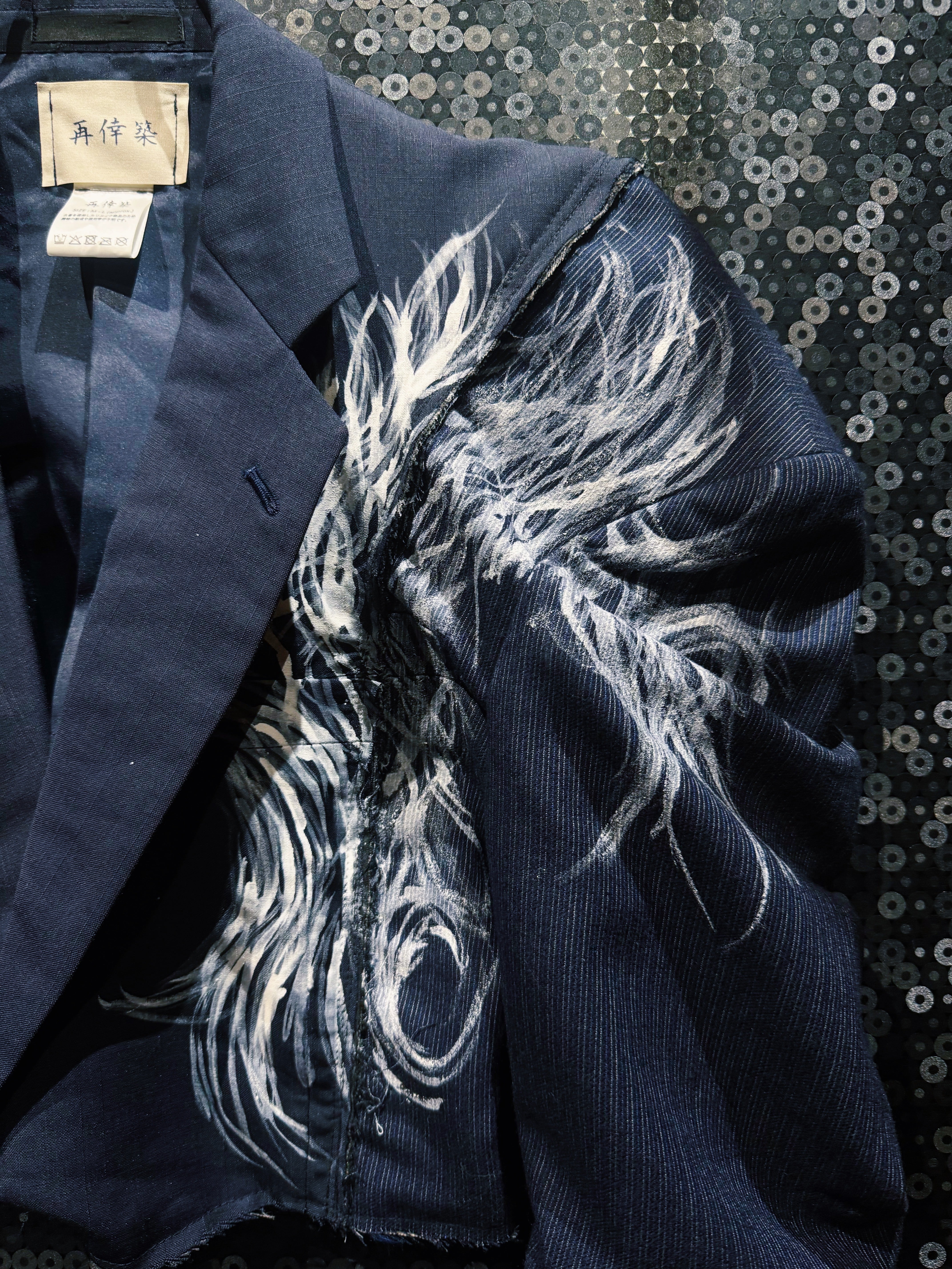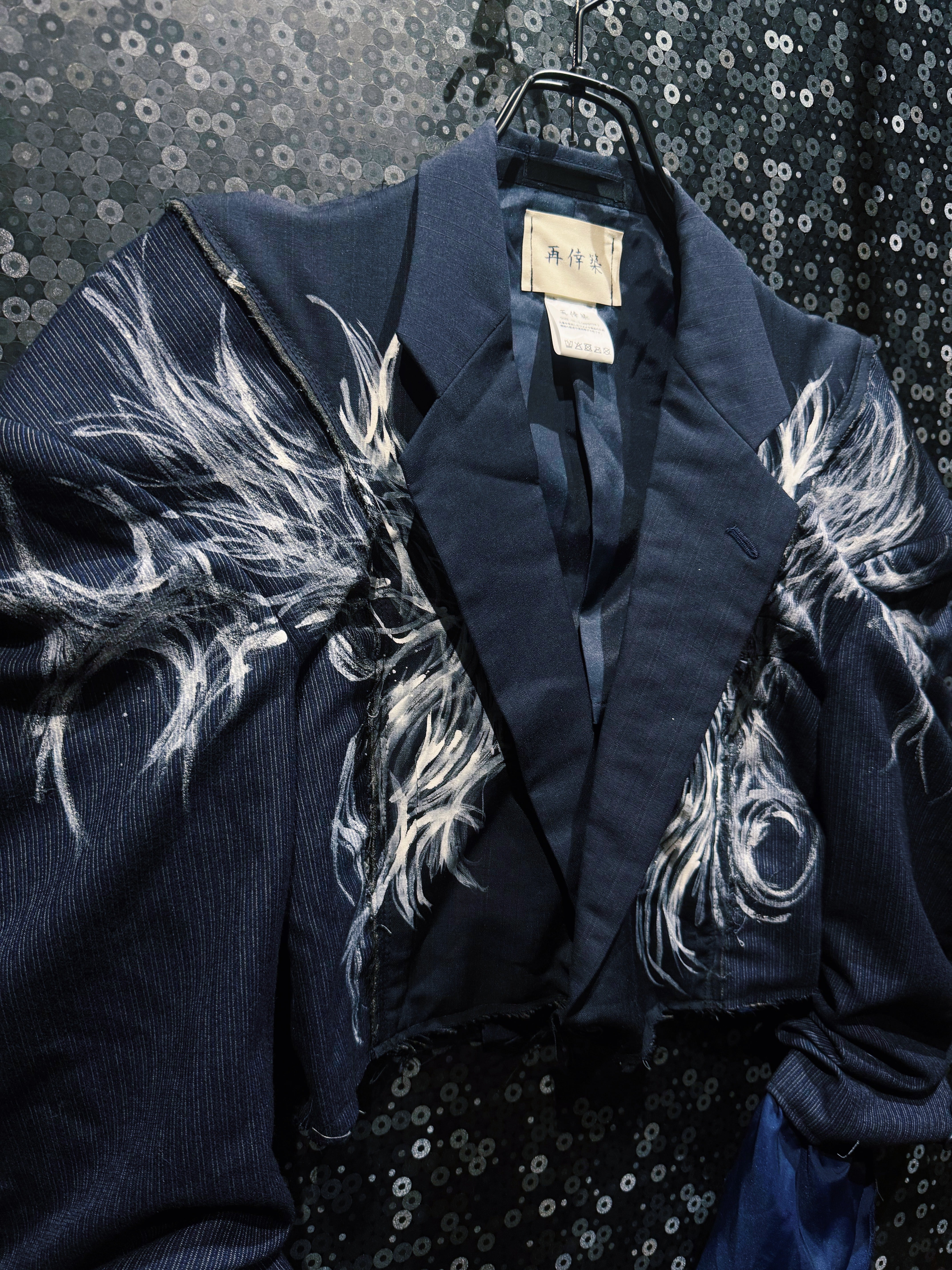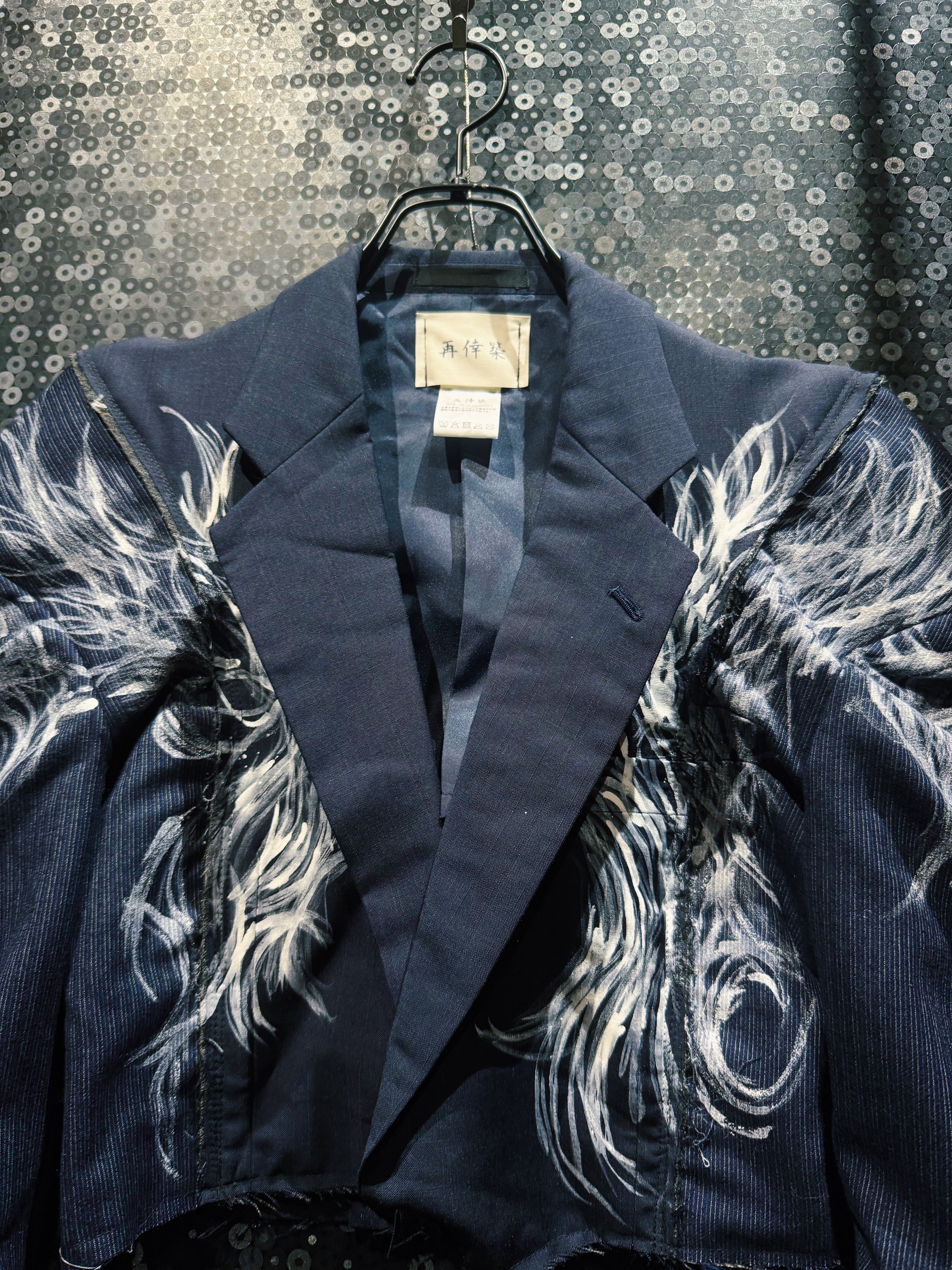 フォーマルなジャケットの枠を越え、アートピースとしても成立する再倖築ならではの一点物。