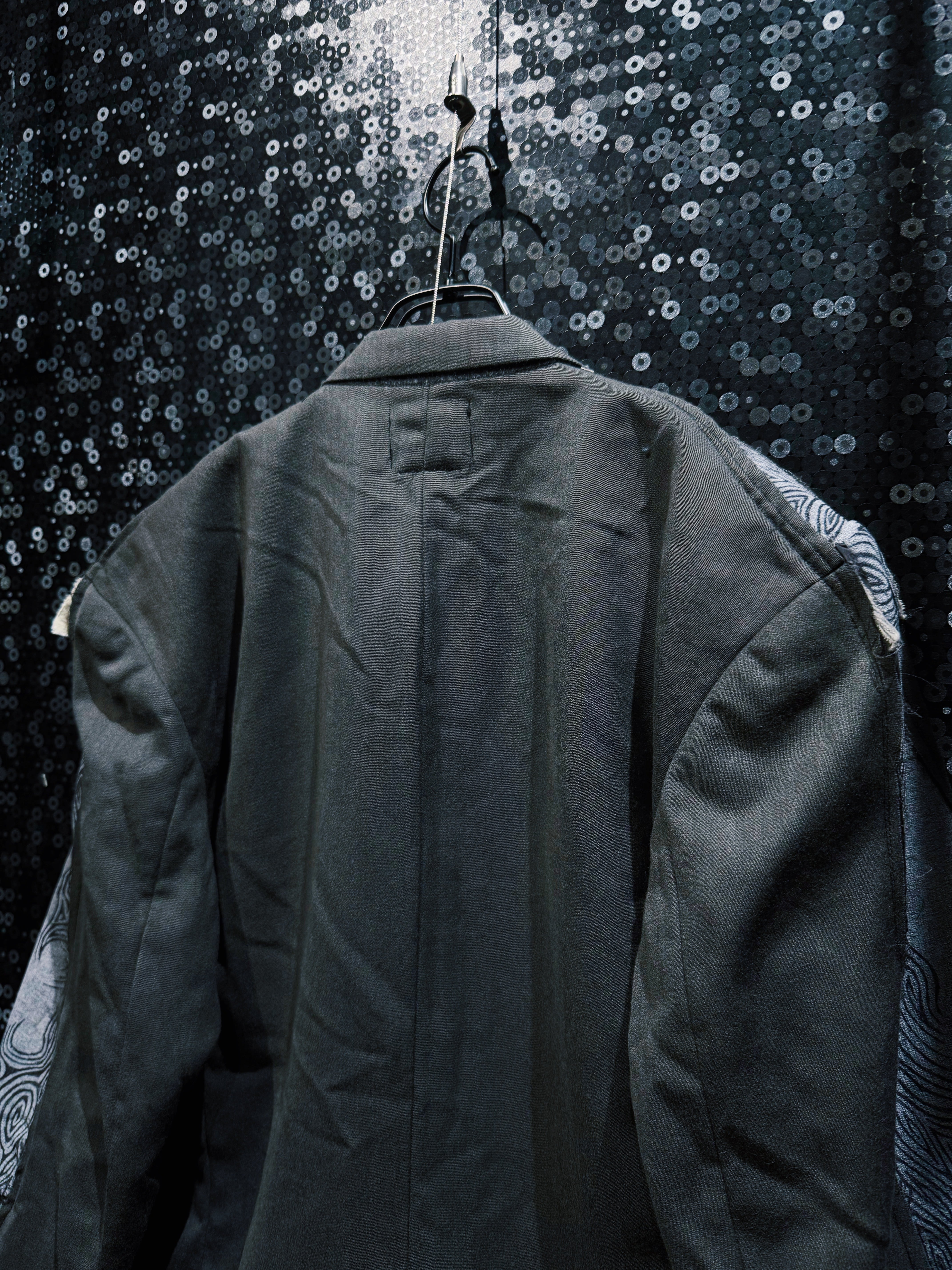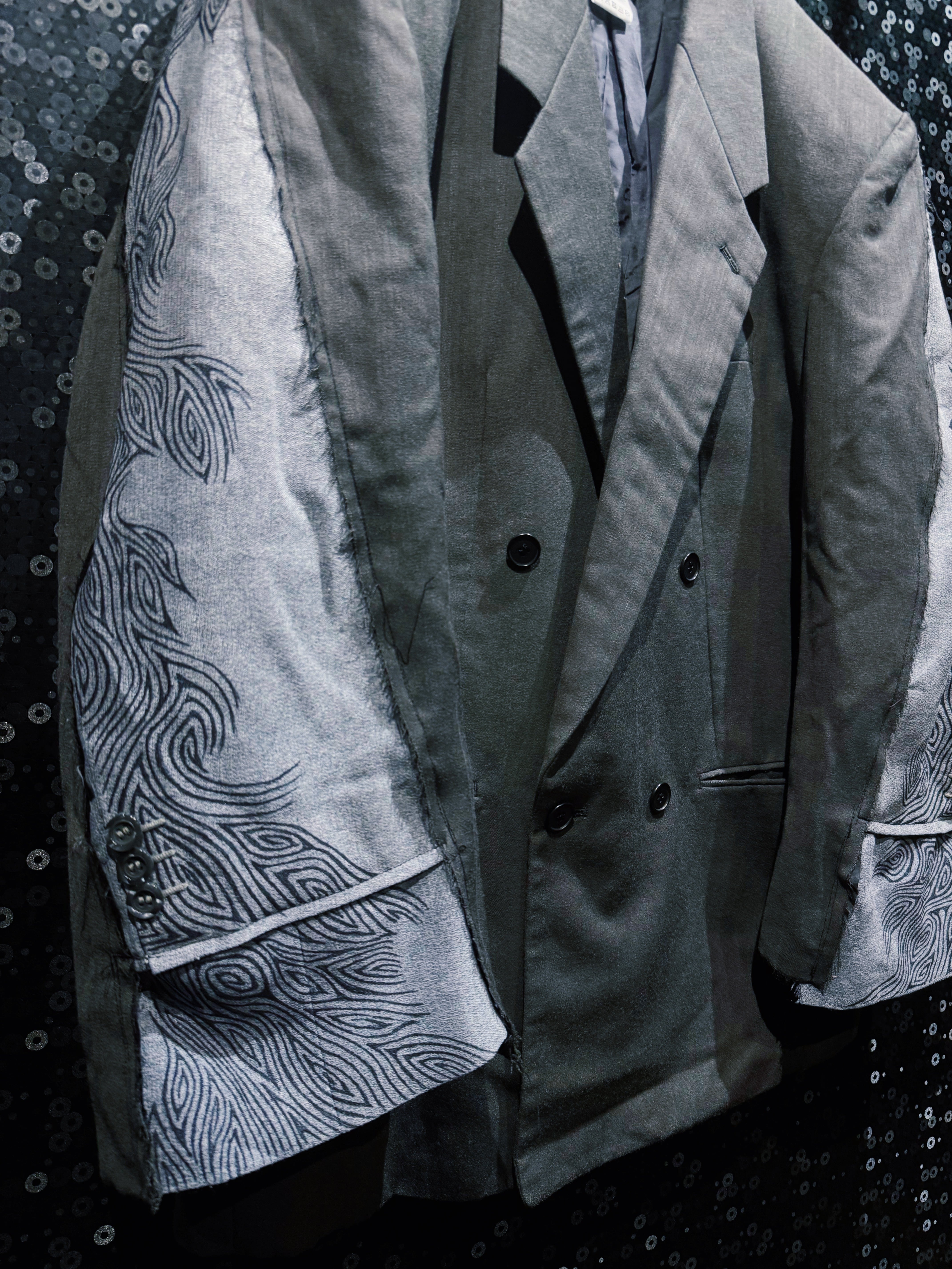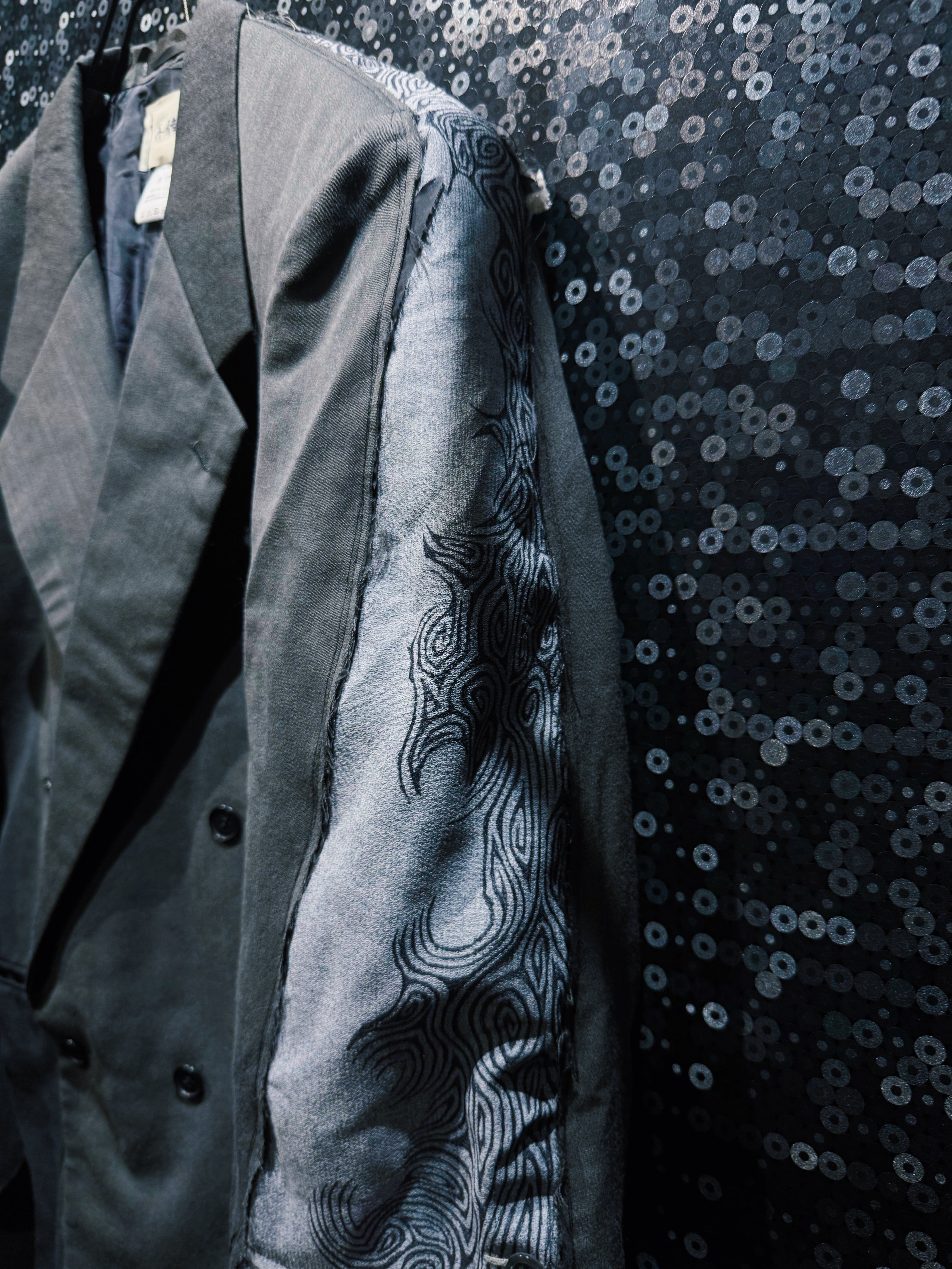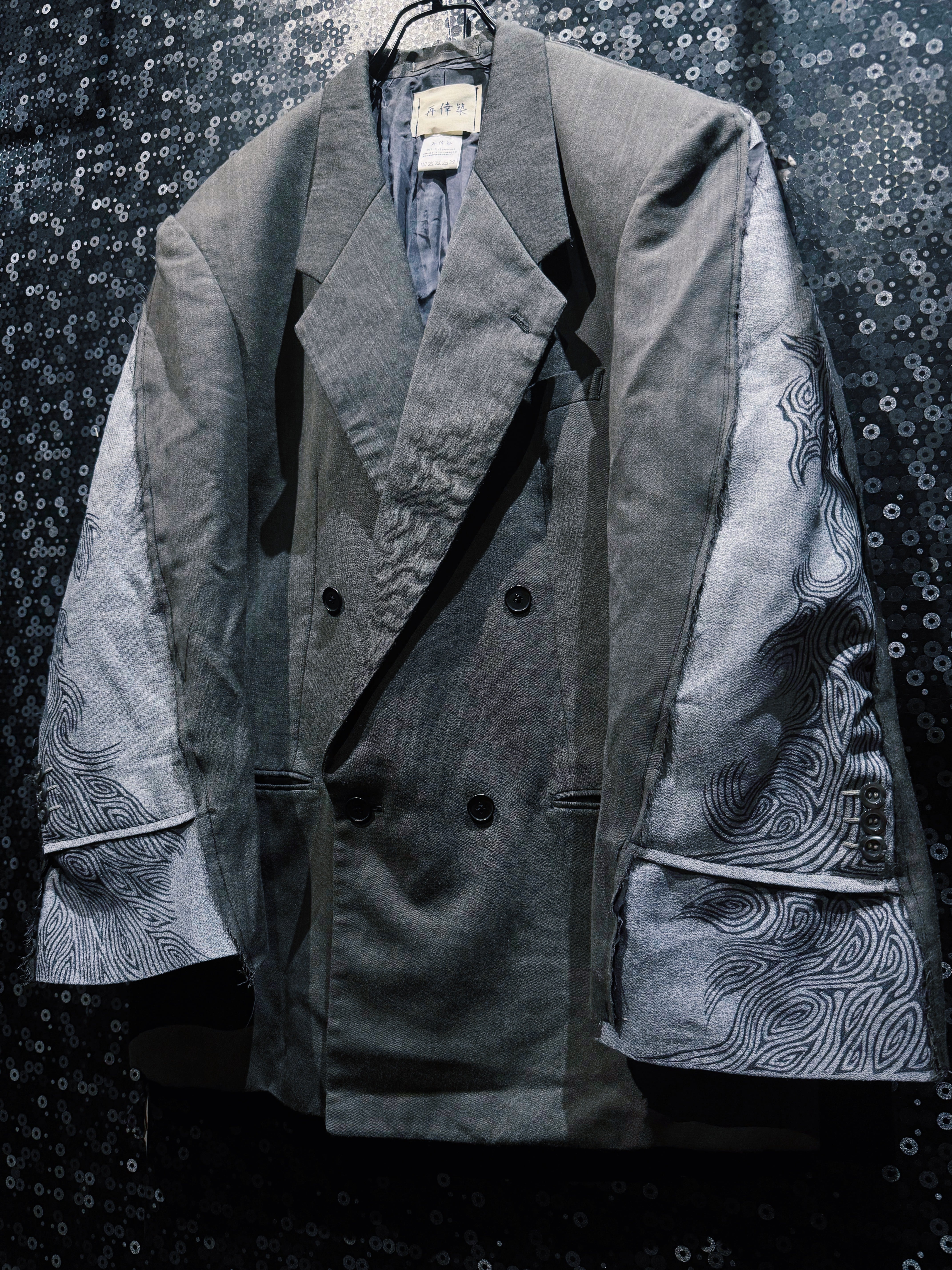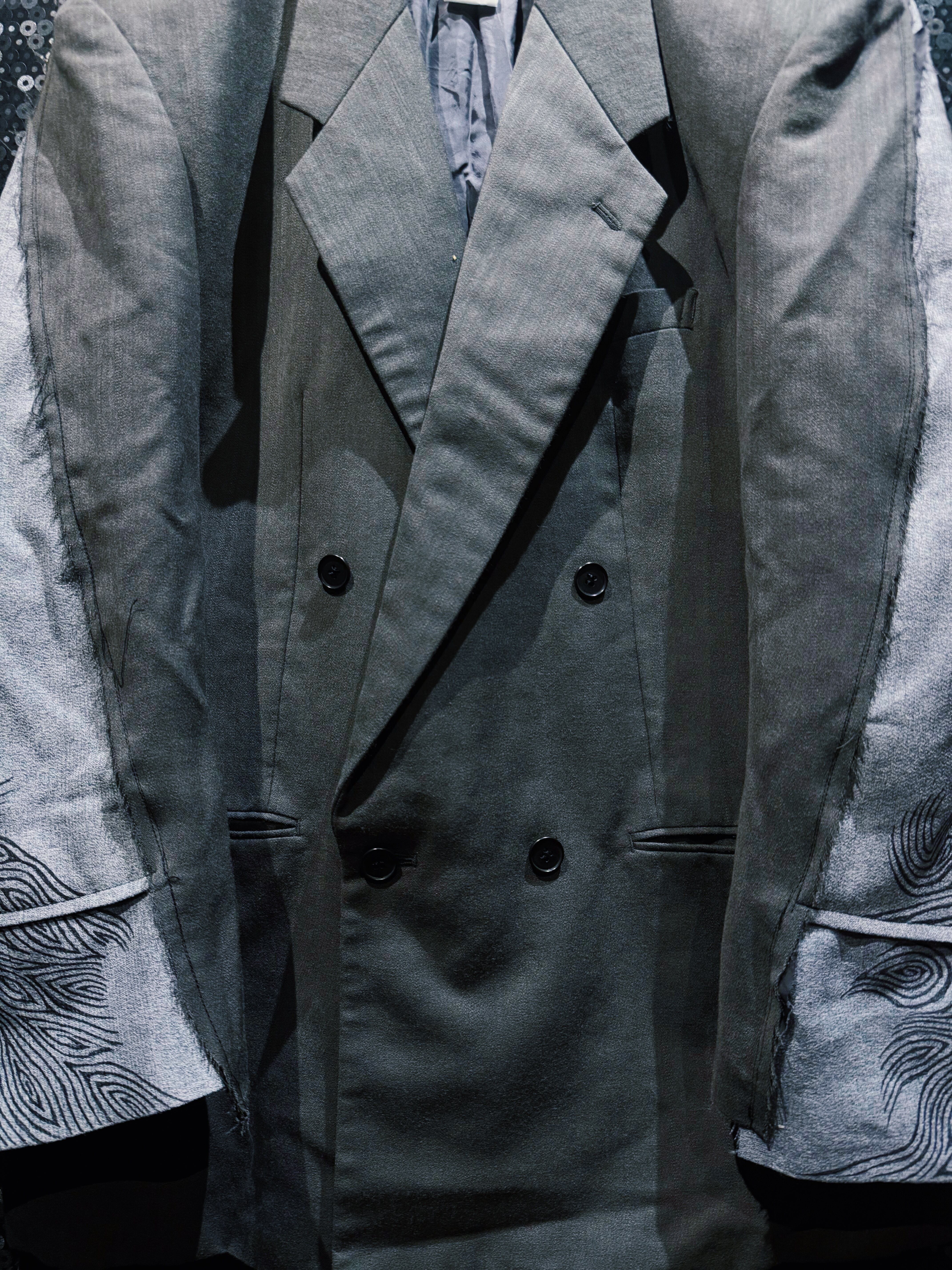 さらにそこへハンドペイント風の流線柄を加えることで、伝統的なフォーマルさと前衛的なストリート感を同時に纏った一着に仕上げられている。袖部分のコントラストは唯一無二で、シルエットの力強さとディテールの遊び心が際立つ。