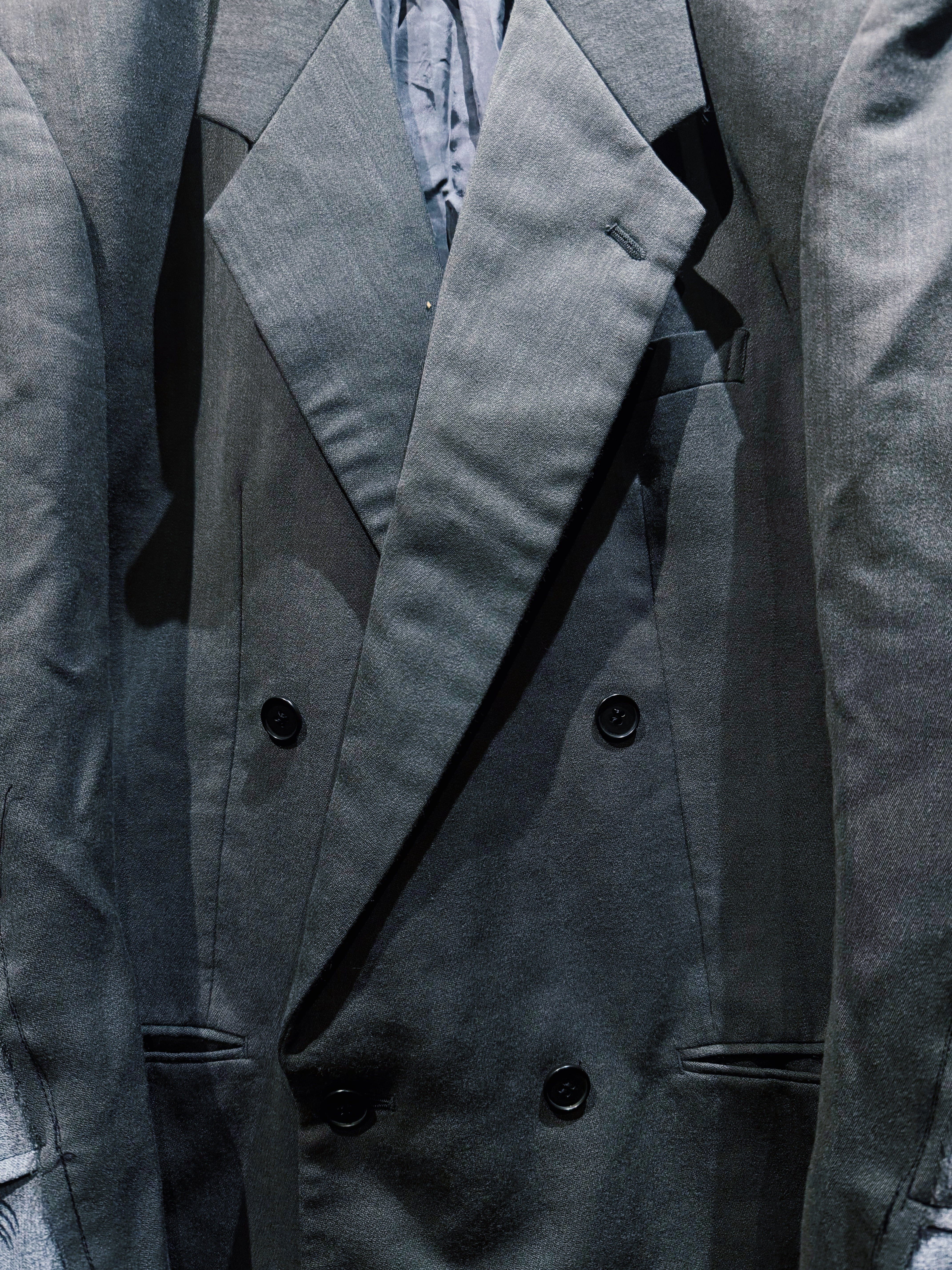 再倖築によるスリーブドッキングペイントテーラードジャケット。ベースはダブル仕様のクラシカルなテーラードで、肩から袖にかけて異素材をドッキング。