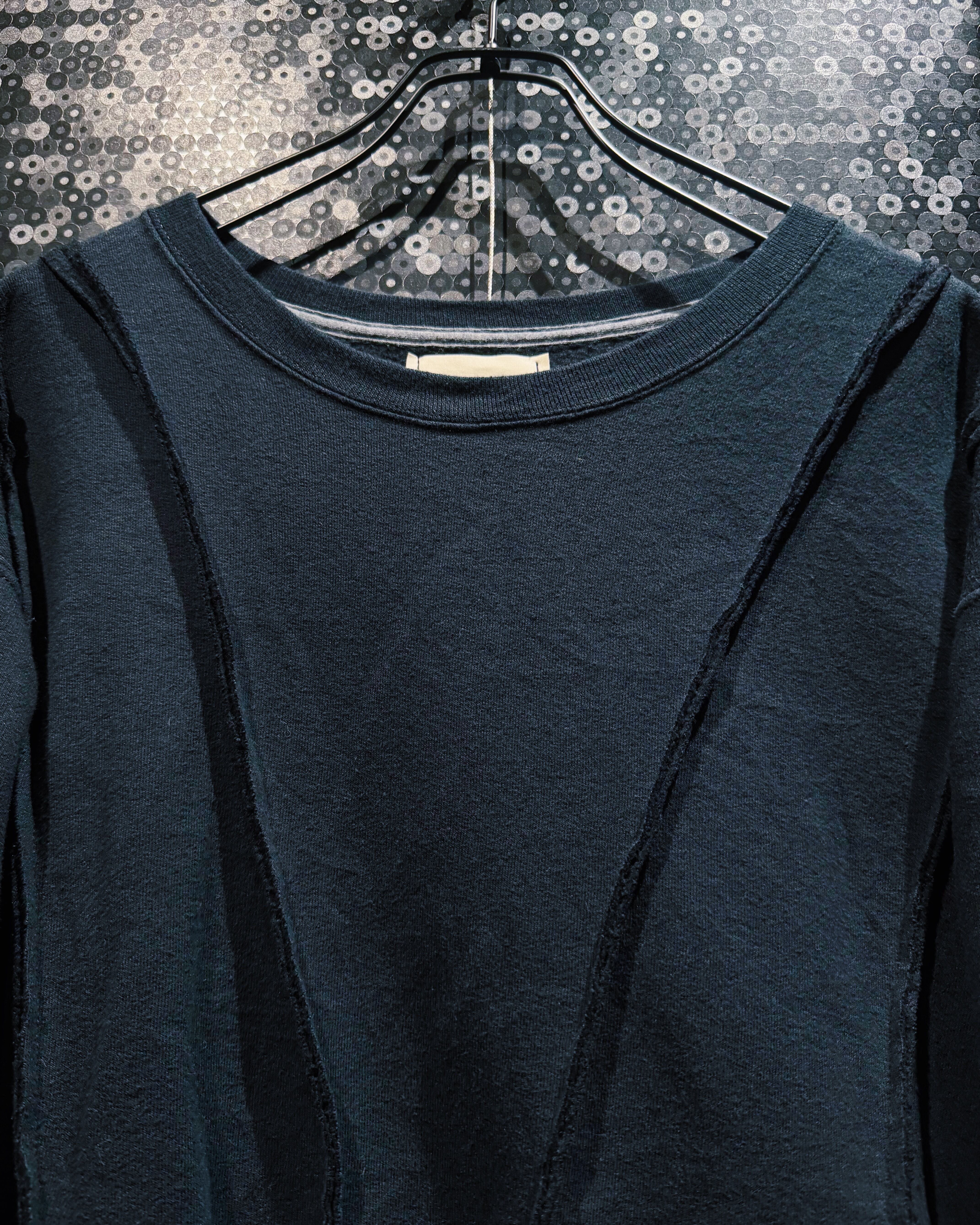 再倖築の独自解釈によるドッキングスウェット。フロントに大胆に施された切替えは、解体と再構築を繰り返すことで生まれた立体的なラインを描き、シンプルなボディに深みのある存在感を与えている。