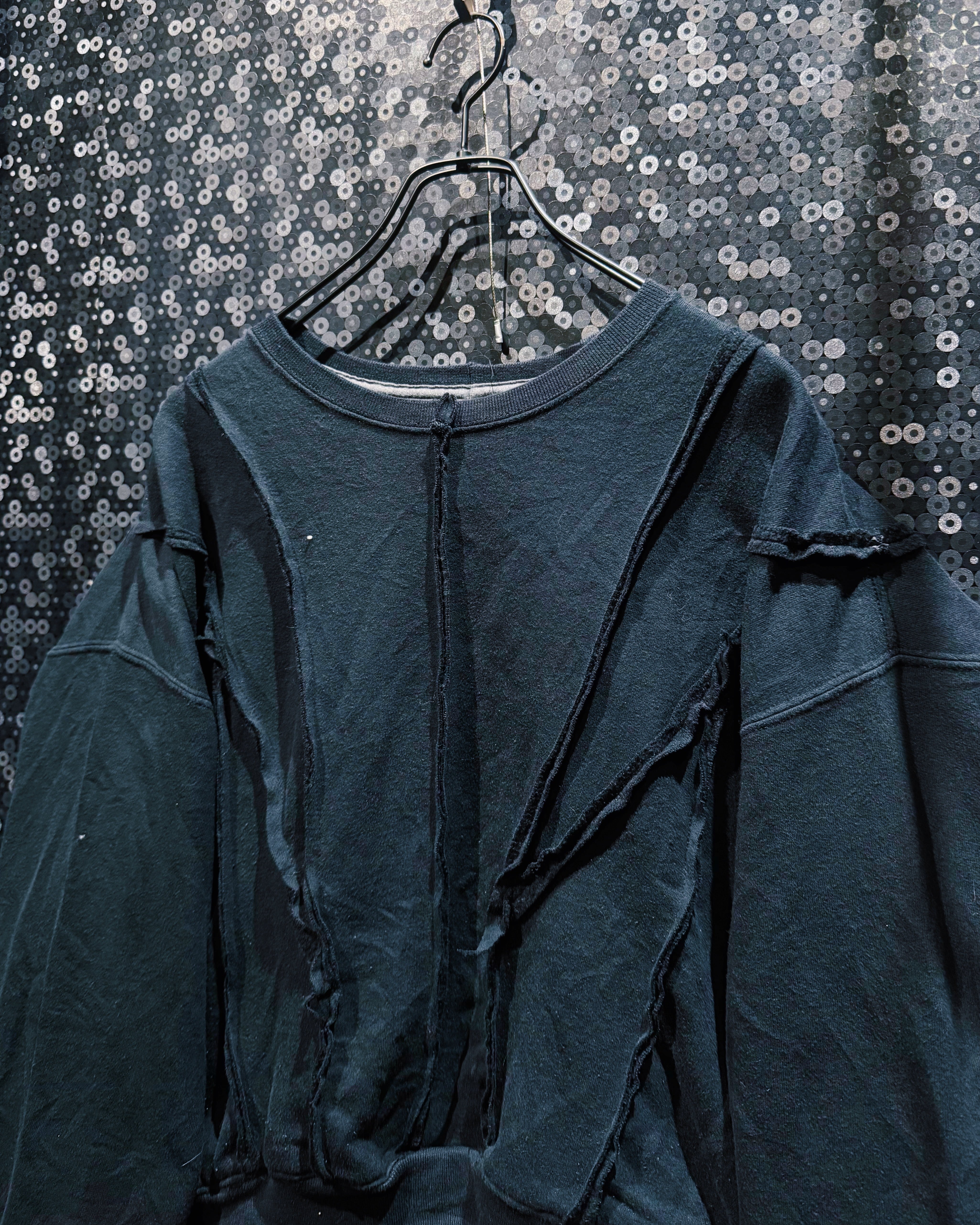 再倖築によるリメイクスウェット。大胆に切り替えられたフロントの縦接ぎデザインと、裁ち切りで残された生地のエッジが特徴的な一着。