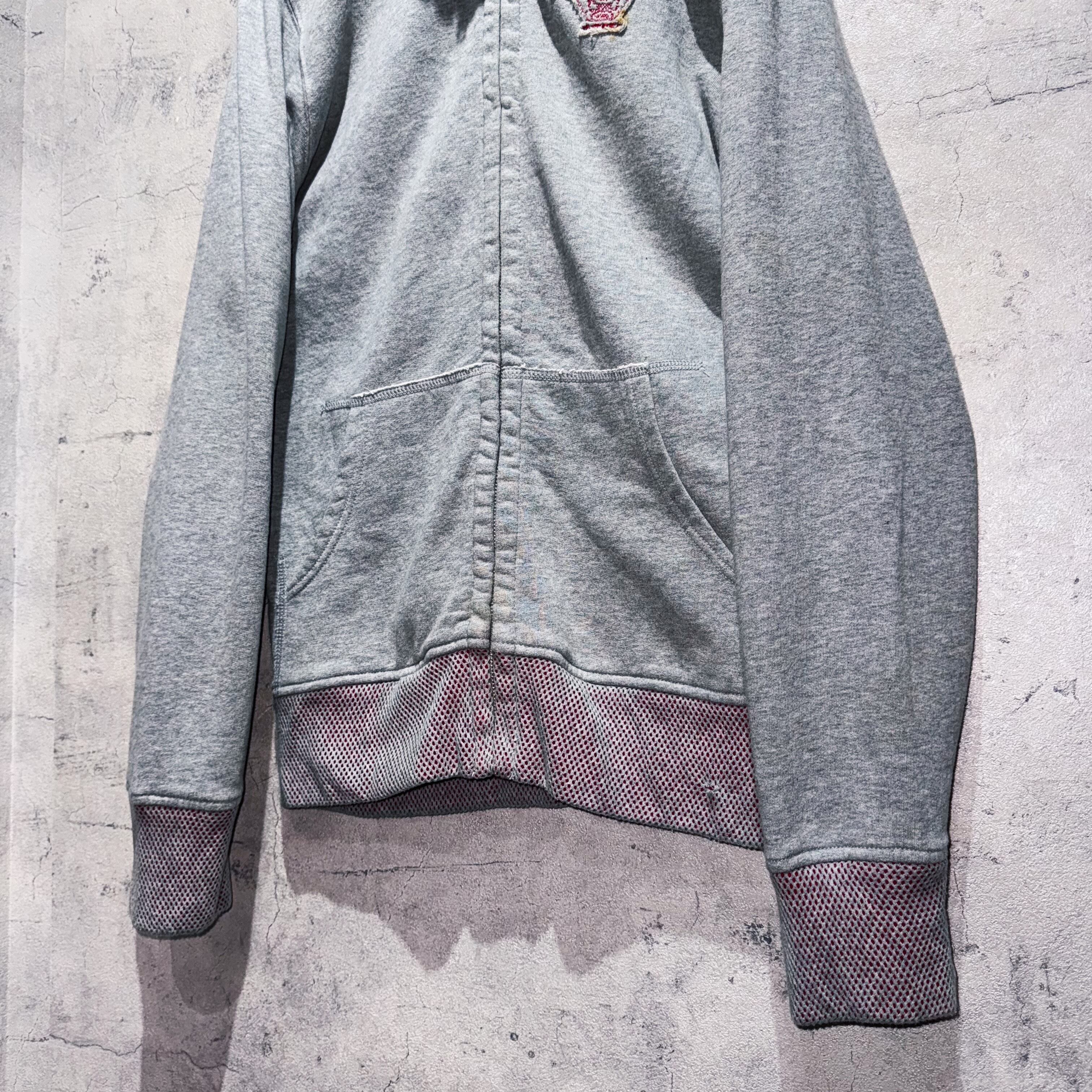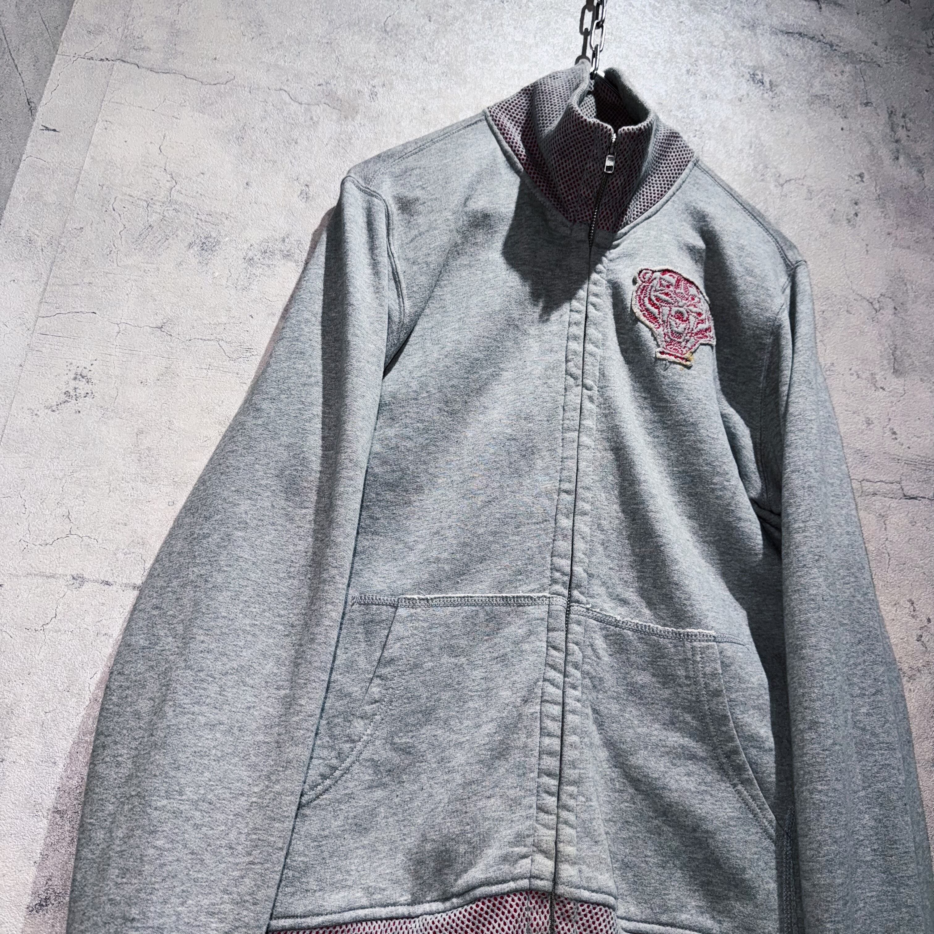 胸元に虎の刺繍ワッペンをあしらい、アクセントにしたスウェットトラックジャージ。首元や裾のメッシュデザインが癖があって魅力的ですね。