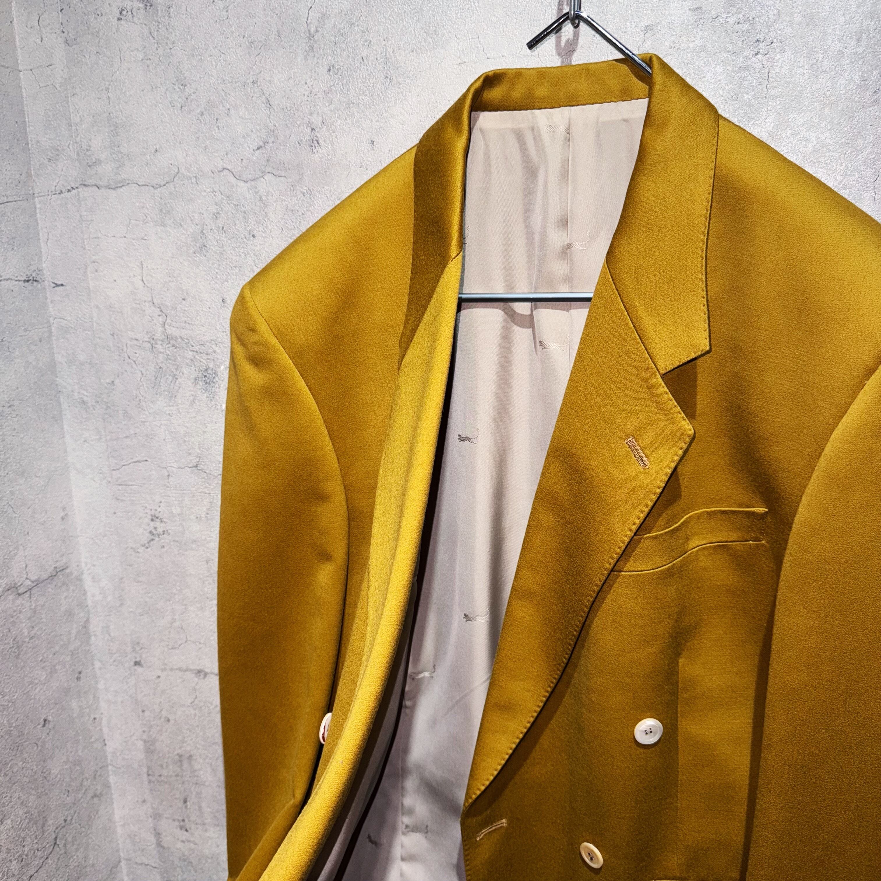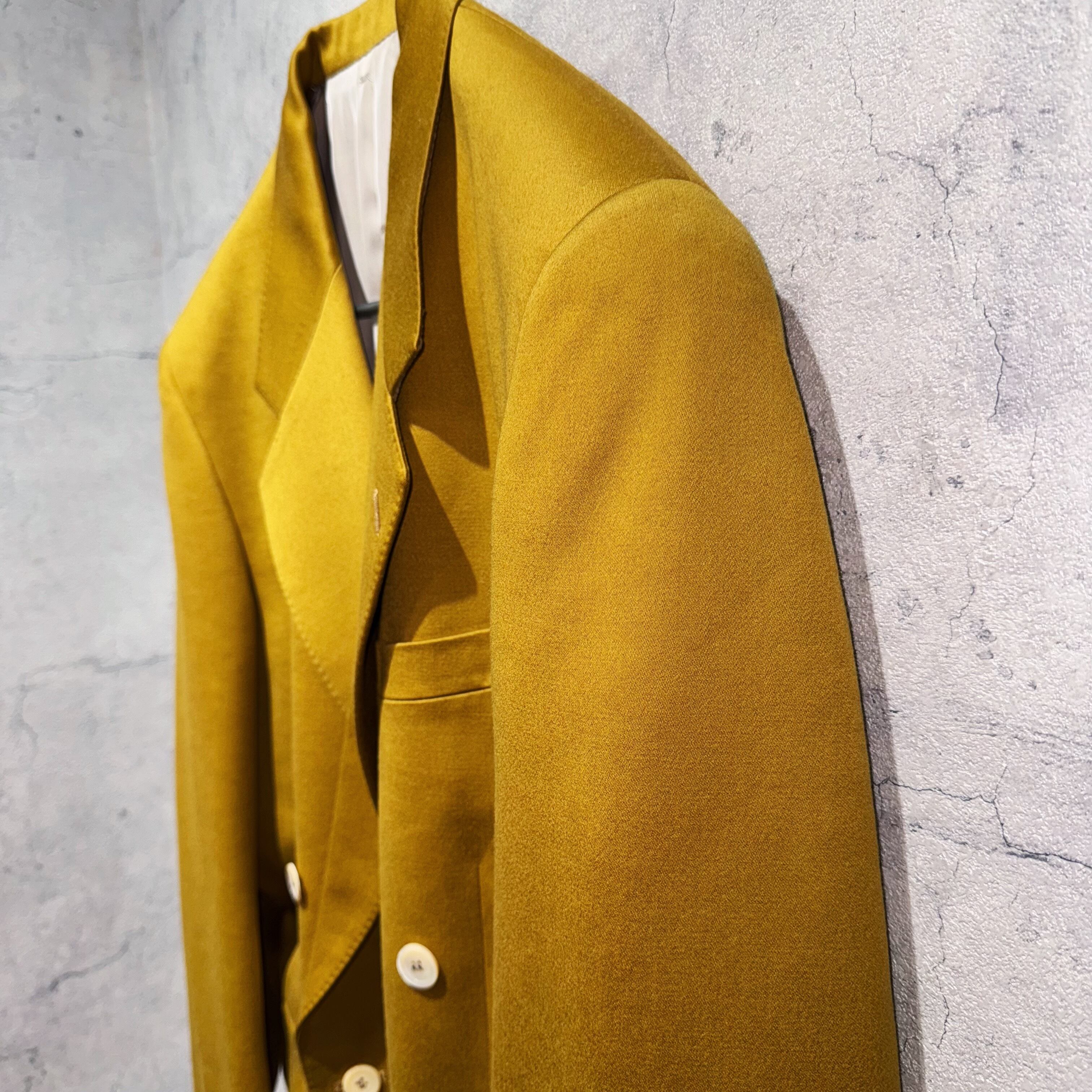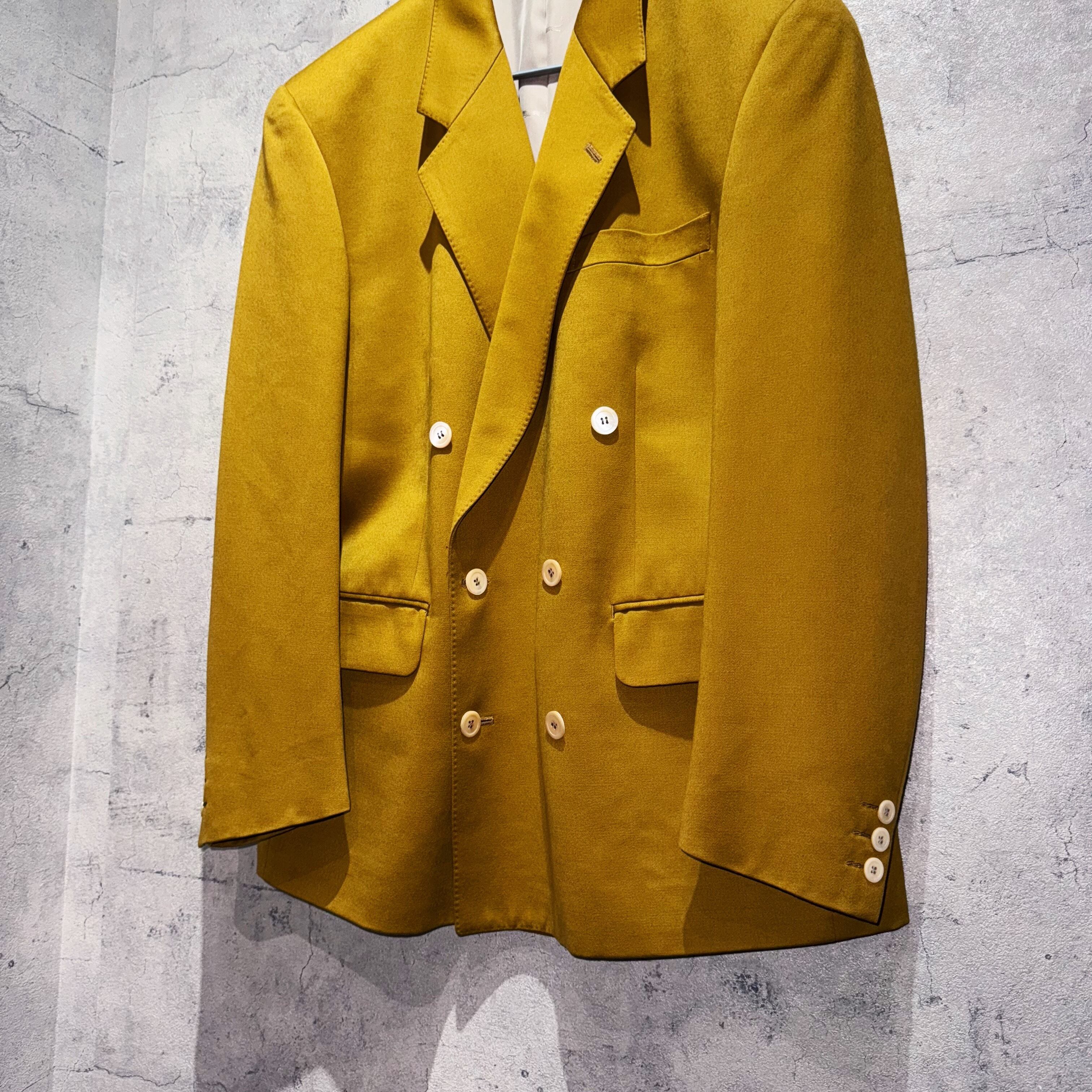 写真からでも伝わってくる美しい光沢を放つ上質なウール素材を採用し、アンティークゴールドカラーを身に纏ったダブルのテーラードジャージ。