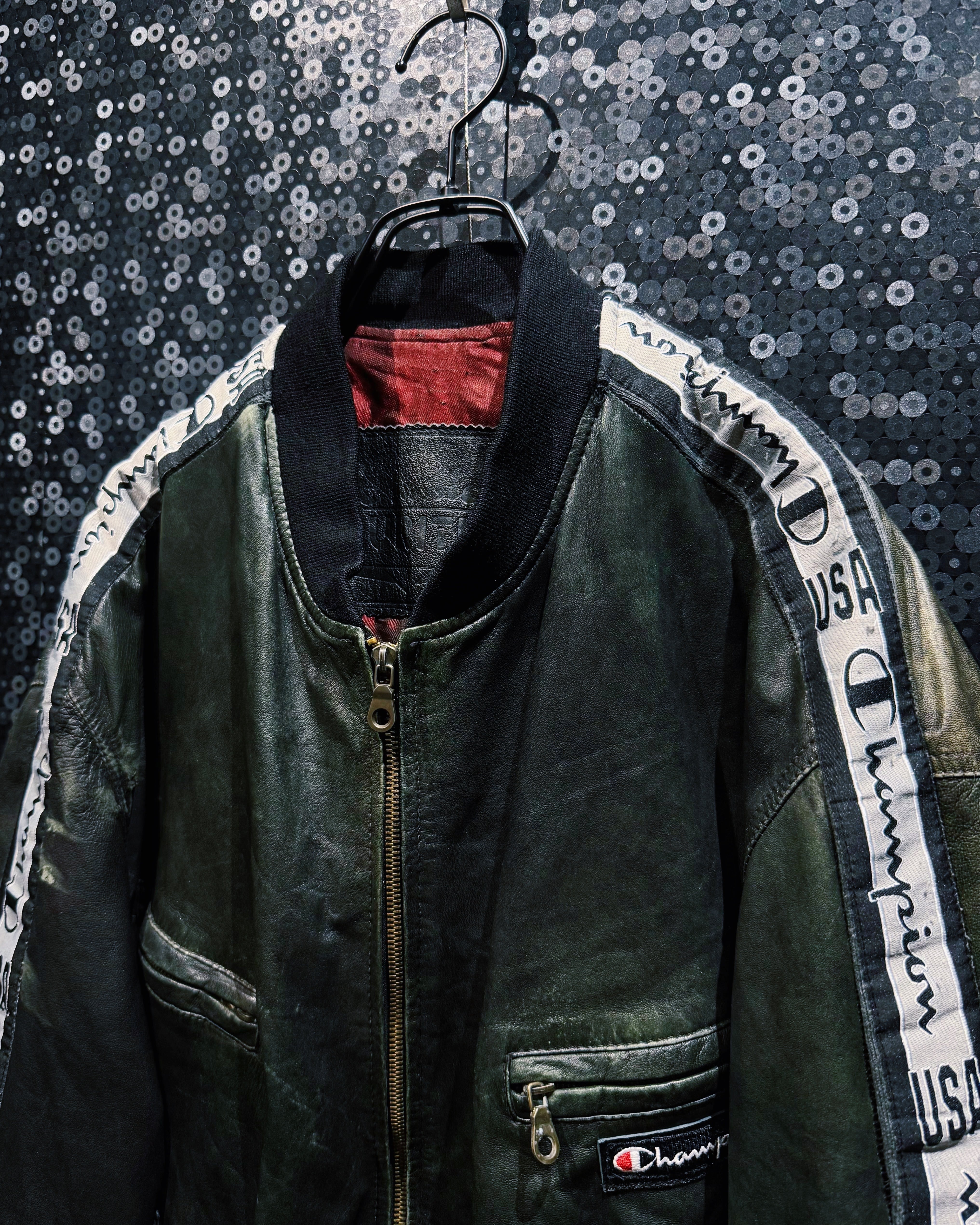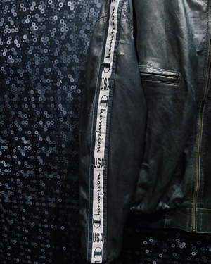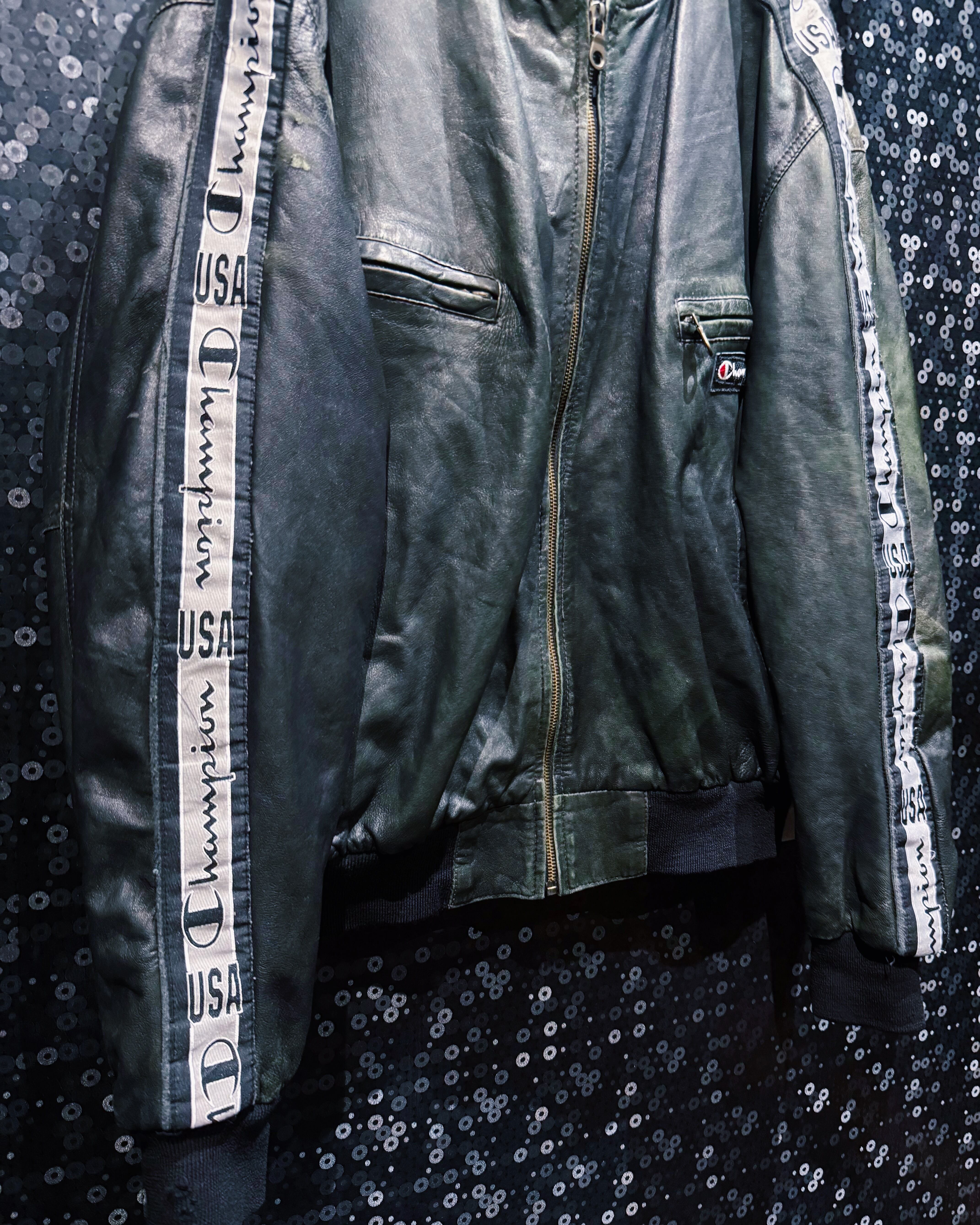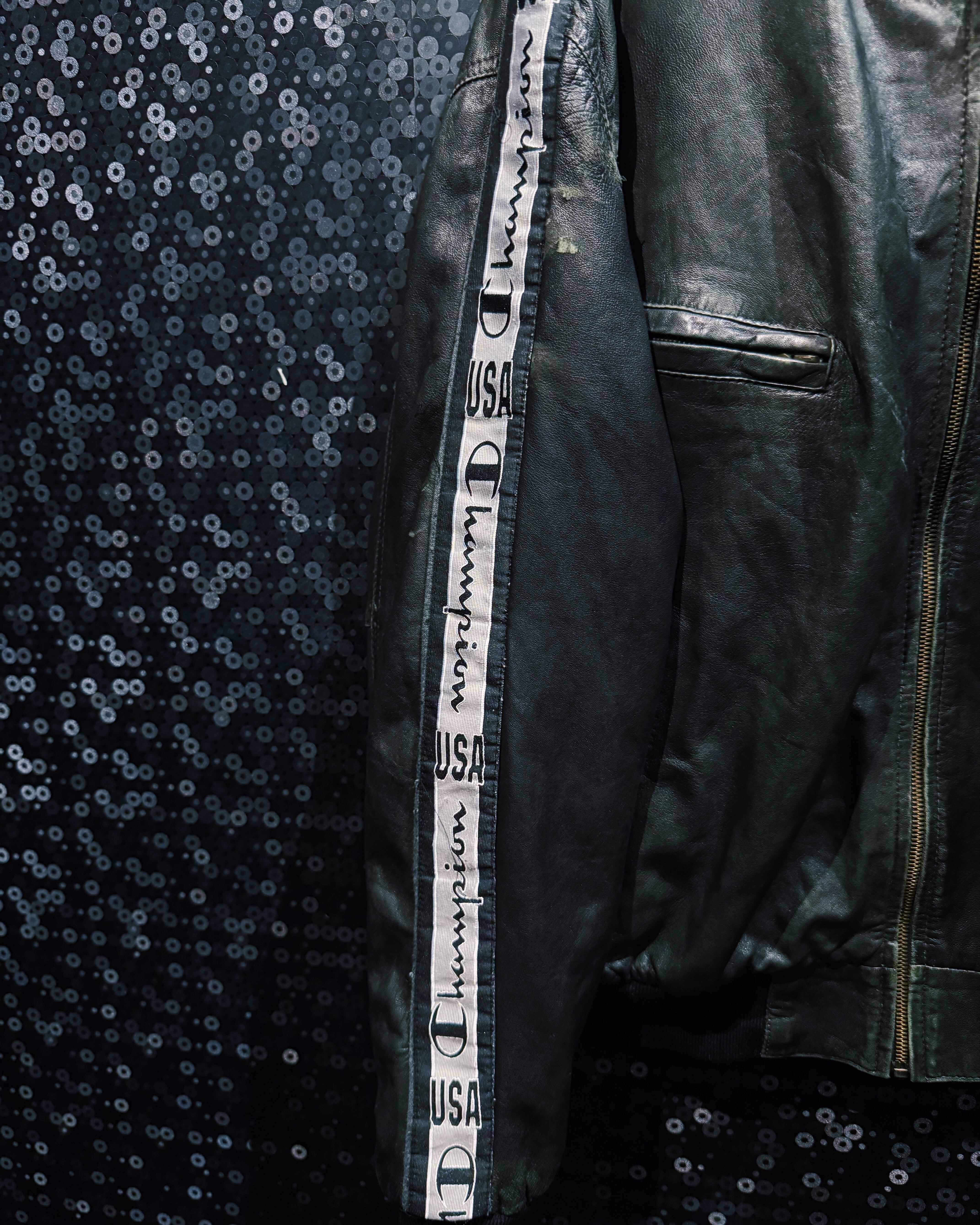 最大の特徴は両袖に走るChampionテープライン。USAロゴやブランドネームが連続するストリートライクなアクセントは、スポーツブランドの象徴的アイコンをレザーに大胆にドッキングした斬新なディテールとなっている。胸元にはChampionロゴワッペンを配置し、全体の統一感を高めながらもスポーツとレザーの異素材ミックスによる新鮮なコントラストを演出。