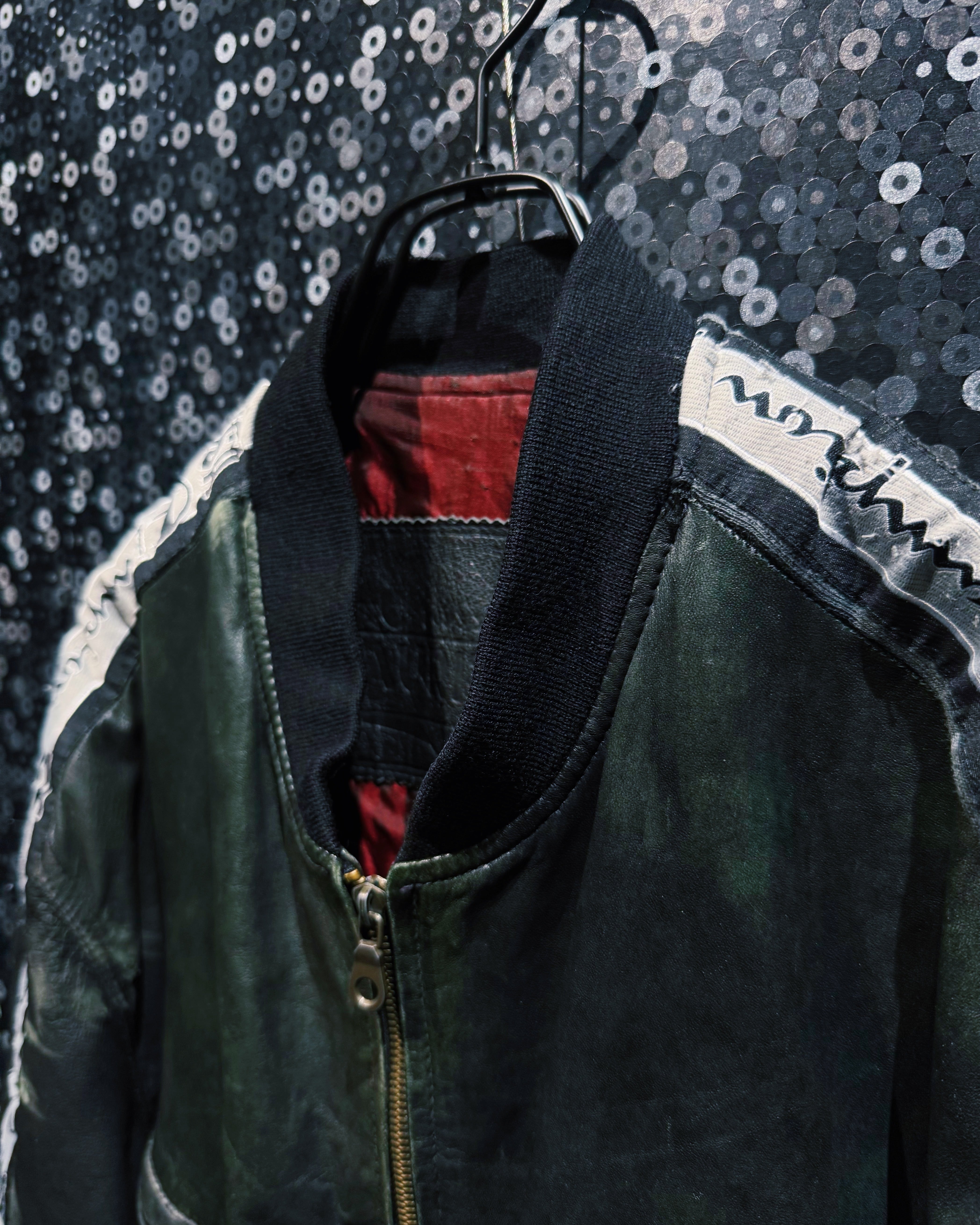 ヴィンテージレザーをベースに再構築された、オリジナルリメイクの短丈レザージャケット。武骨なブラックレザーに独自のエイジングが施され、深みのあるグリーンがかった風合いが一点物ならではの存在感を放つ。シルエットは通常のレザージャケットより短丈にアレンジされ、ストリートウェアとの相性を高めたモダンなバランス。