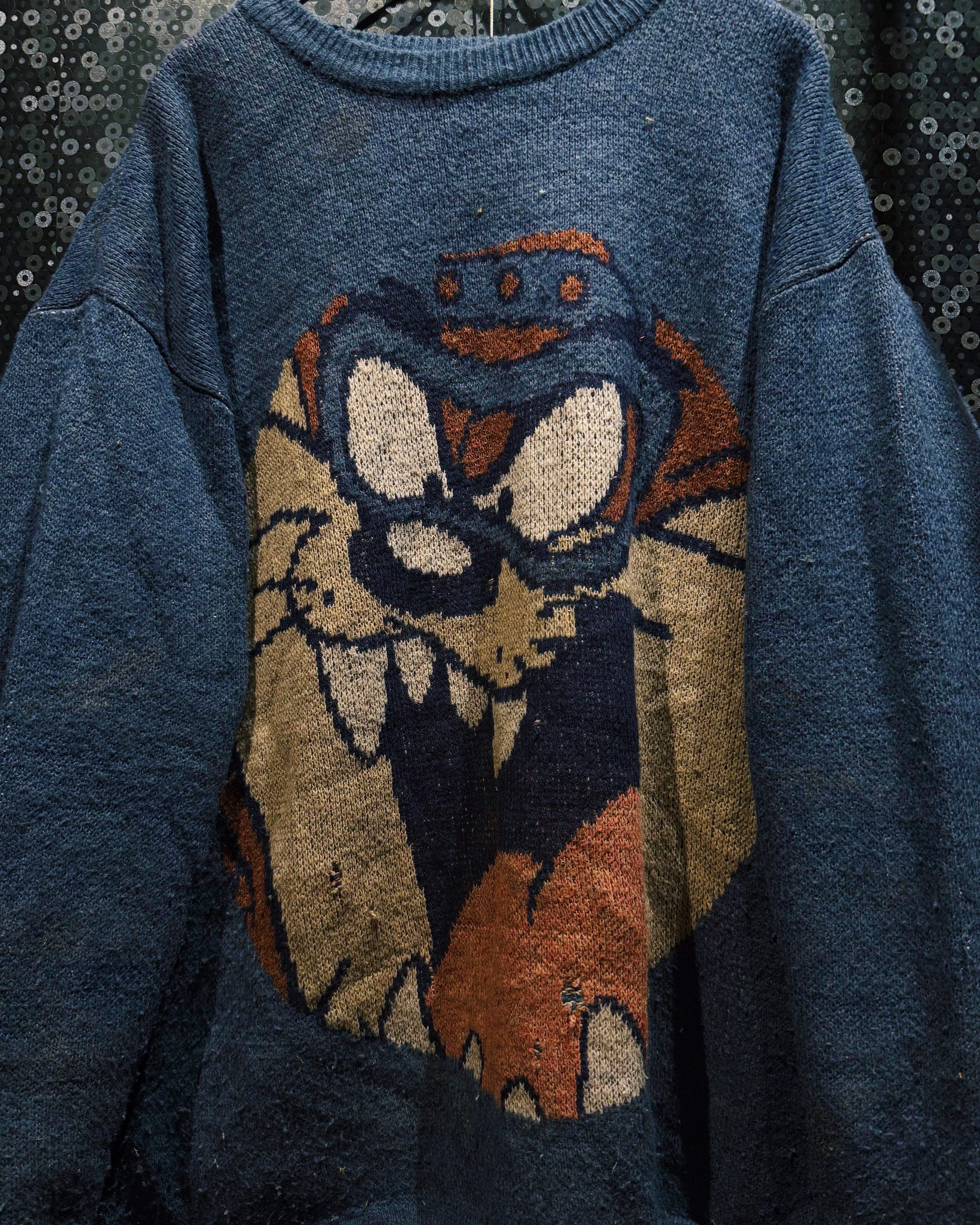 ルーニー・テューンズのオフィシャルアイテムは近年ヴィンテージ市場で高騰しており、特にタズモチーフは希少性が高い。アニメファンはもちろん、90年代ファッションを代表するキャラクターニットとして、コレクションにも最適な逸品。