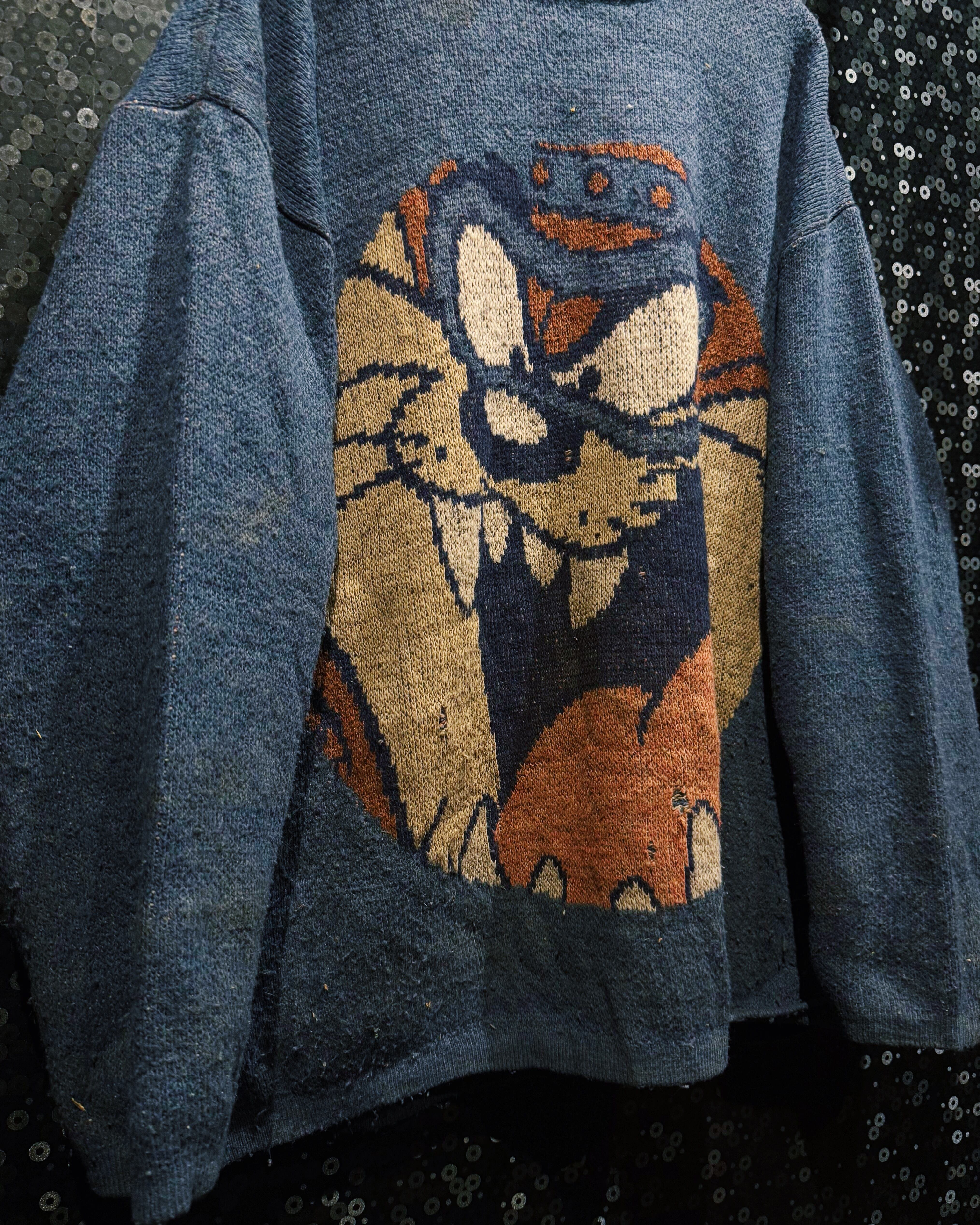 ボディはブルーを基調としたウール混ニット素材で、しっかりとした厚みと柔らかな着心地を両立。大胆なキャラクターグラフィックながら、糸の織り込みによる立体感があり、プリントにはない奥行きを楽しめるのも魅力。シルエットはルーズフィットで、90sのストリートカルチャーやスケートシーンの空気感を色濃く纏っている。