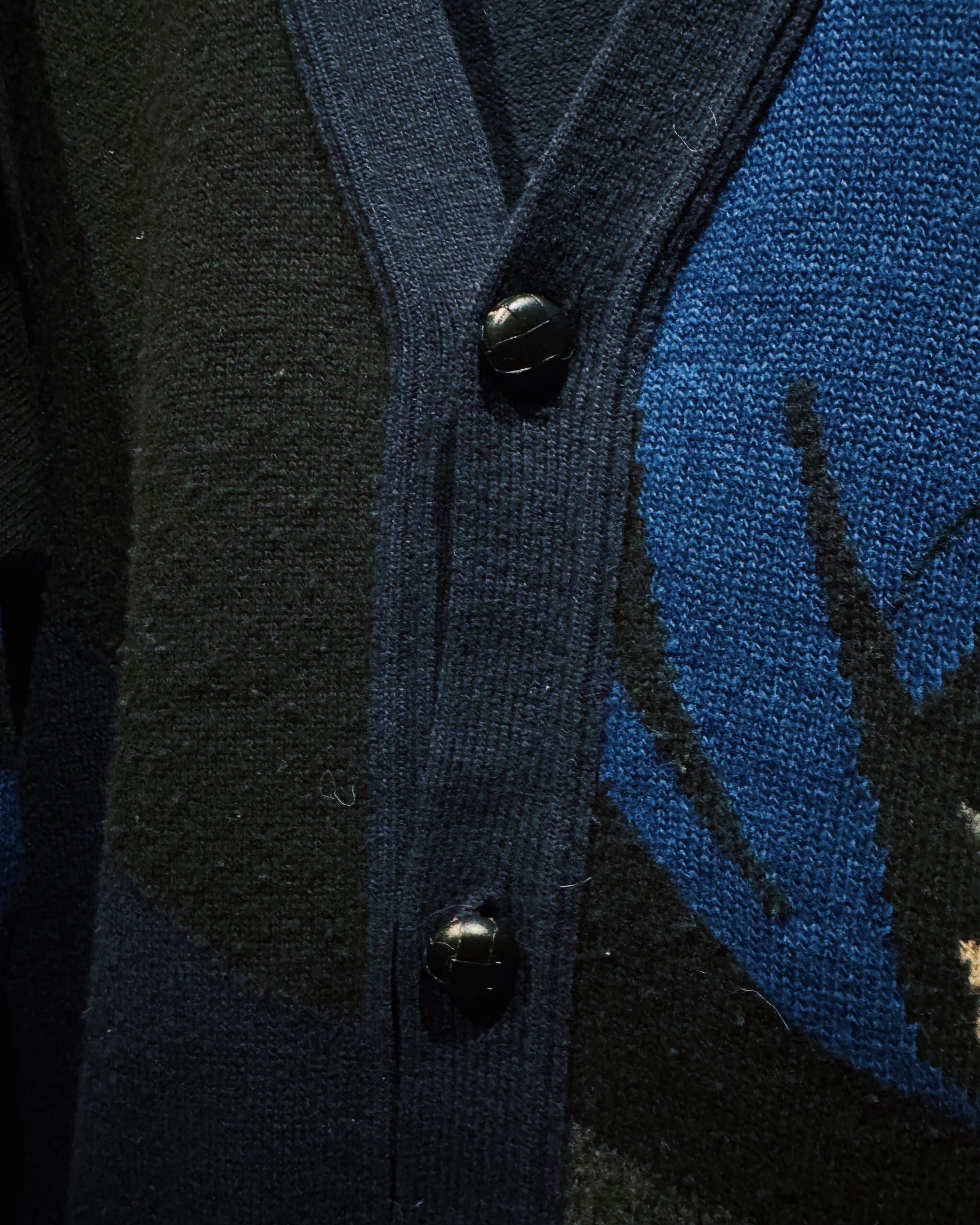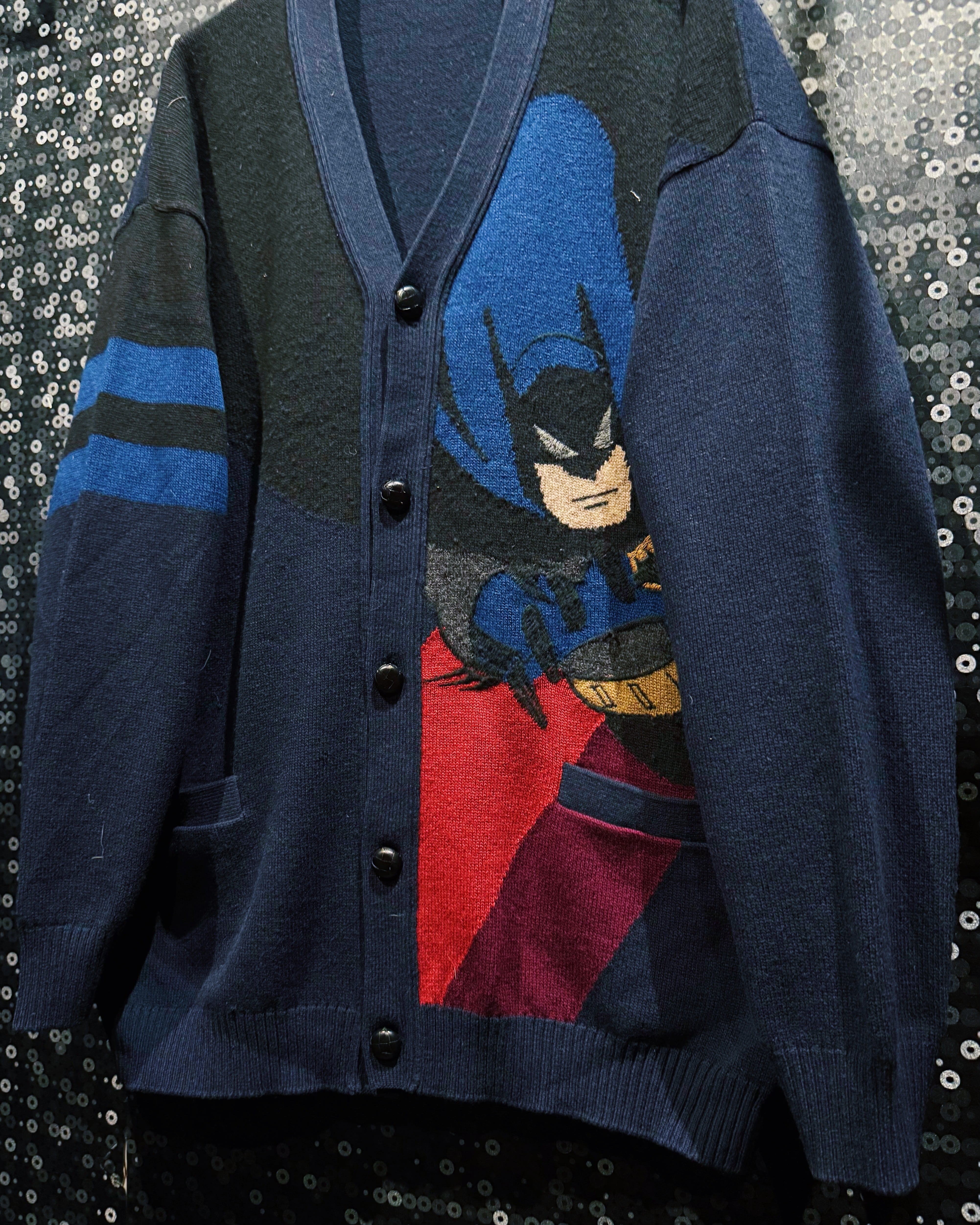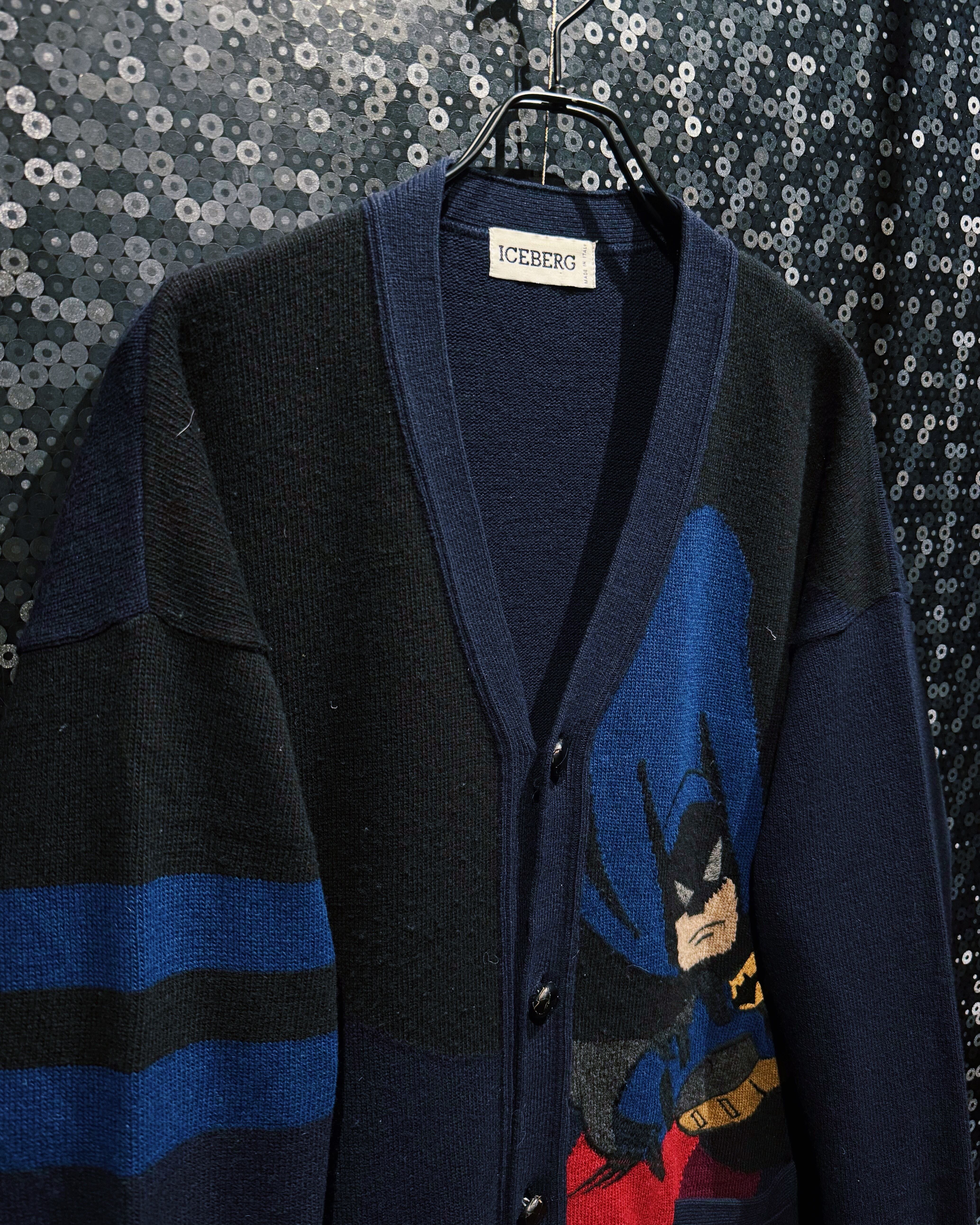 イタリアンブランド ICEBERG による、バットマンを大胆に編み込んだニットカーディガン。ICEBERGは1974年に創業し、80〜90年代にかけてディズニーやワーナーといったキャラクターを取り入れたポップアート的なデザインで人気を博したラグジュアリーブランド。本作はその中でも特に希少な「バットマン」シリーズで、ストリートとハイエンドを繋ぐ象徴的な一枚。