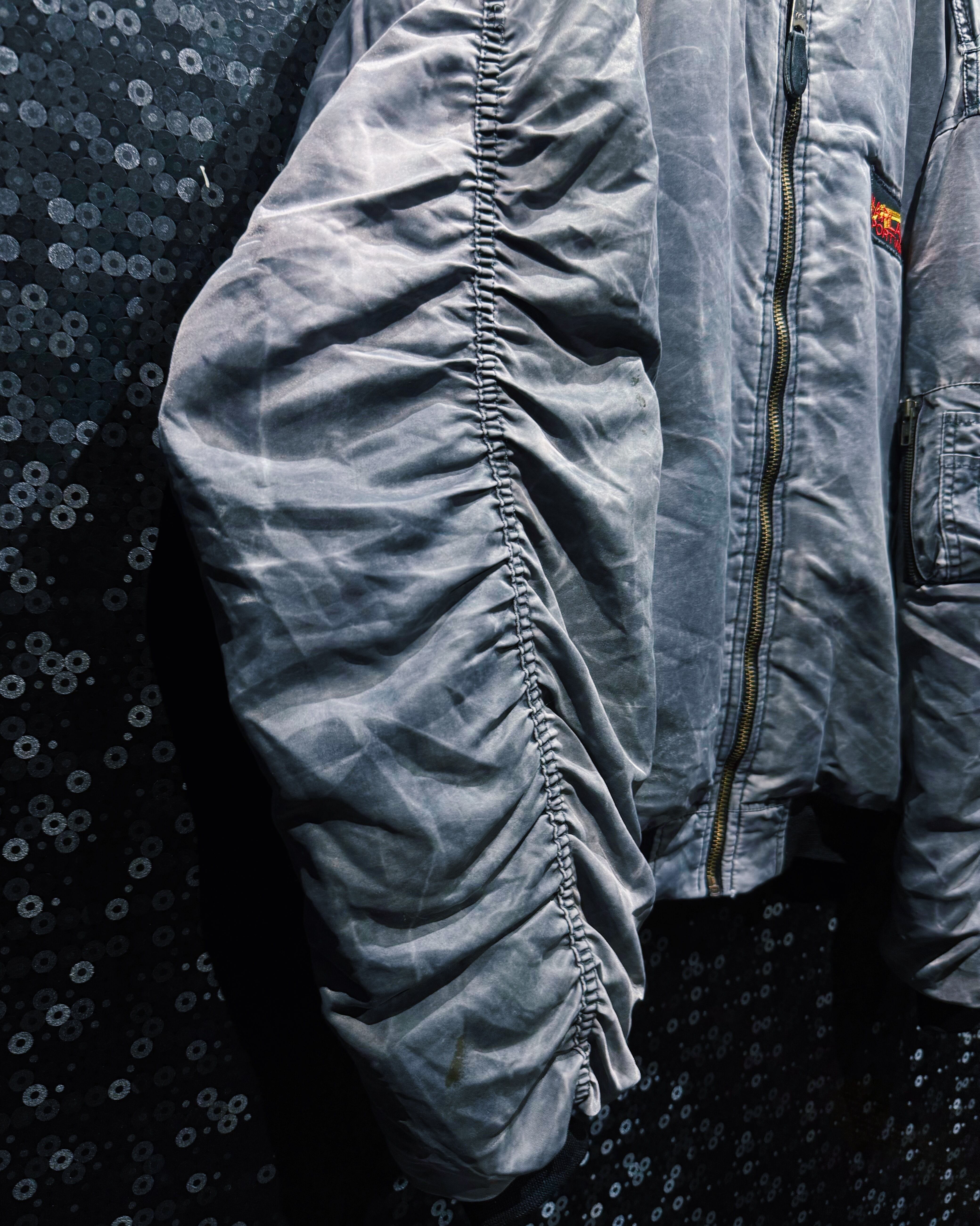最大の特徴は袖のギャザーディテール。大胆に寄せられたシャーリングがシルエットに強い立体感を与え、従来のMA-1には見られないユニークなデザイン性を発揮している。裏地は鮮やかなオレンジで、リバーシブルに着用可能。パイロットジャケットの伝統的なレスキューオレンジを踏襲しながらも、スタイリングによってストリートからモードまで幅広い表情を楽しめる。