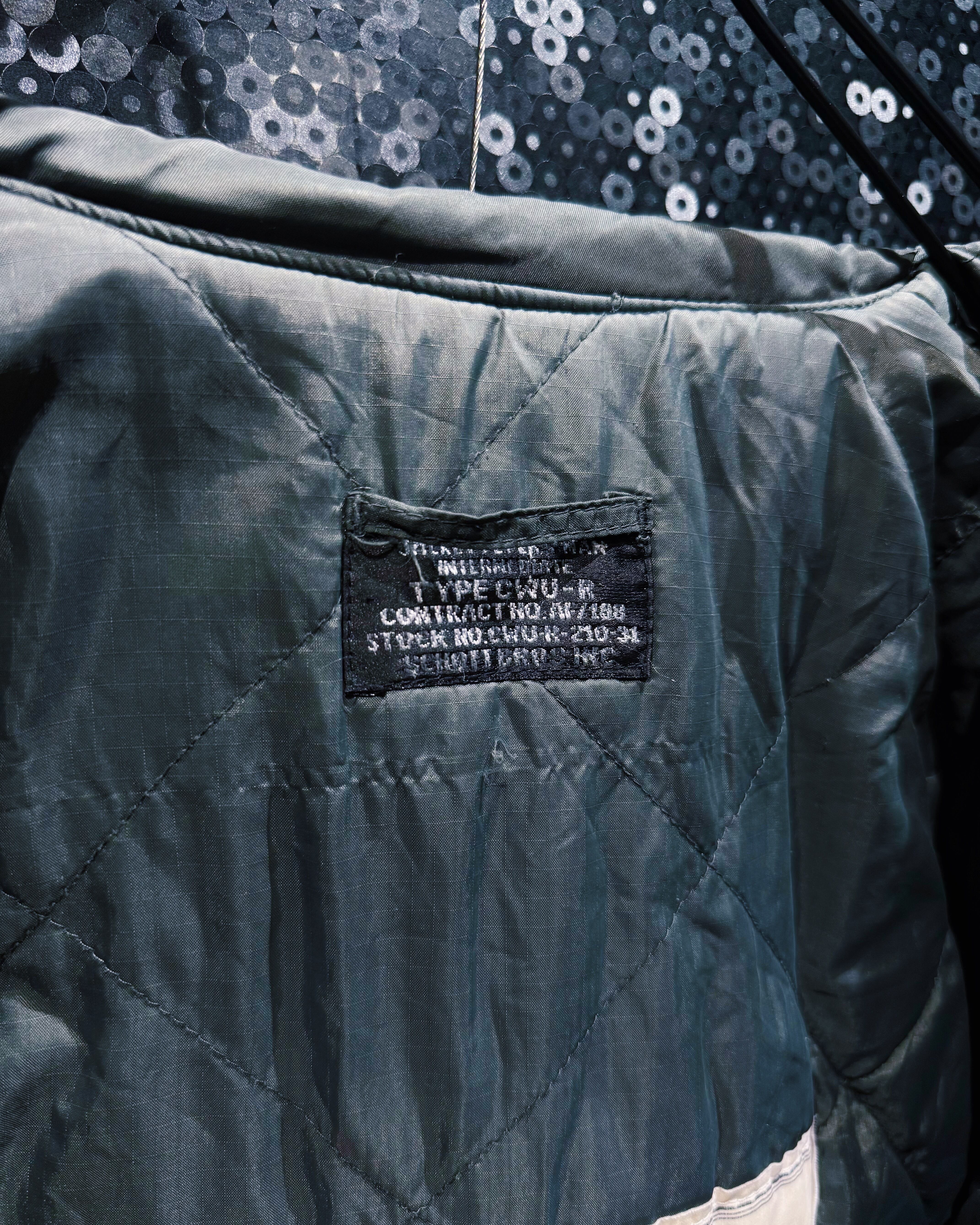 アメリカの名門 Schott Bros. が手掛けたCWU-Rフライトジャケット。CWUは米軍のパイロット用として採用されたフライトジャケットシリーズで、本作はその中でも中間重量仕様の「CWU-R(Intermediate)」タイプ。MA-1の後継として登場したデザインをベースにしながら、ショットならではのタフな縫製と重量感で仕上げられた一着。