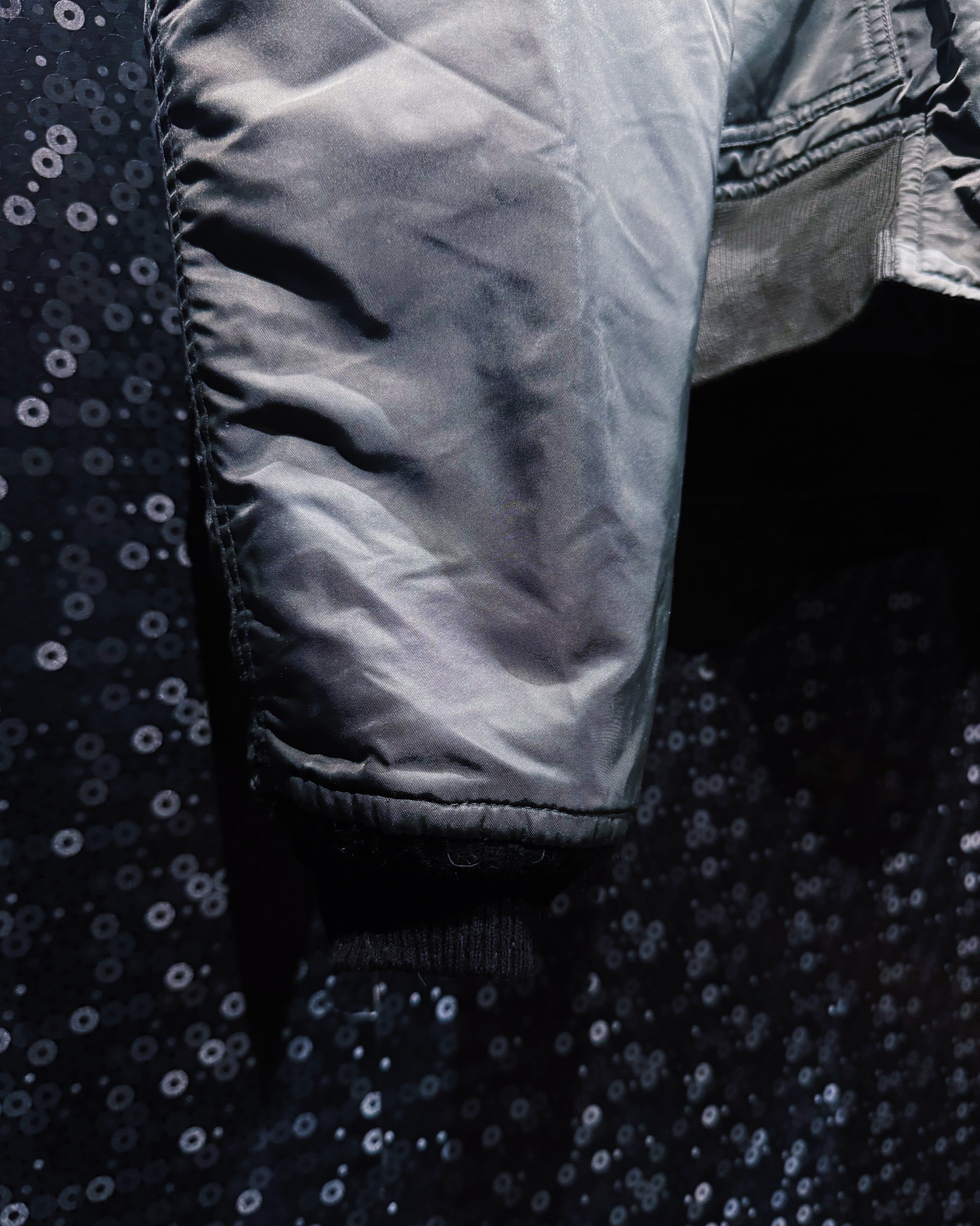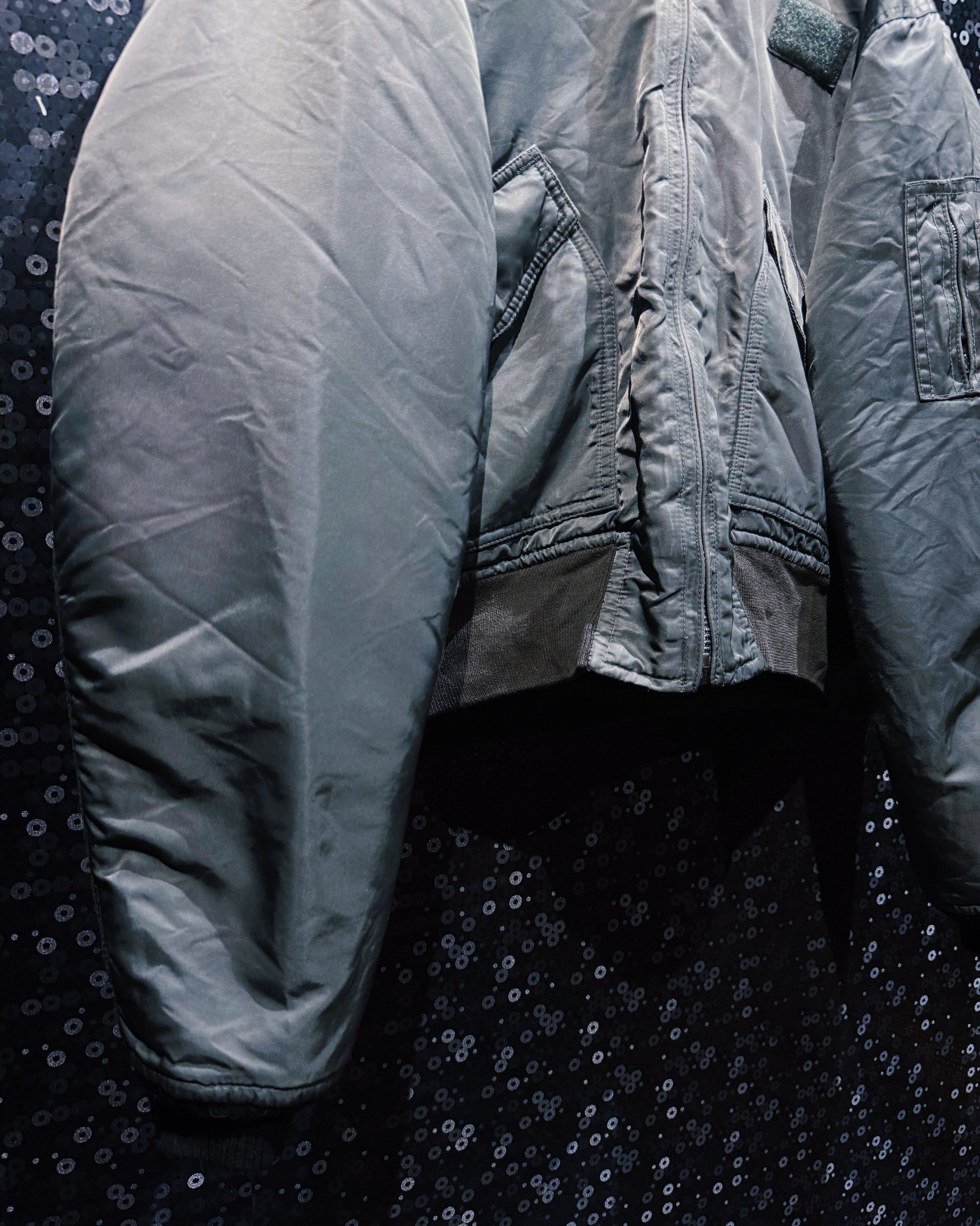 ミリタリーらしいセージグリーンのナイロンシェルは独特の鈍い光沢を持ち、着込むほどに深みを増す質感。フロントは大ぶりのフラップポケットとベルクロパッチ、袖にはユーティリティポケットを備え、無骨な機能美が際立っている。中綿入りのライニングはキルティング仕様で防寒性も高く、秋冬シーズンに頼れる存在感を発揮する。