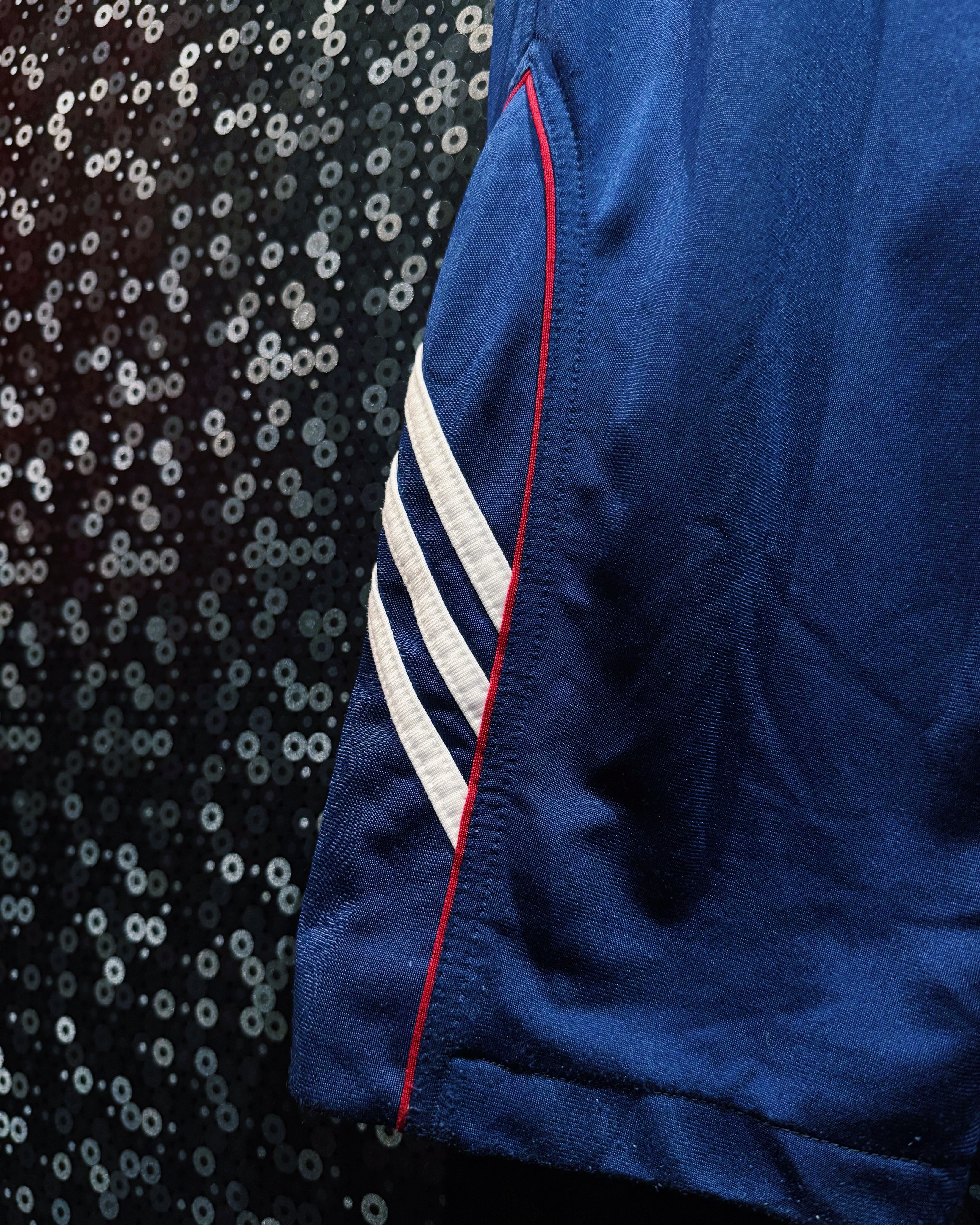 アディダスのパフォーマンスロゴを胸元とパンツに配した、ネイビーを基調としたトラックスーツセットアップ。光沢感のあるジャージー素材を採用し、滑らかなタッチと軽量感が特徴。クラシックなシルエットながら、動きやすさと存在感を両立させた一着。