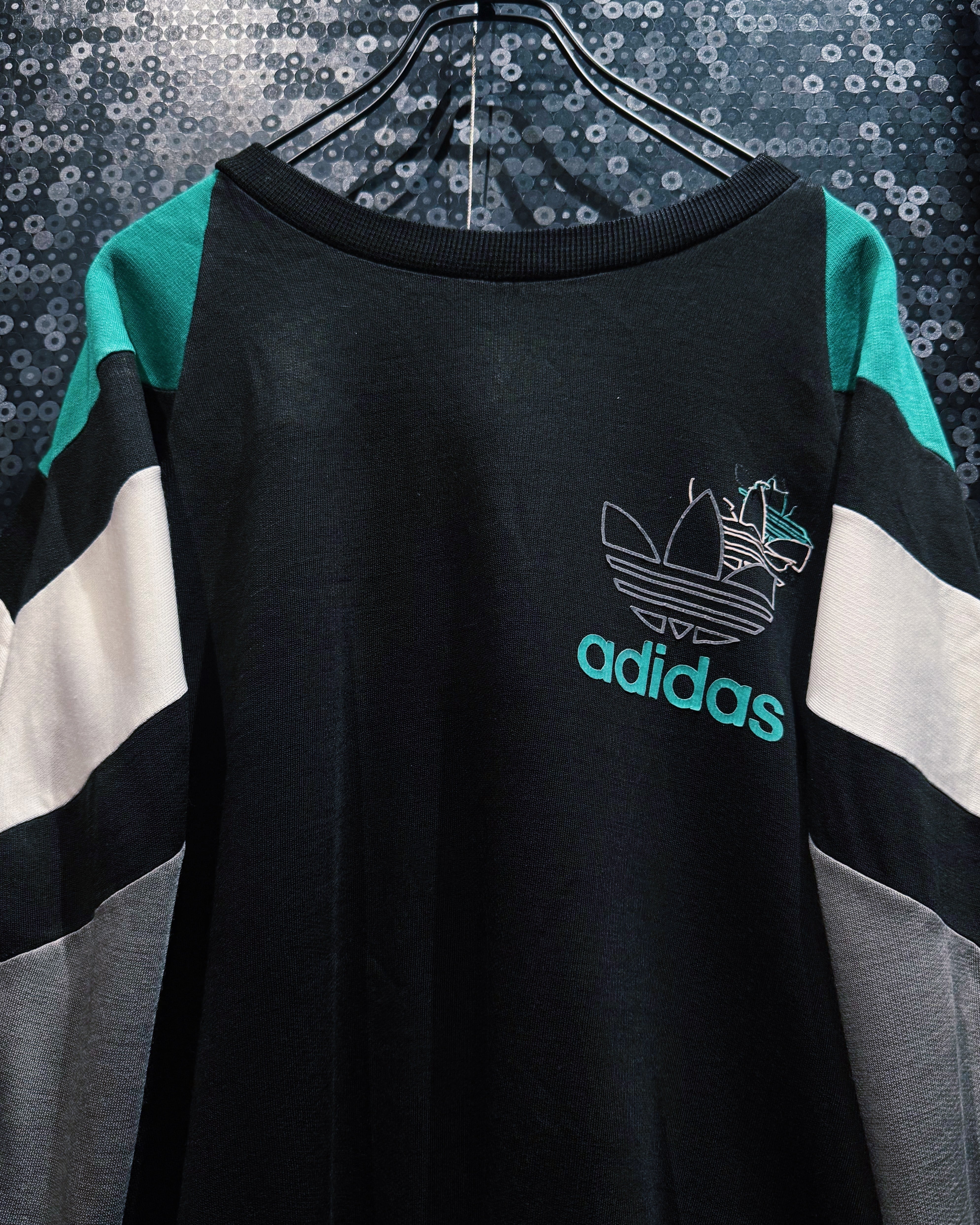 定番のトレフォイルをあえてズラし、奥行きのあるグラフィックで表現することで、90年代らしい大胆なストリート感を演出している。胸元のターコイズグリーンの差し色がアクセントとなり、シンプルながら存在感を放つ仕上がり。