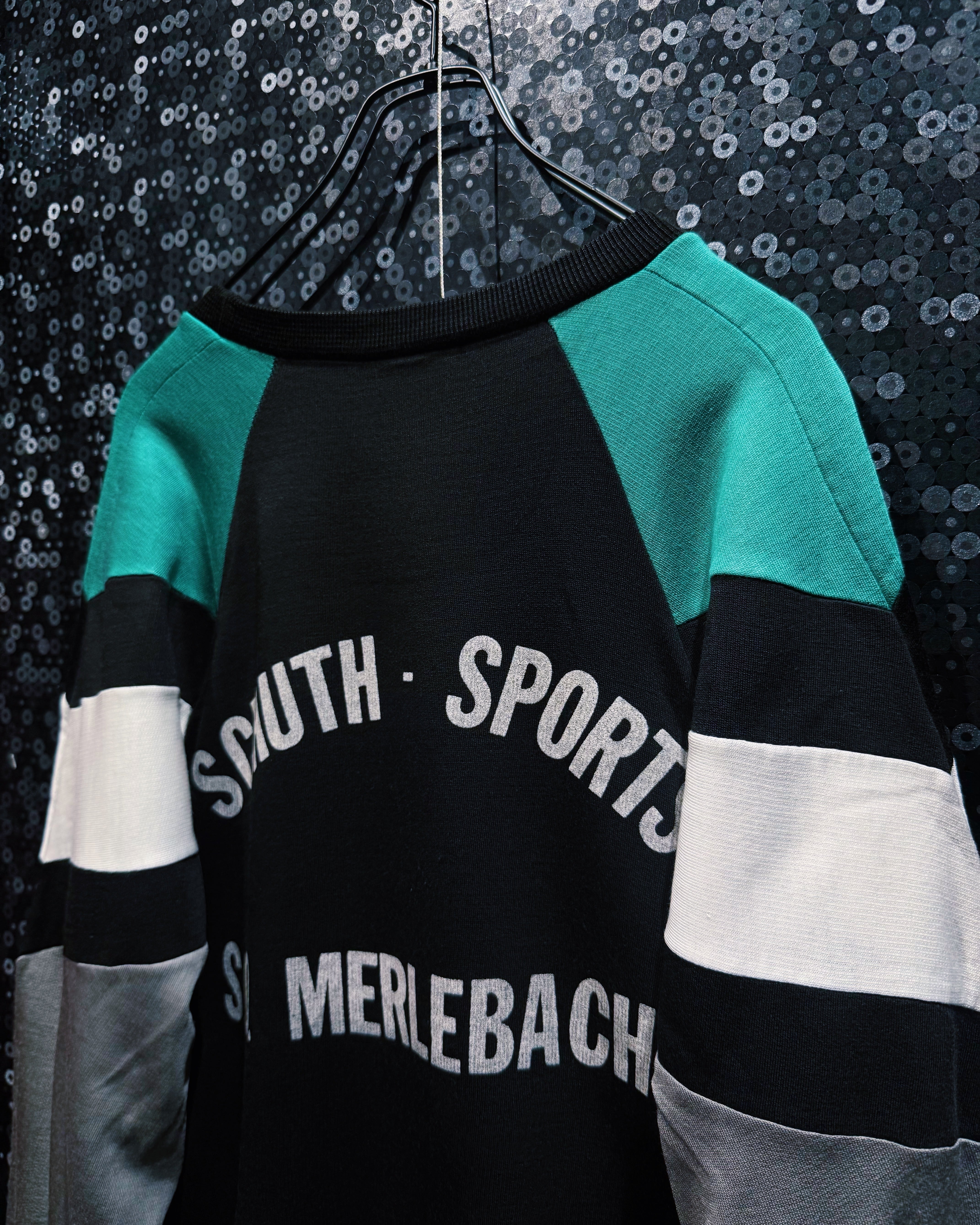 バックには「SOUTH SPORTS MERLEBACH」の英文プリントがアーチ状に配置。Merlebachはフランス北東部ロレーヌ地方の地名であり、地域のスポーツクラブやローカルチームへのオマージュを感じさせる仕様となっている。adidasが地域やクラブスポーツと結びつきながら展開していた時代性を色濃く感じられる一着で、ファッションアイテムとしてもスポーツカルチャーを象徴する逸品。