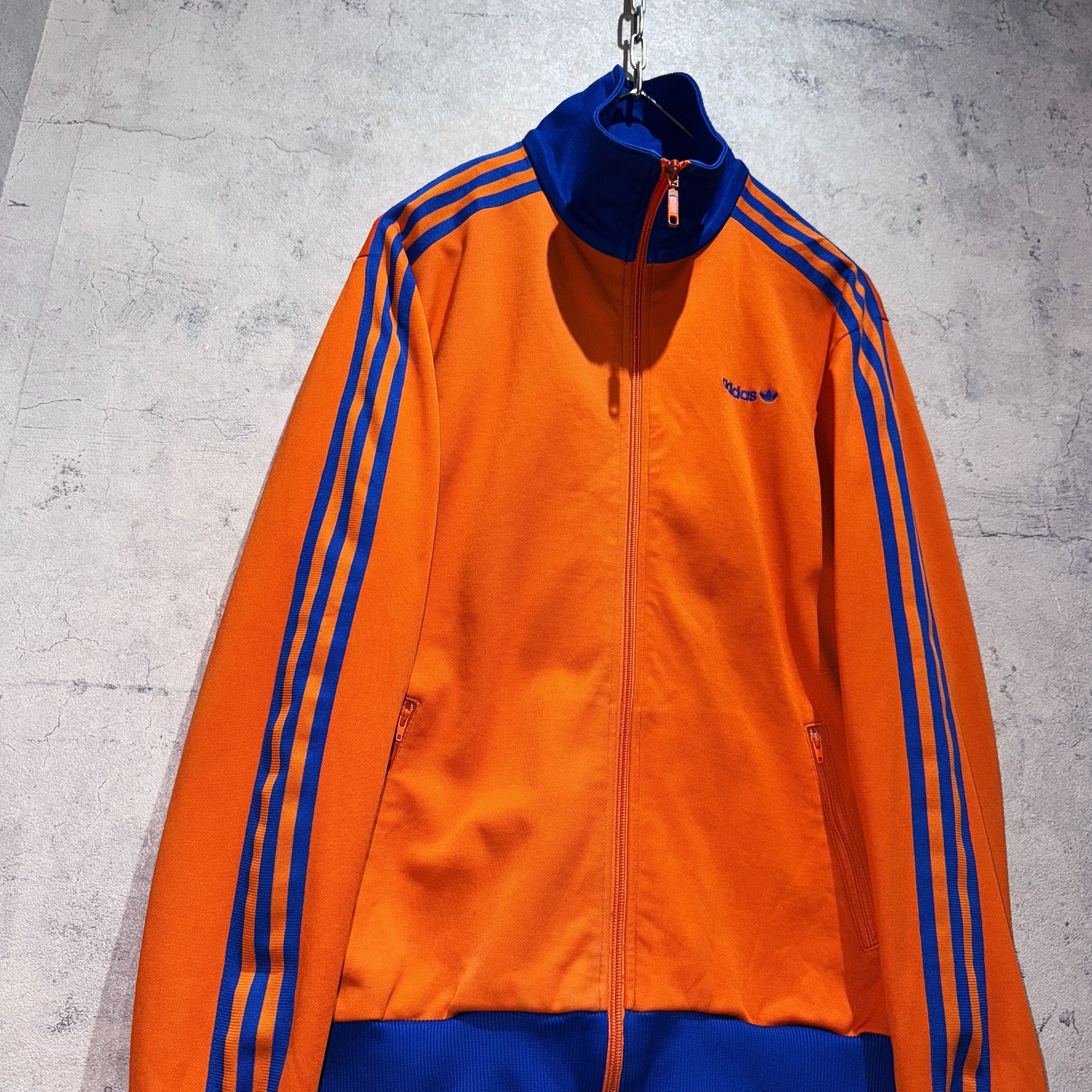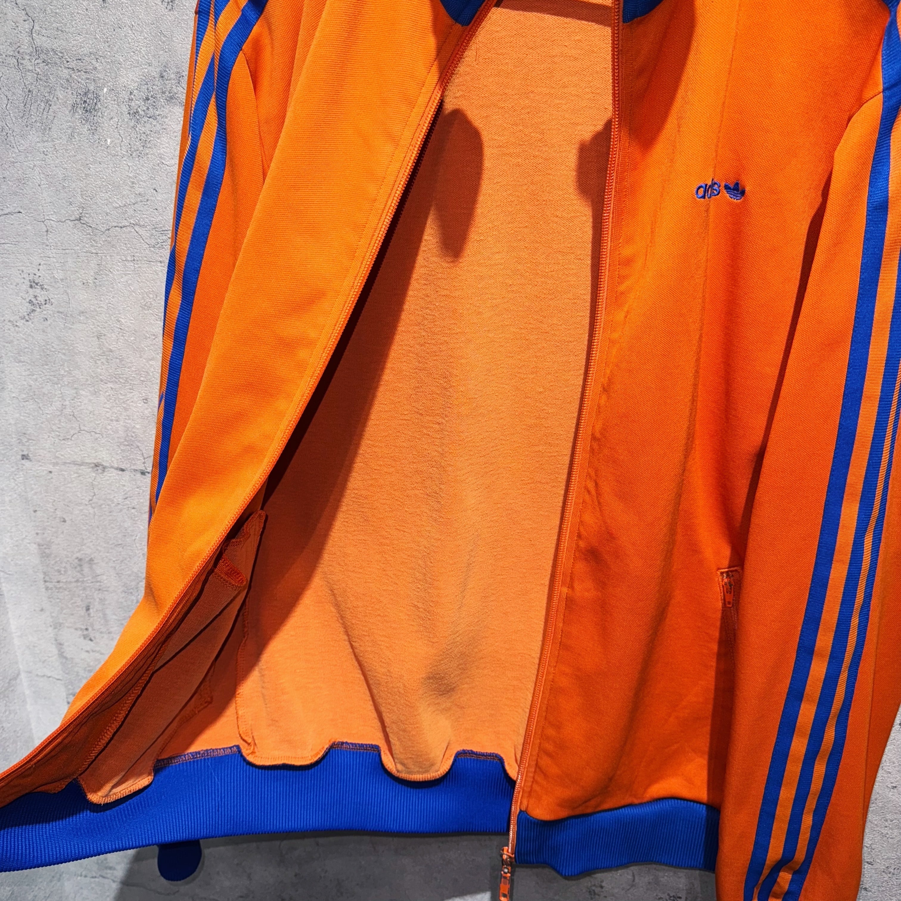 今回は希少カラー。メインカラーはオレンジで、ネックや裾、ストライプはブルーに切り替わった、カラーリングが素晴らしいトラックジャケットをベッケンバウアーモデルでご用意。