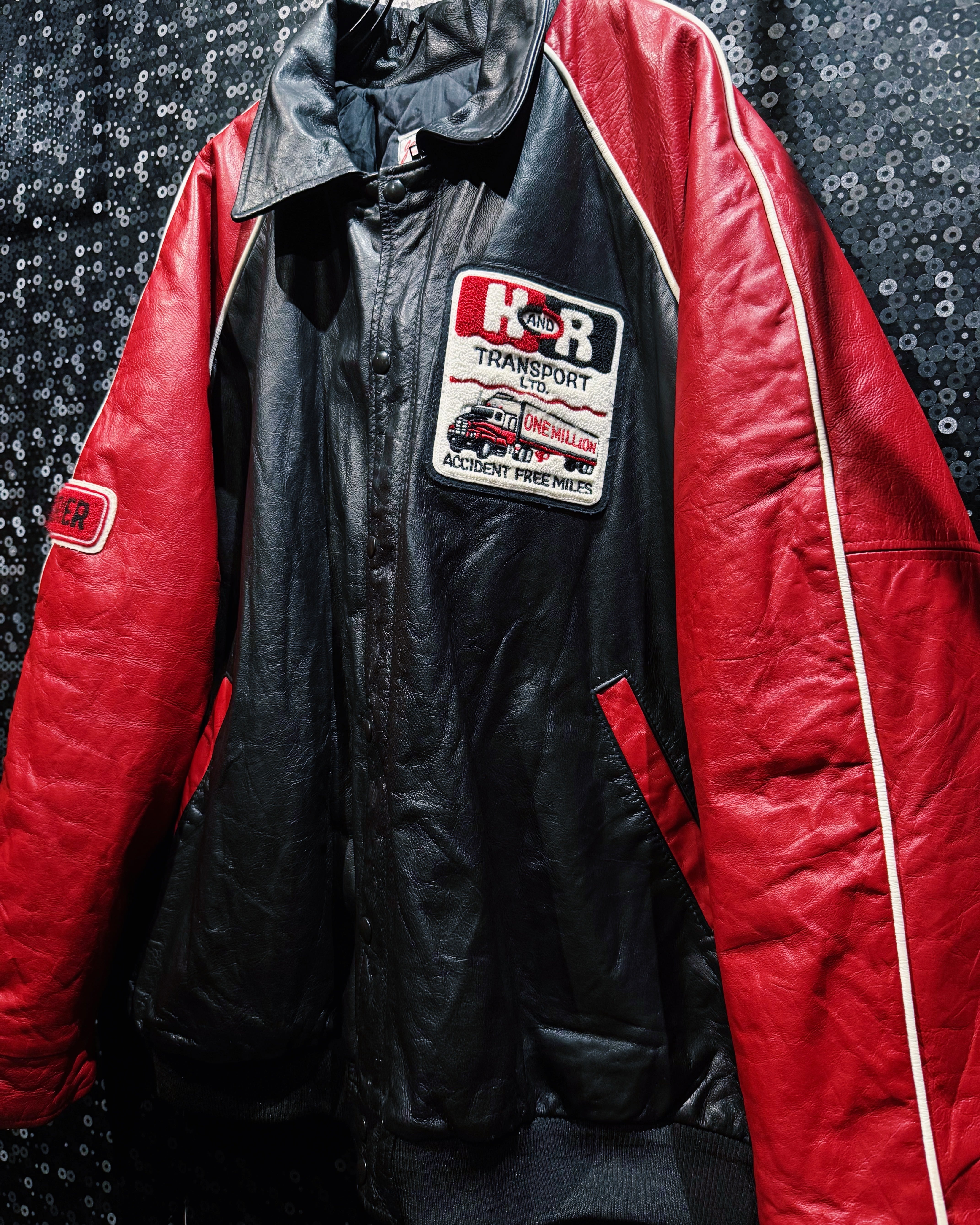 ブラックとレッドのコンビネーションが象徴的で、胸元には「H&R TRANSPORT LTD.」のワッペンが縫い付けられている。これはカナダの大手運送会社の記念パッチで、“ONE MILLION ACCIDENT FREE MILES(無事故100万マイル達成)”を祝う希少なカスタム。