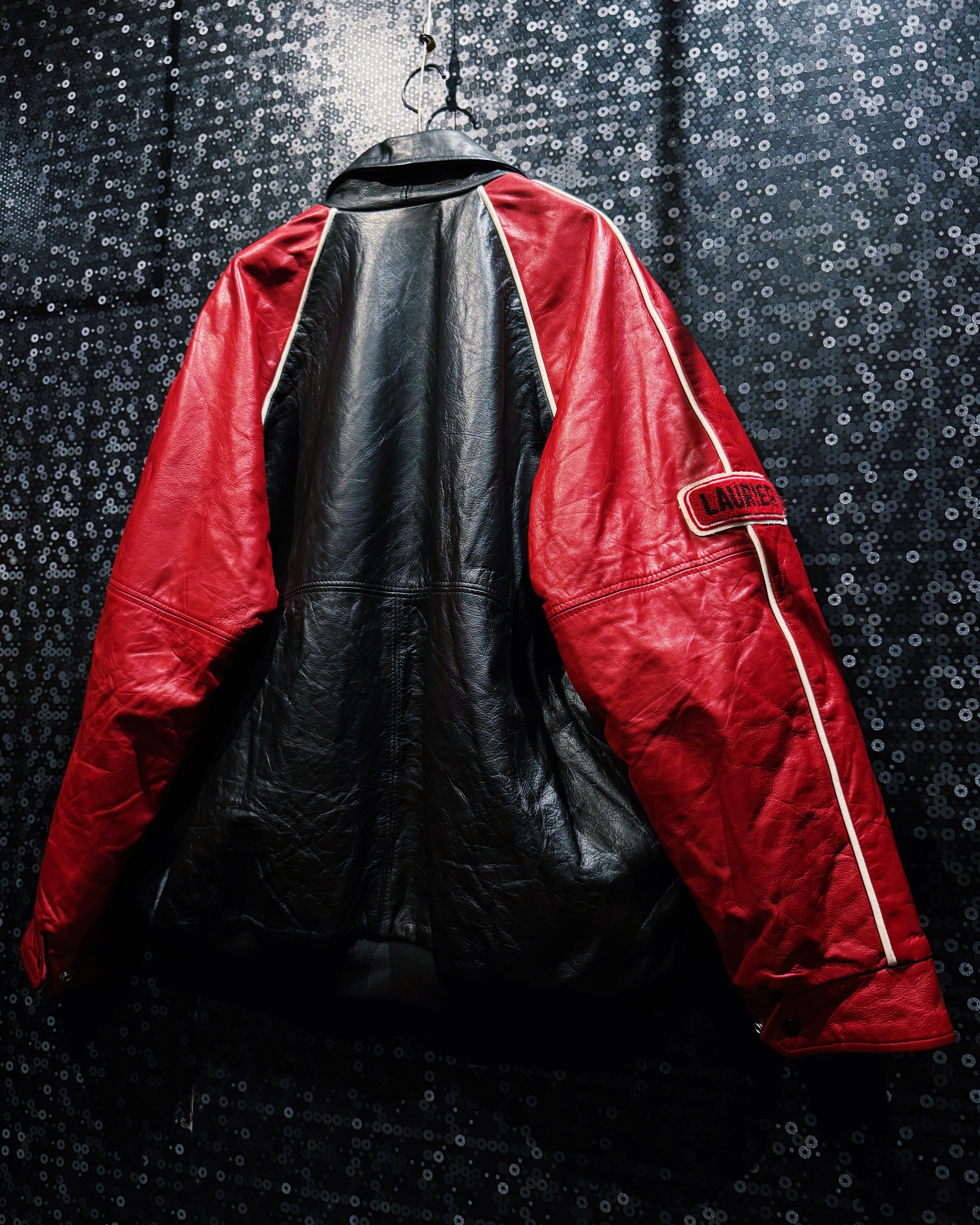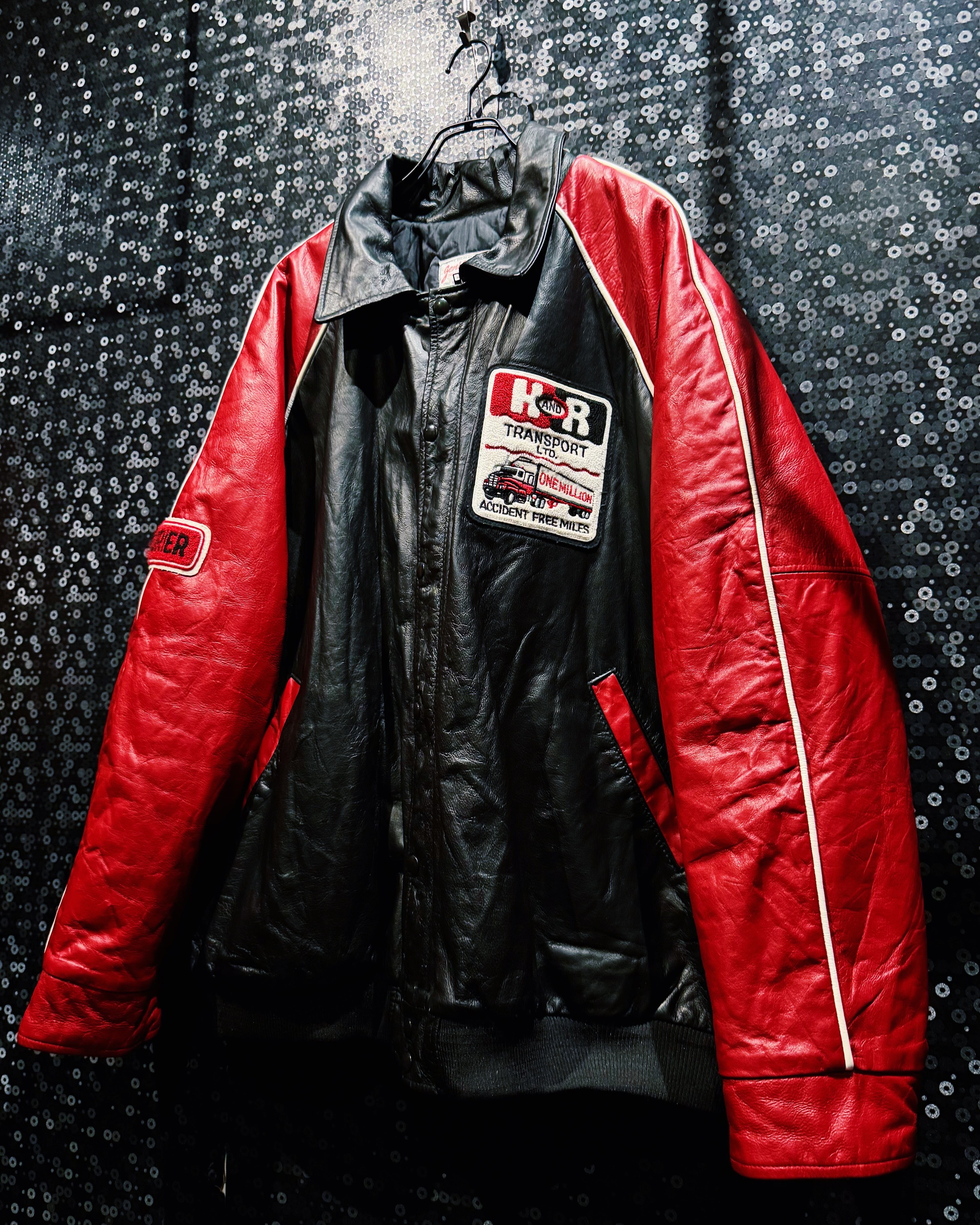 レザーは厚みがありながらも柔軟で、長年の経年変化によって独特の艶と深みを帯びている。袖のホワイトパイピングやレッドの切り替えが80〜90年代のワークレーシングスタイルを彷彿とさせ、アメカジとモーターテイストを融合した存在感抜群の一着。カナダ製ならではの重厚な作りとリアルな履歴を感じるレザージャケット。