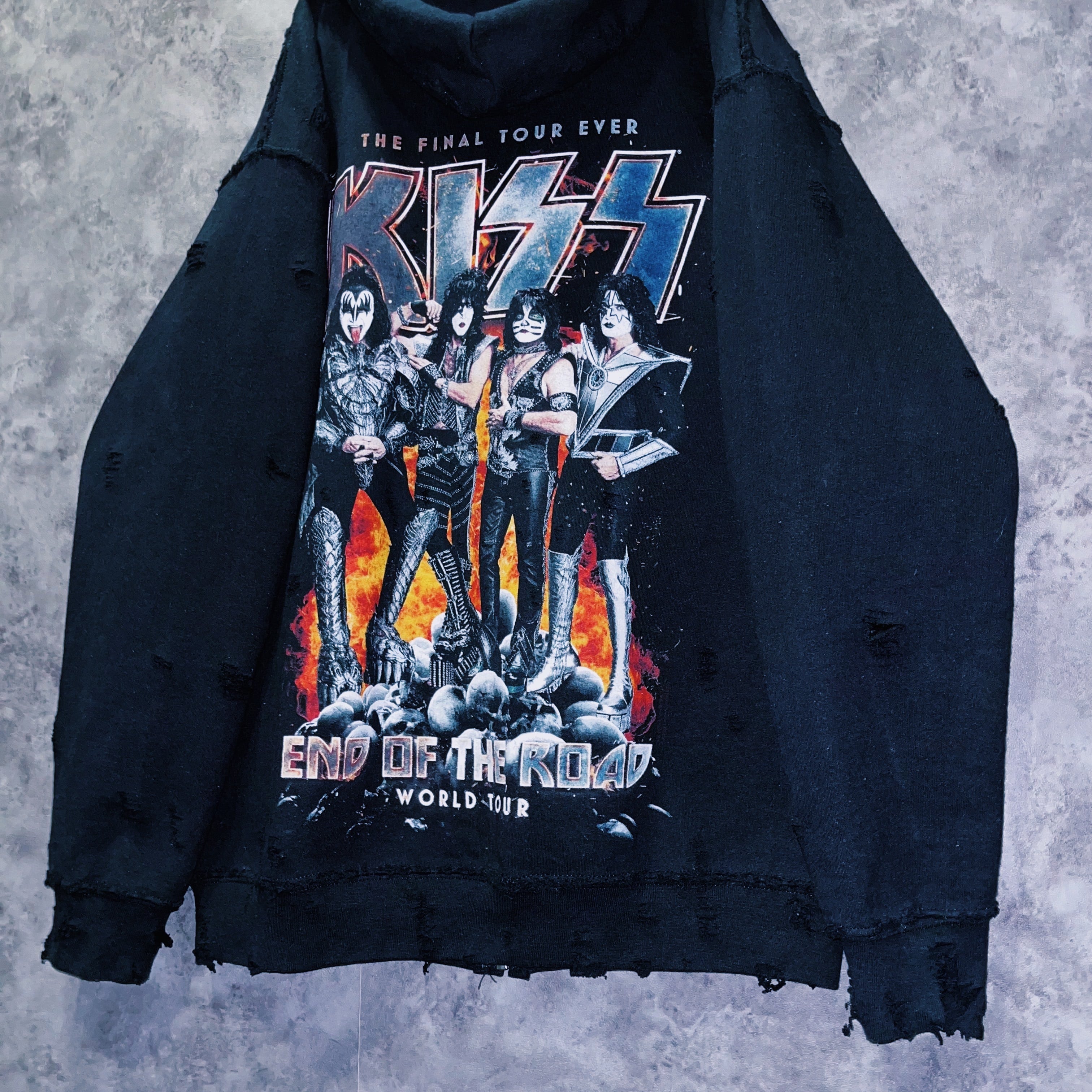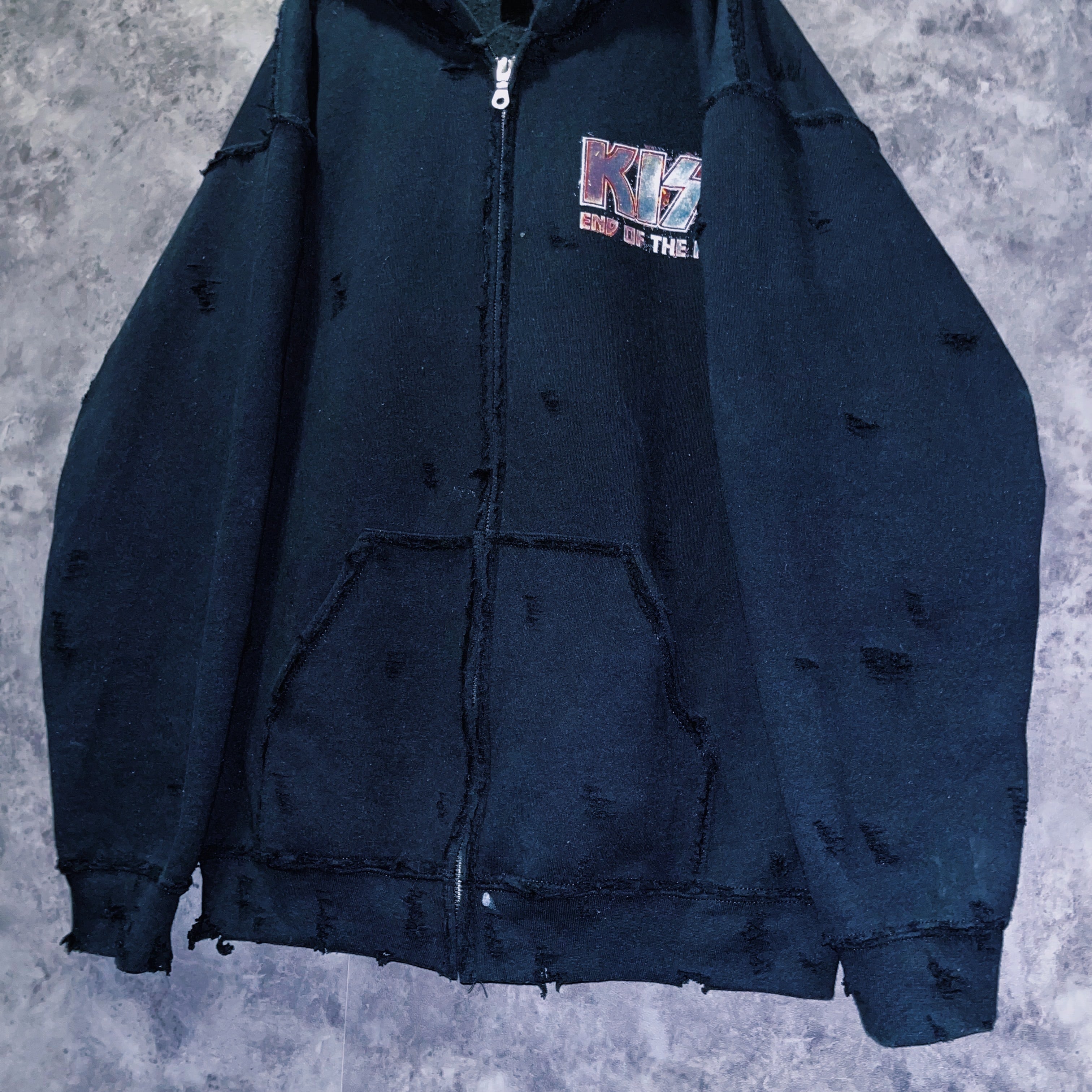 ヴィンテージ“KISS” ロゴプリントデザインボロカスタムジップアップフーディ