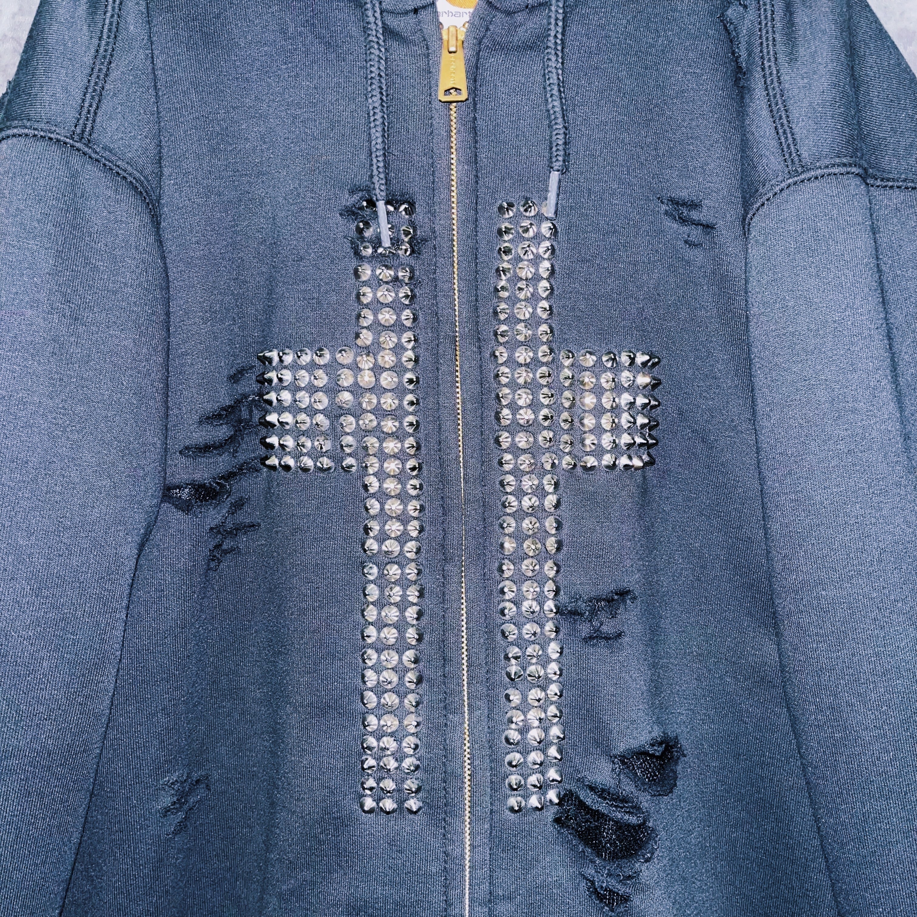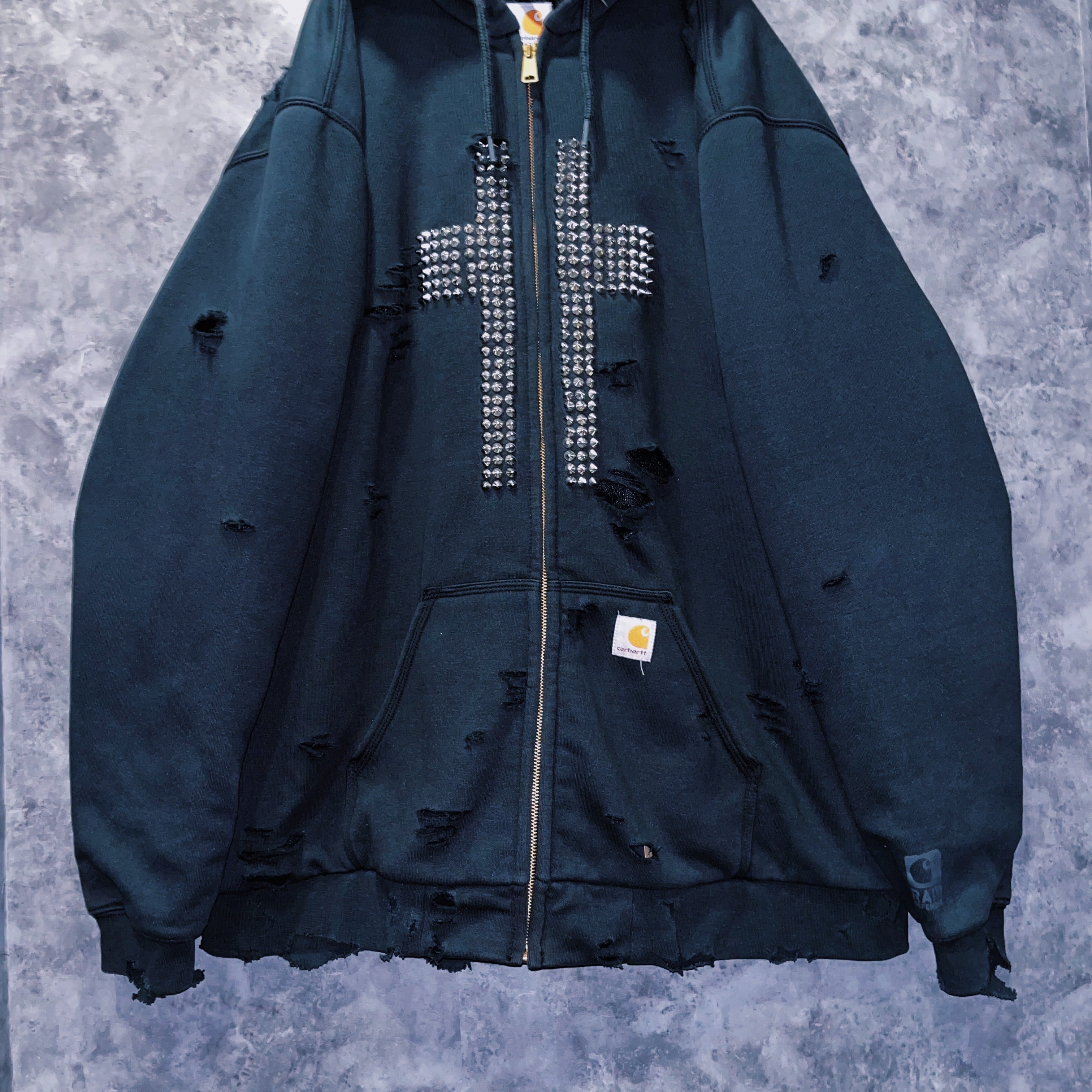そんな“Carhartt”のジップアップフーディをカスタムした一着。フロントにはギラっと光るスタッズがふんだんに使われ、十字架をデザインしたロックな仕上がりに。