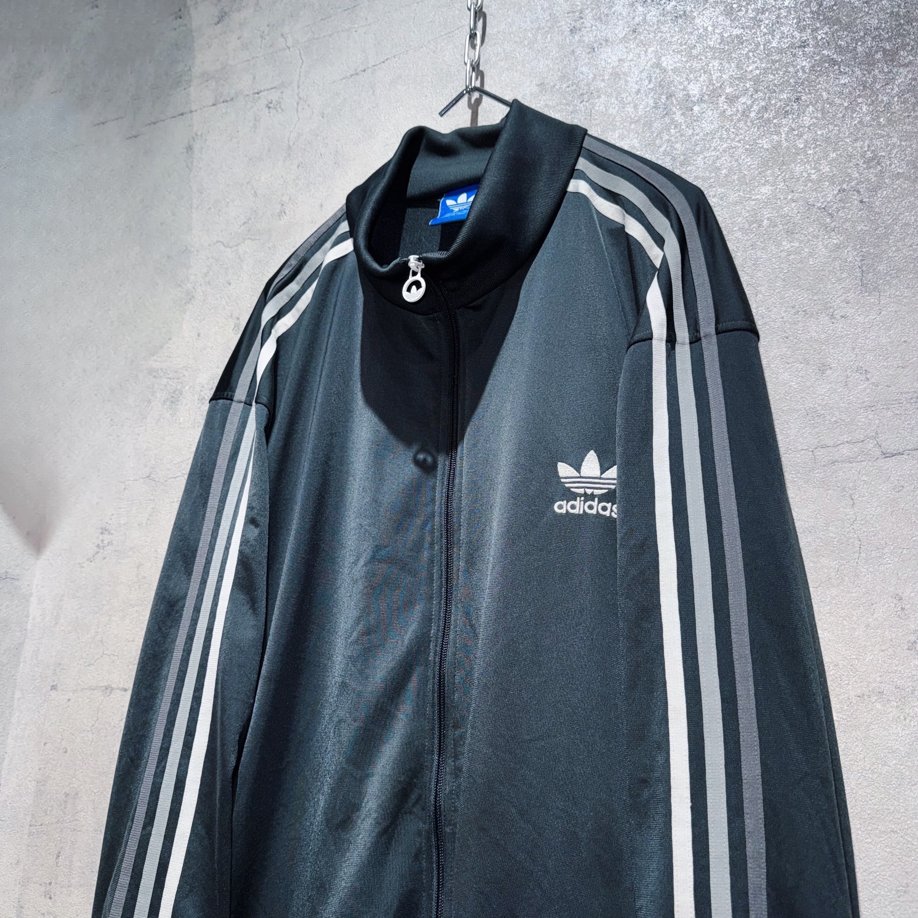 グレーのボディにアディダスの象徴である3本線とトレフォイルをあしらったトラックジャケット。