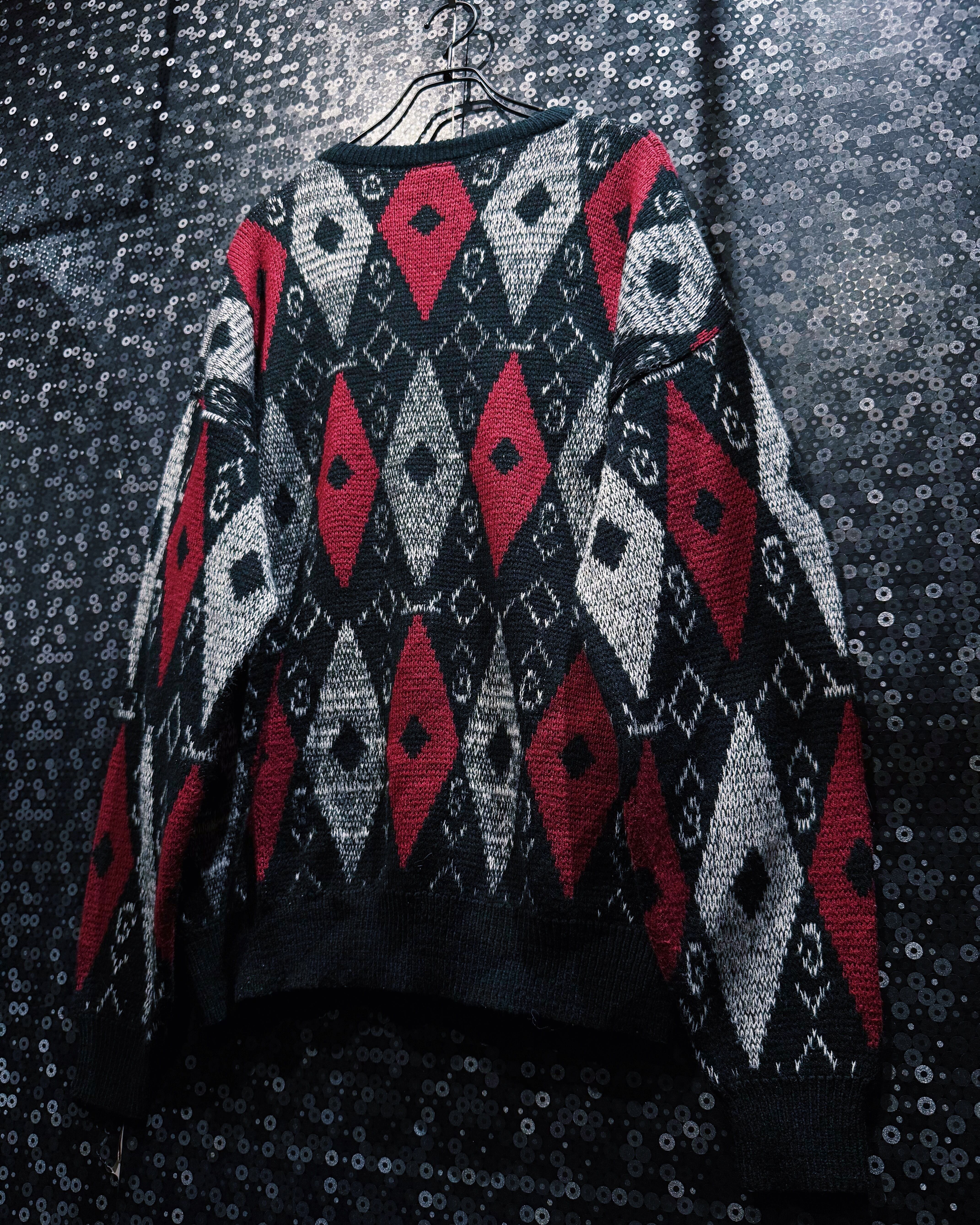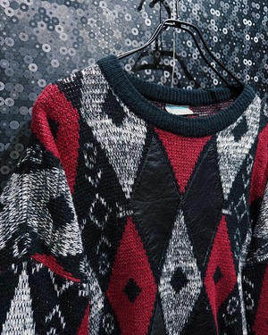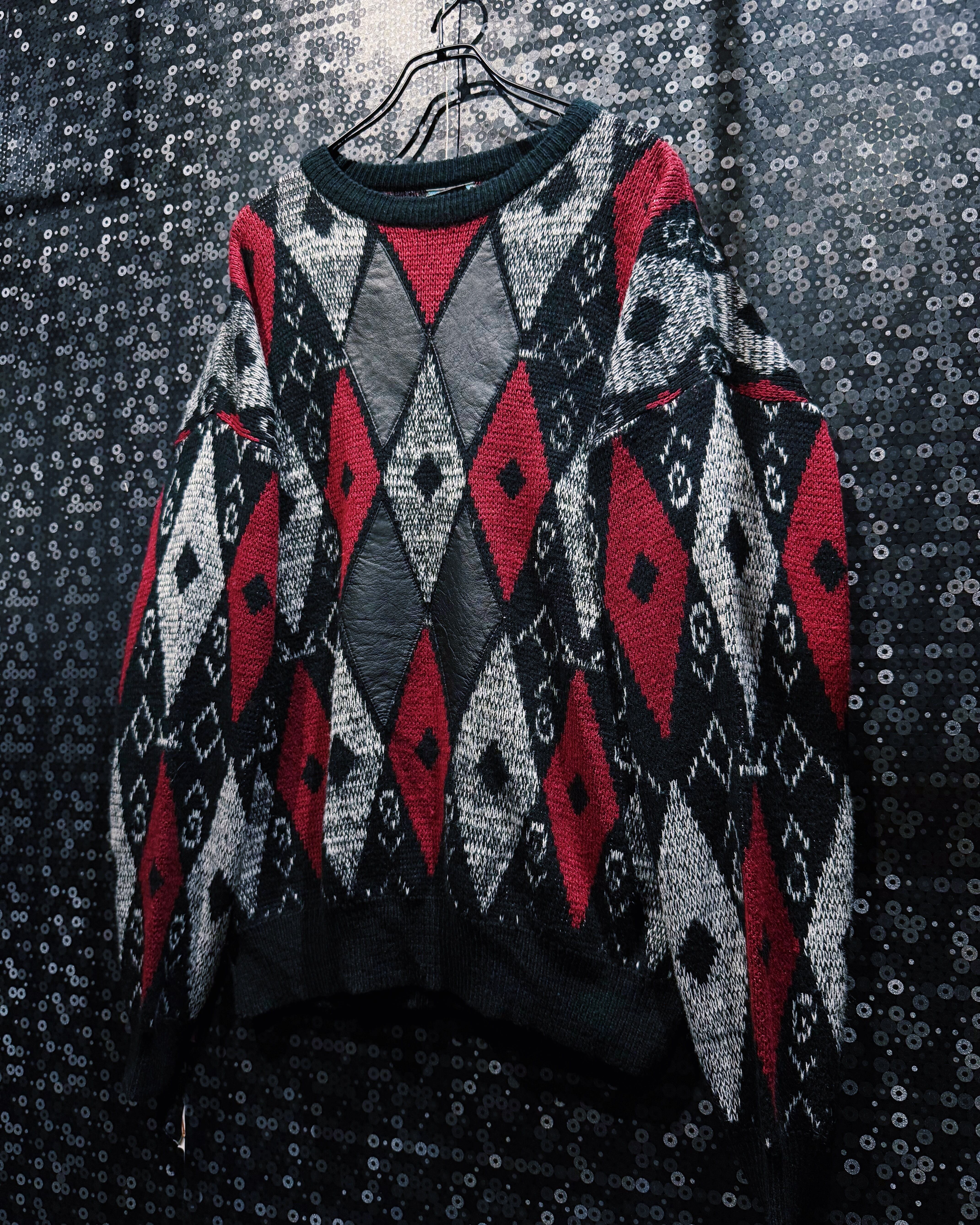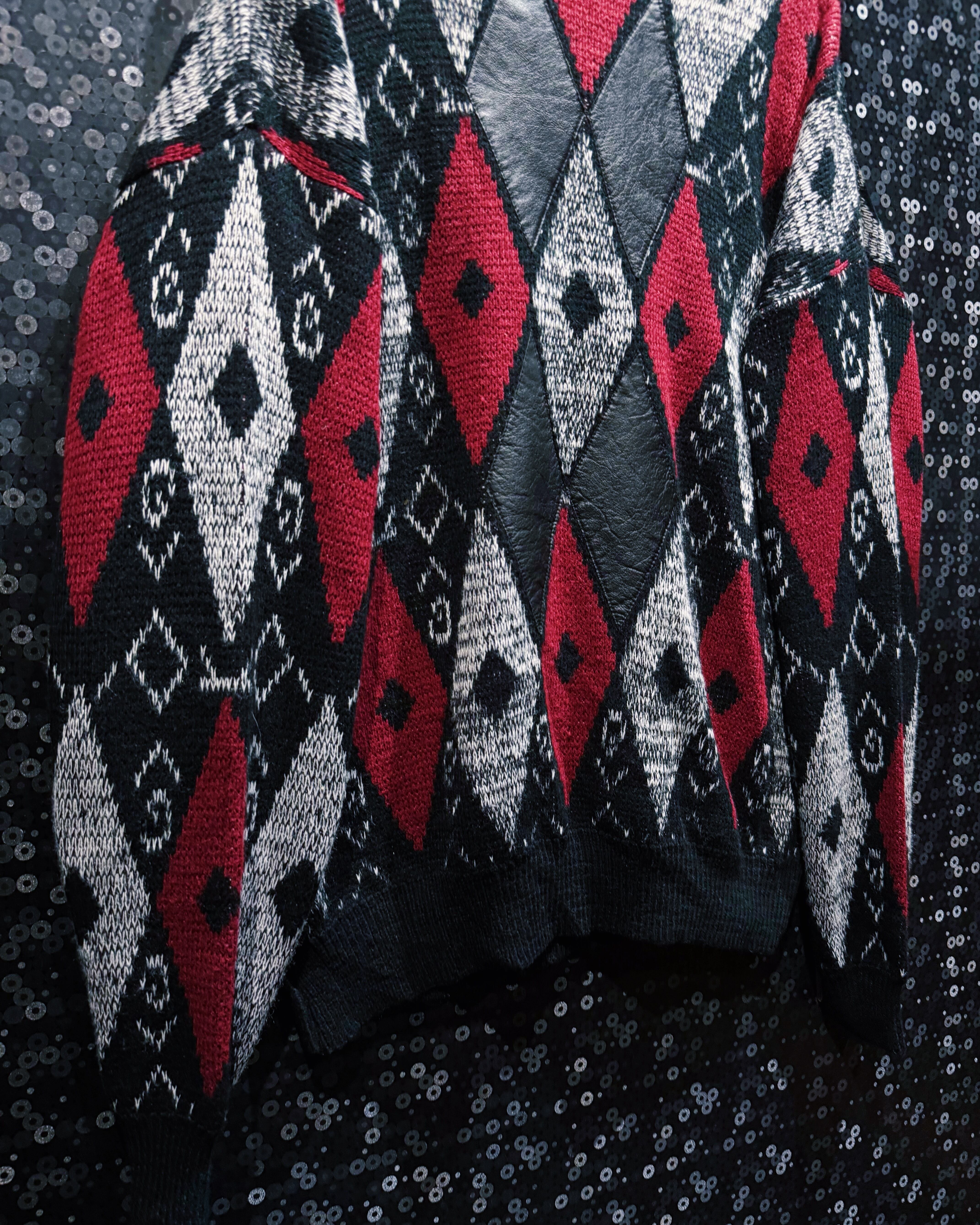 90年代PLAYBOY製のヴィンテージニット。クラシックな**アーガイル柄(Argyle pattern)をベースに、レザー生地をダイヤの一部にドッキングした非常に珍しいデザイン。