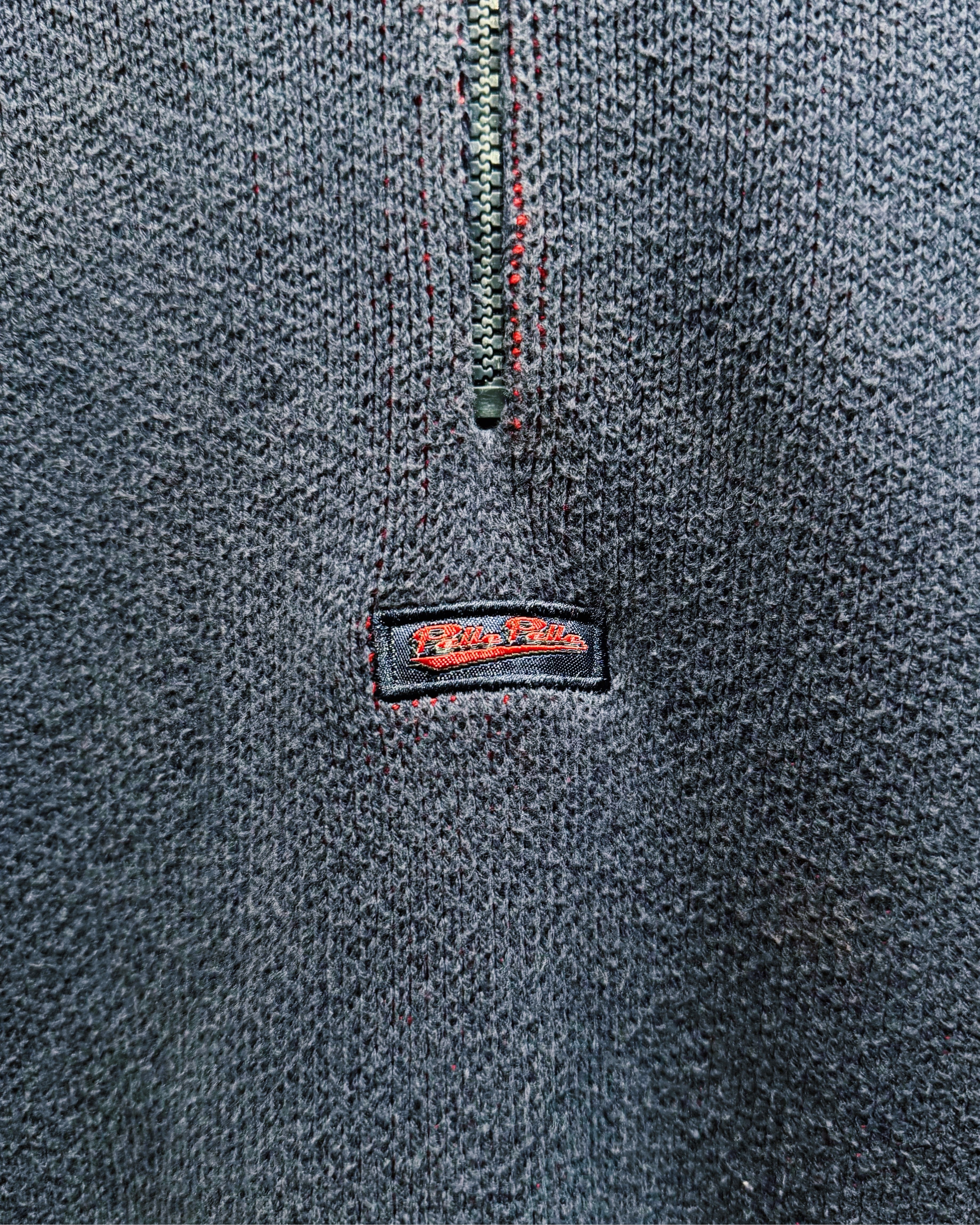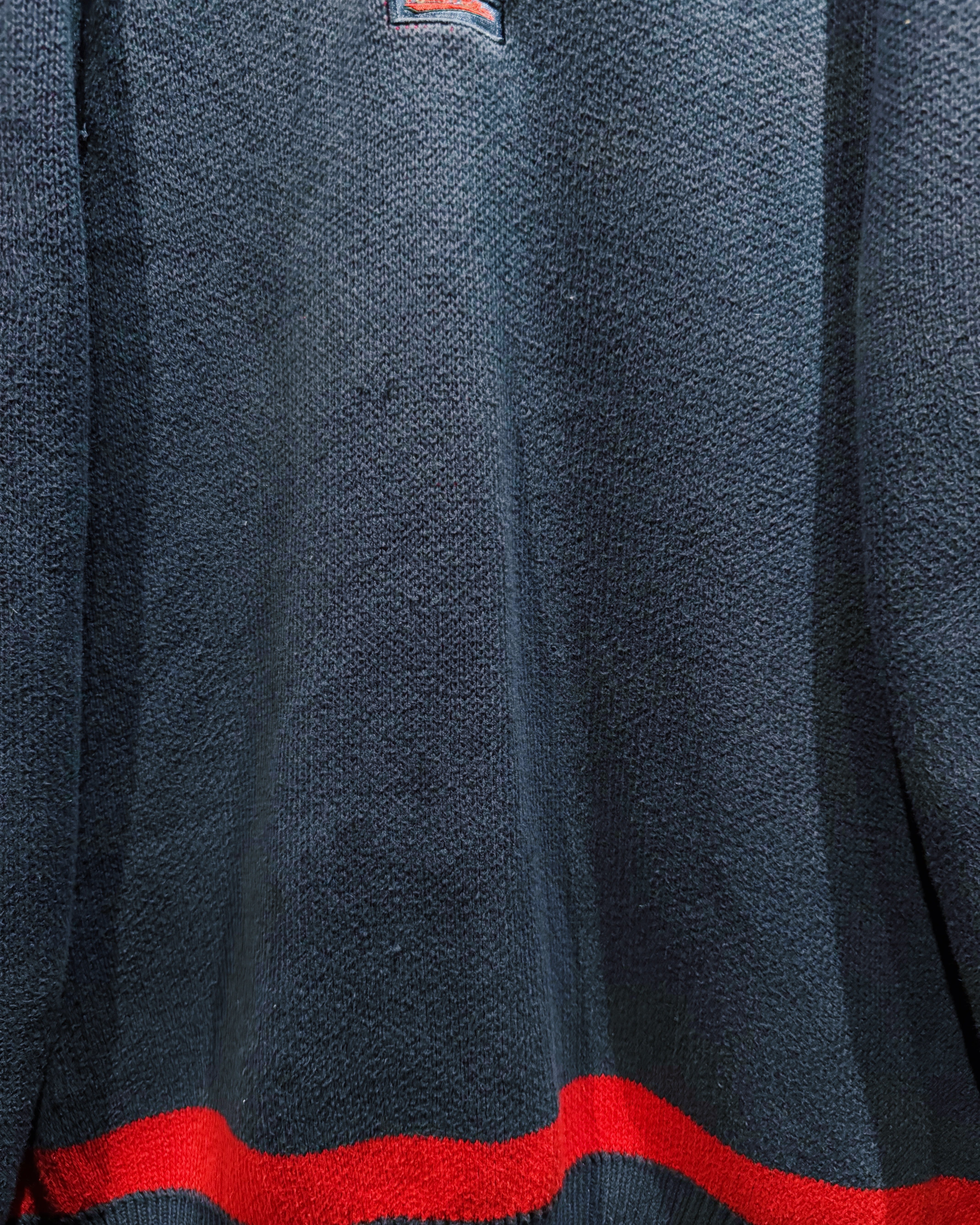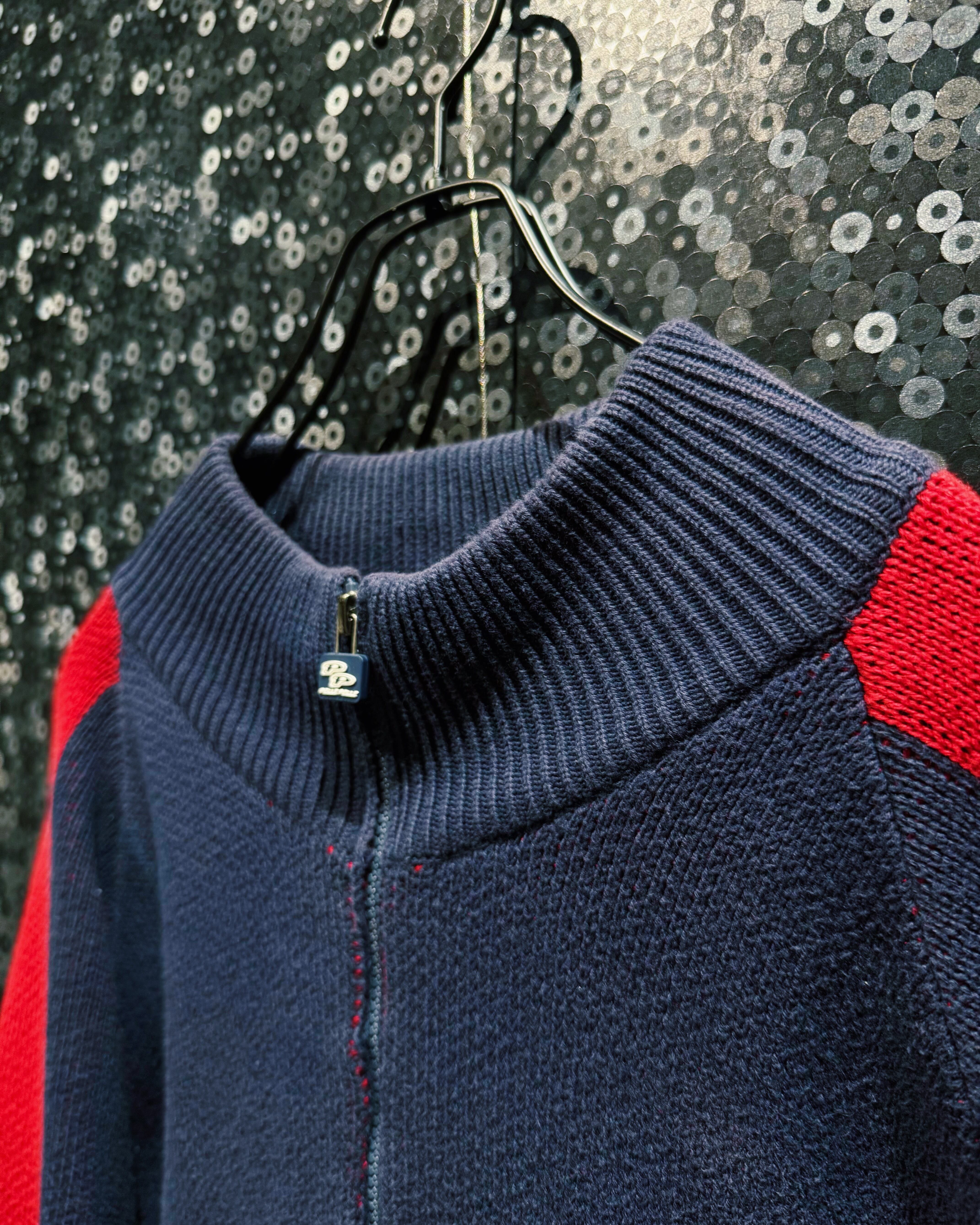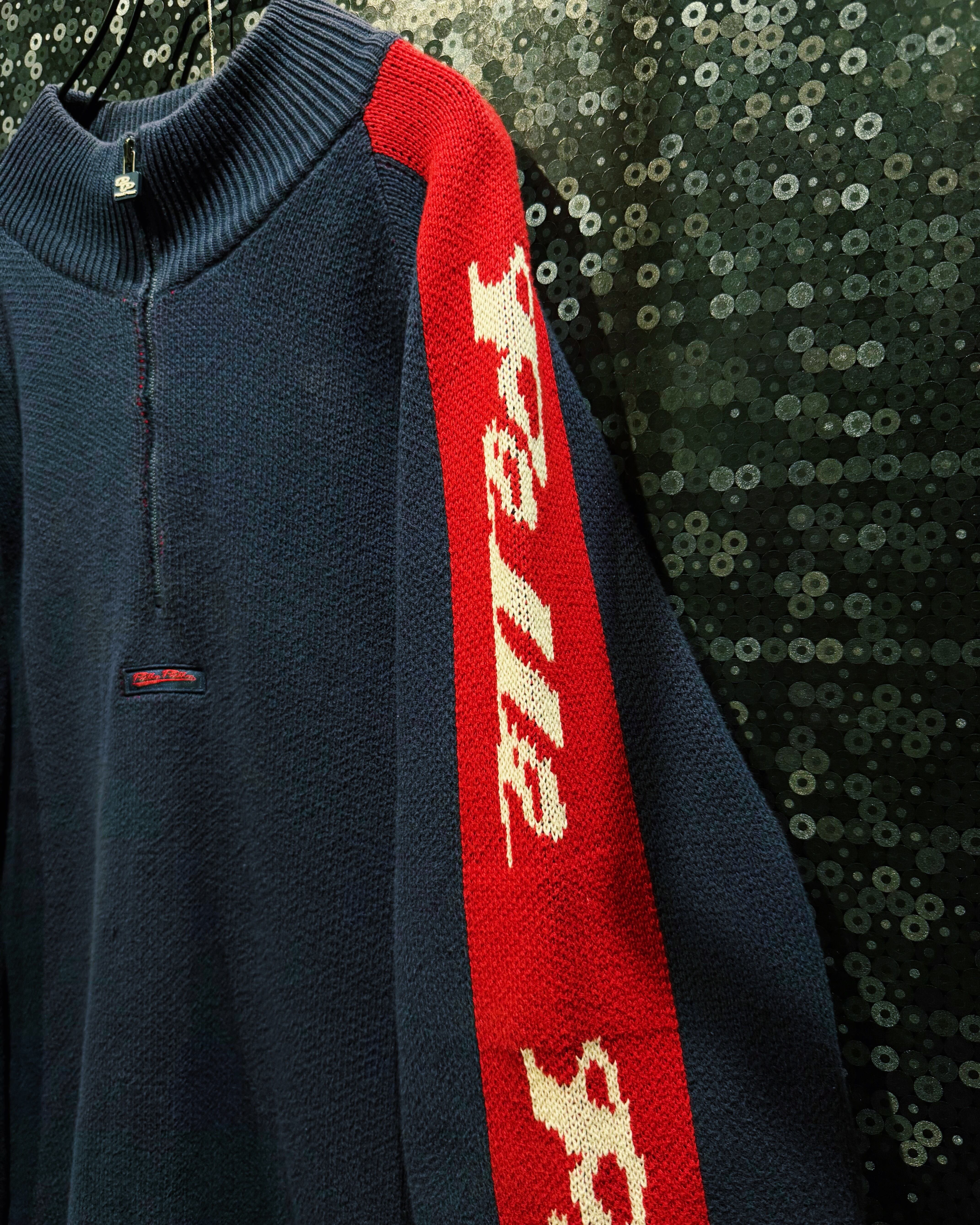 90年代を象徴するストリートブランド、**Pelle Pelle(ペレペレ)のヴィンテージハーフジップニット。ネイビー×レッドのクラシックなカラーリングに加え、袖のラインロゴと大胆なバックロゴが際立つ存在感を放つ一着。