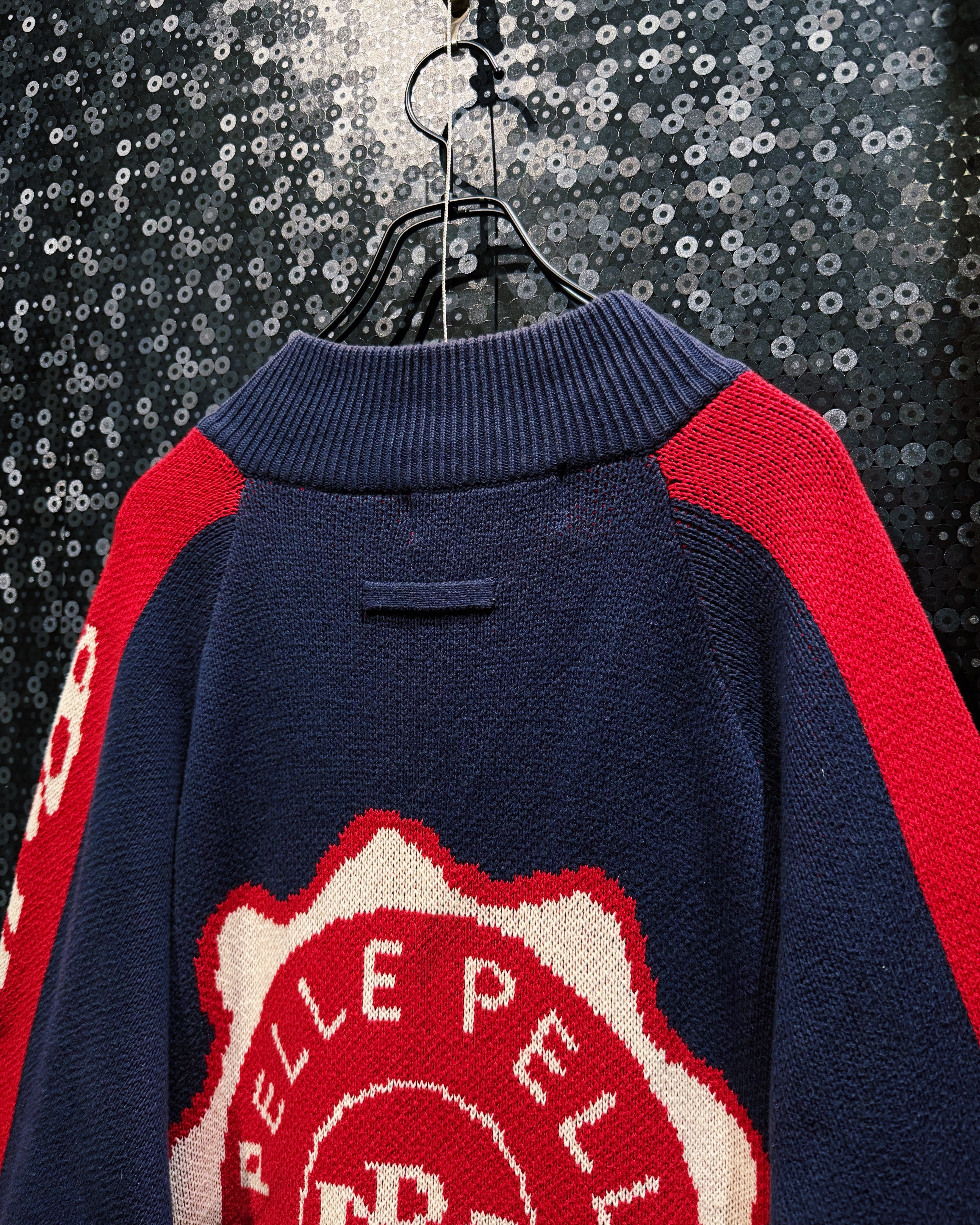 バックにはブランドの象徴的な**“PELLE PELLE JEANS CO.”のラージロゴグラフィック**がニット編みで大胆に配置され、立体感のある編み模様で表現されているのが特徴。レザージャケットやデニムでも見られる円形エンブレムをモチーフにしたデザインで、当時のペレペレ特有の“ストリート×ラグジュアリー”な美学が表現されている。
