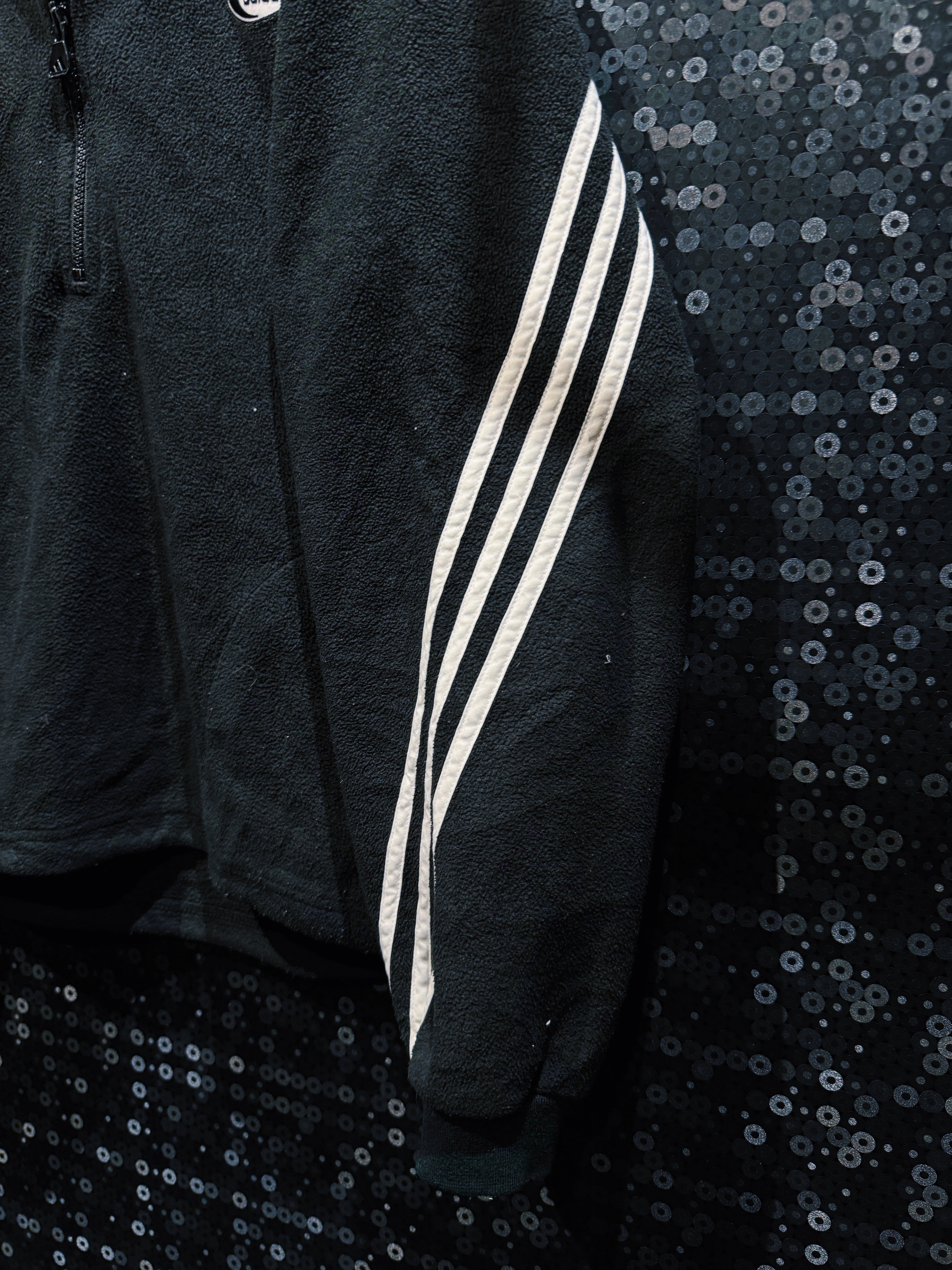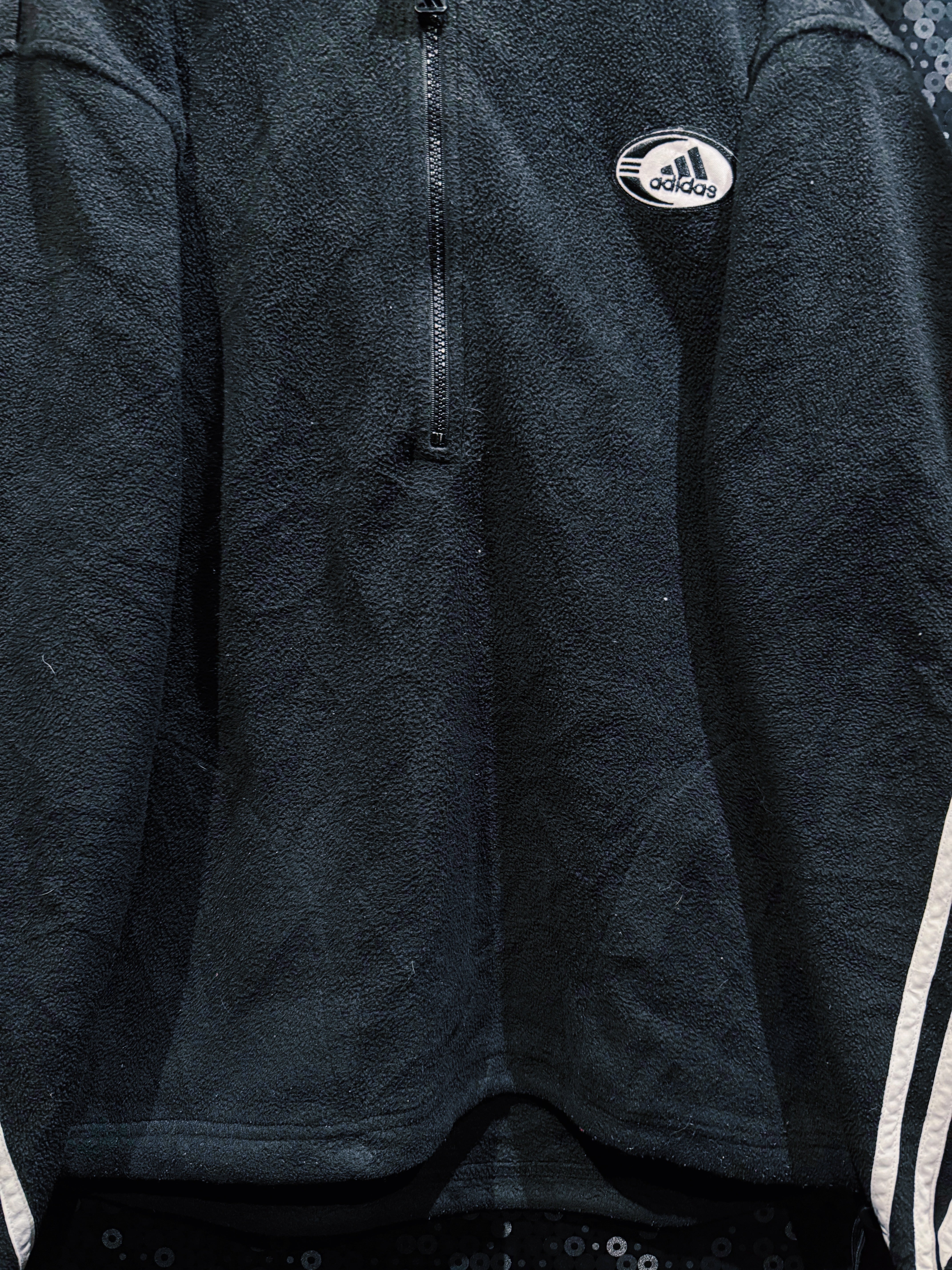 90年代後期〜2000年代初期のヴィンテージadidasハーフジップトラックジャケット。ブラックをベースに、両袖へと走るホワイトのスリーストライプ、胸元には楕円ロゴタイプのパフォーマンスロゴ刺繍を配したクラシックな一着。トレフォイルからパフォーマンスへとロゴ移行が進む過渡期のモデルで、当時のadidasスポーツウェア特有のストイックなデザインが魅力。