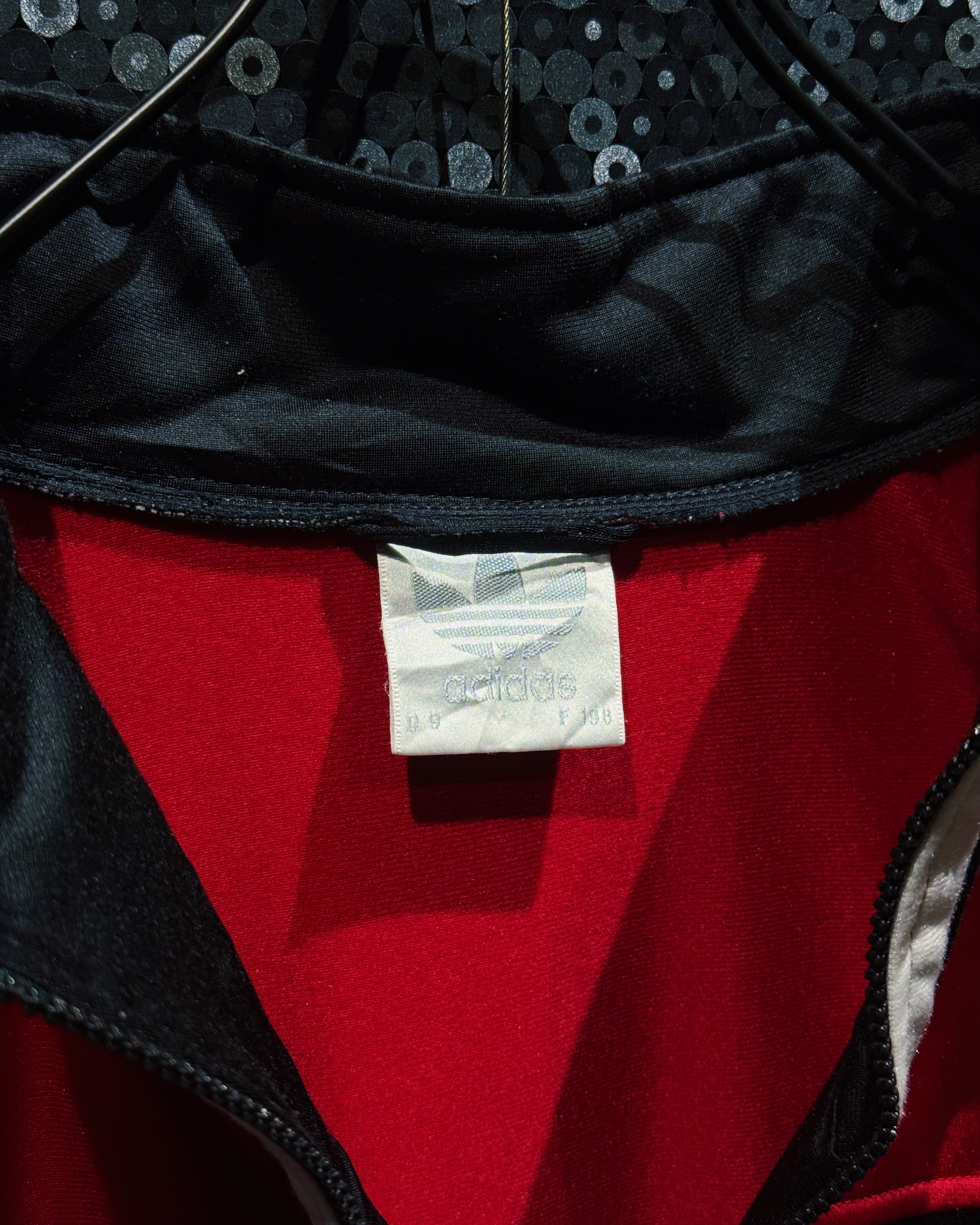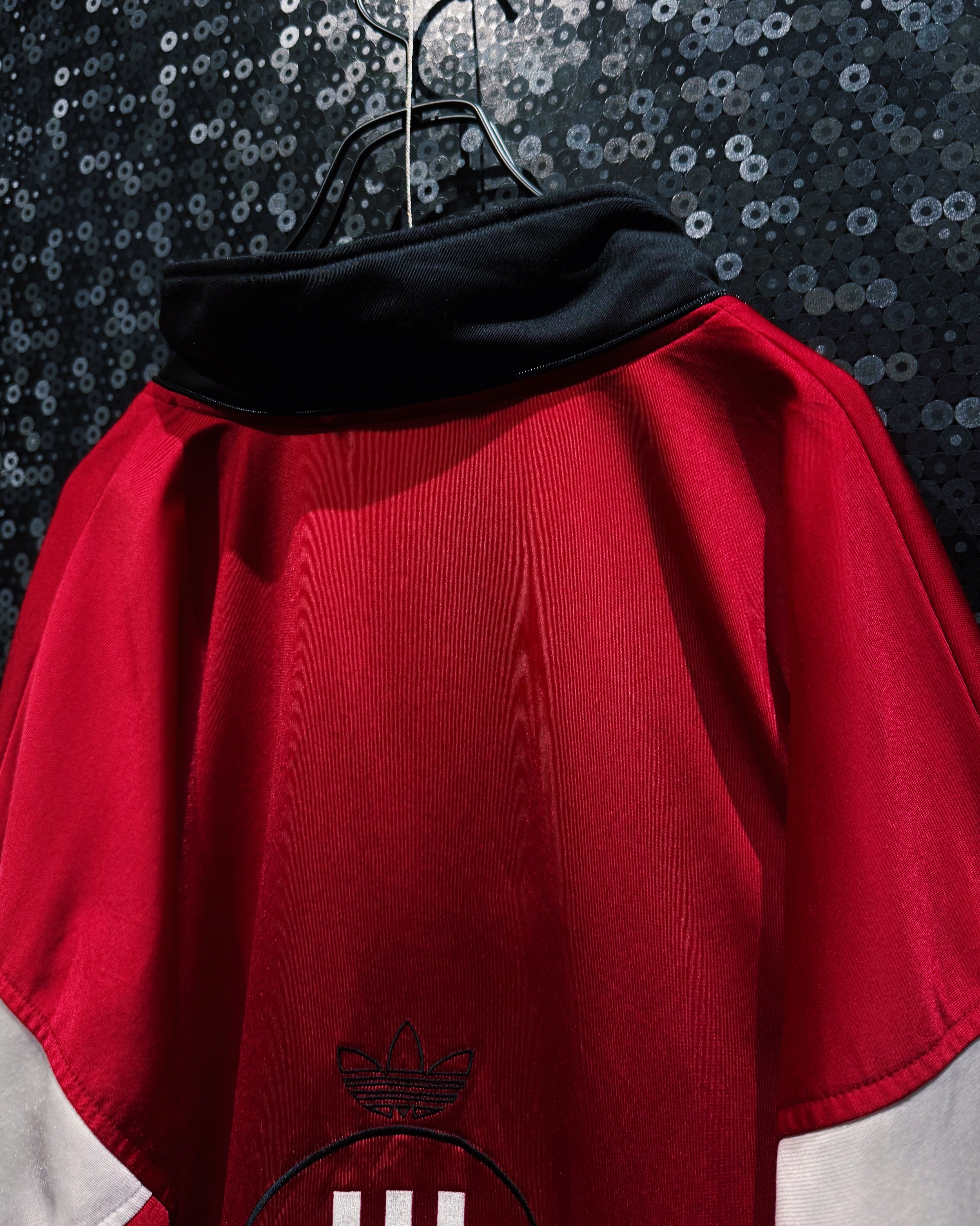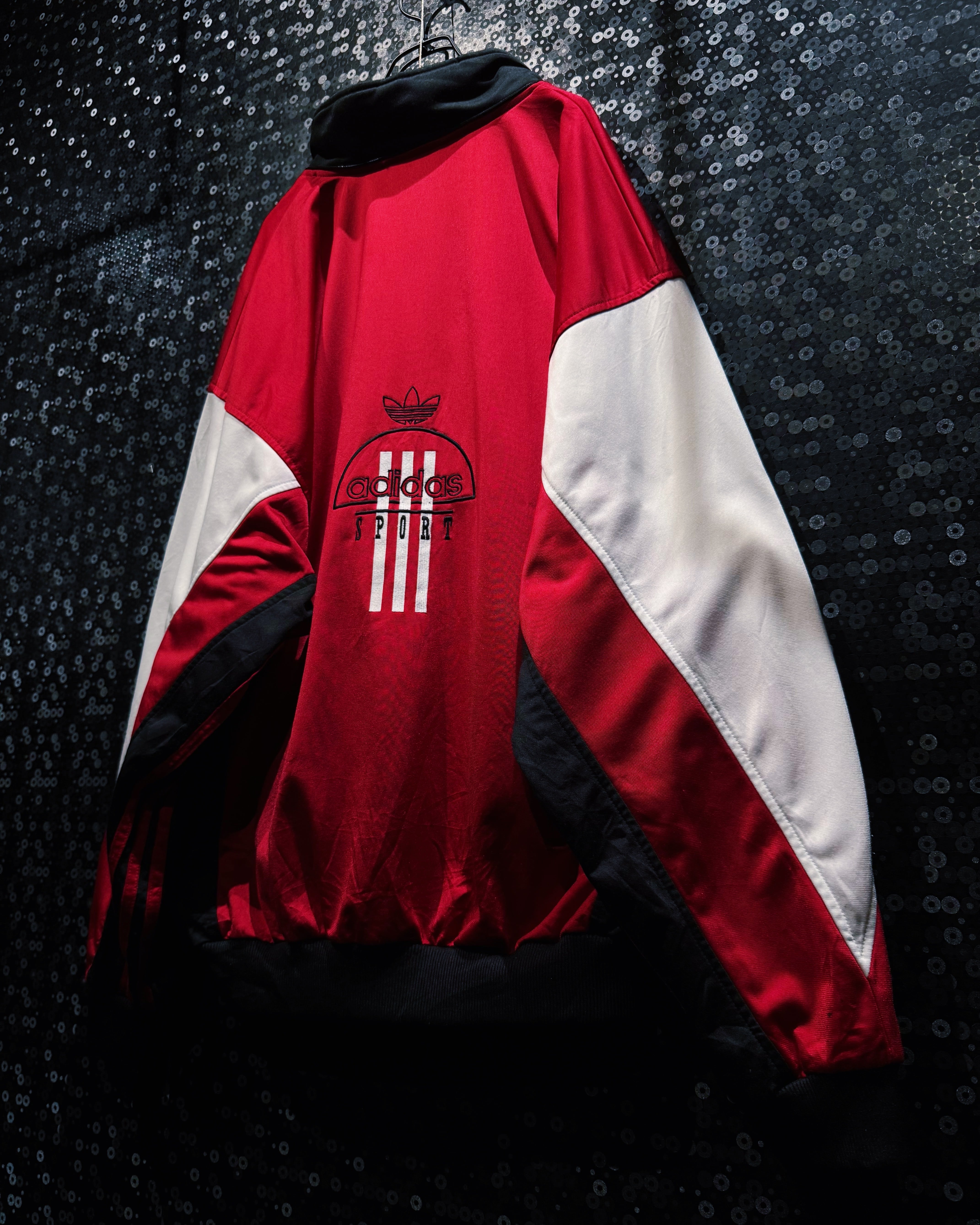 深みのあるブラックをベースに、鮮やかなレッドとホワイトを大胆に切り替えたカラーブロッキングが印象的な一着。胸元には半円アーチの中に3本ラインとadidasロゴを組み合わせた刺繍ロゴが施されており、当時の“SPORT”サブライン特有のデザインディテールを象徴している。