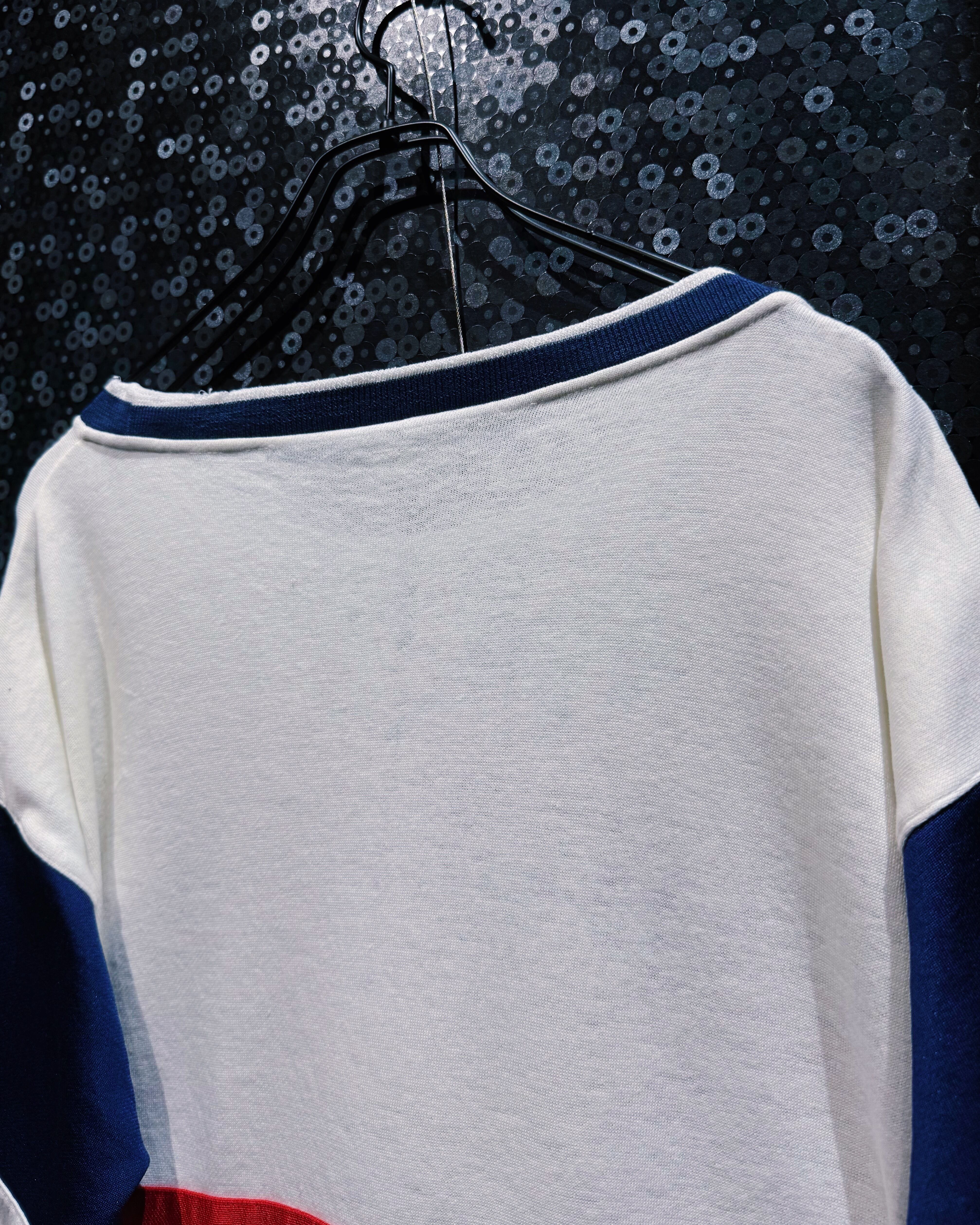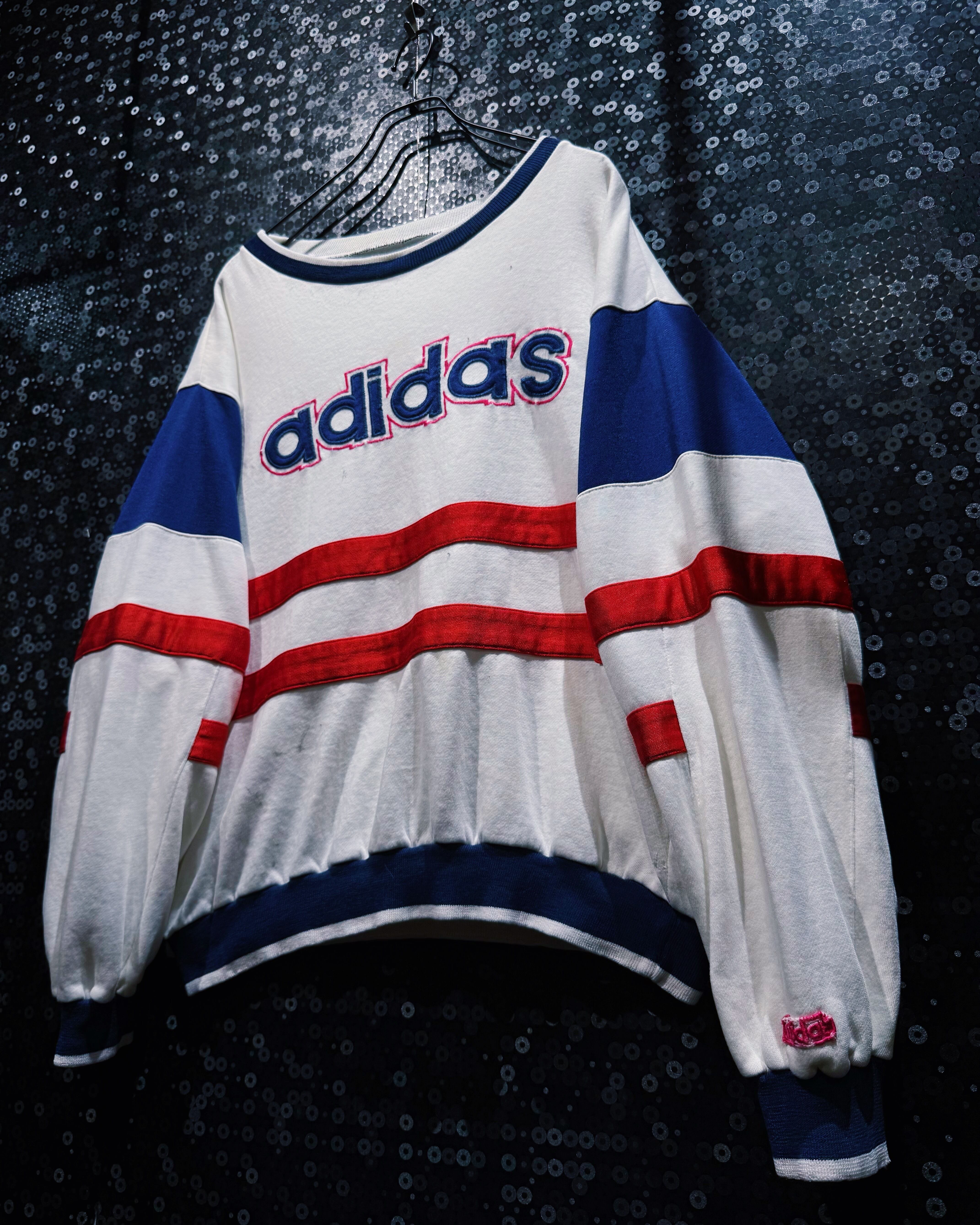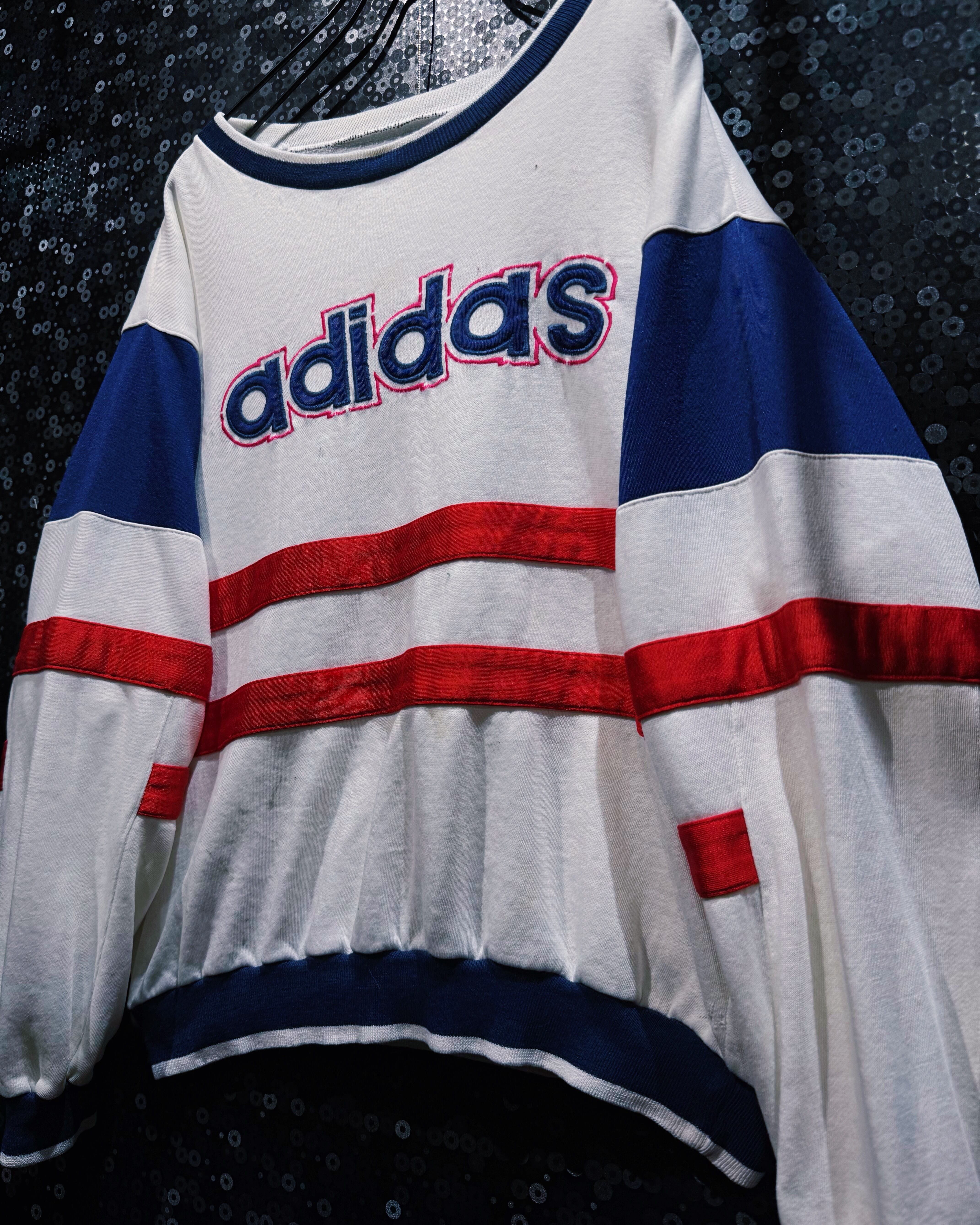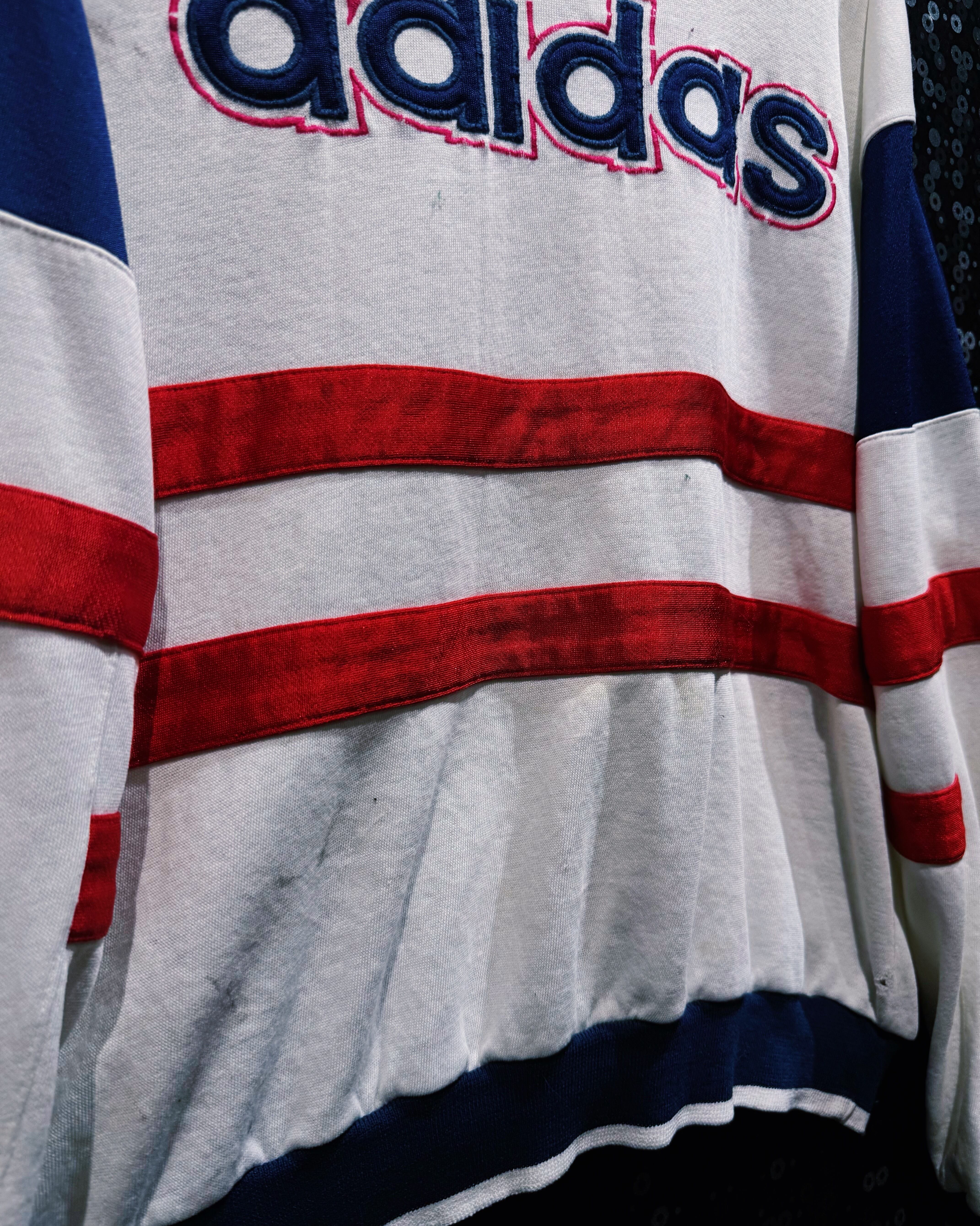 80〜90年代頃のヴィンテージadidasスウェット。ホワイトをベースに、鮮やかなレッドとロイヤルブルーのラインを組み合わせたクラシックなカラーブロッキングが印象的な一着。