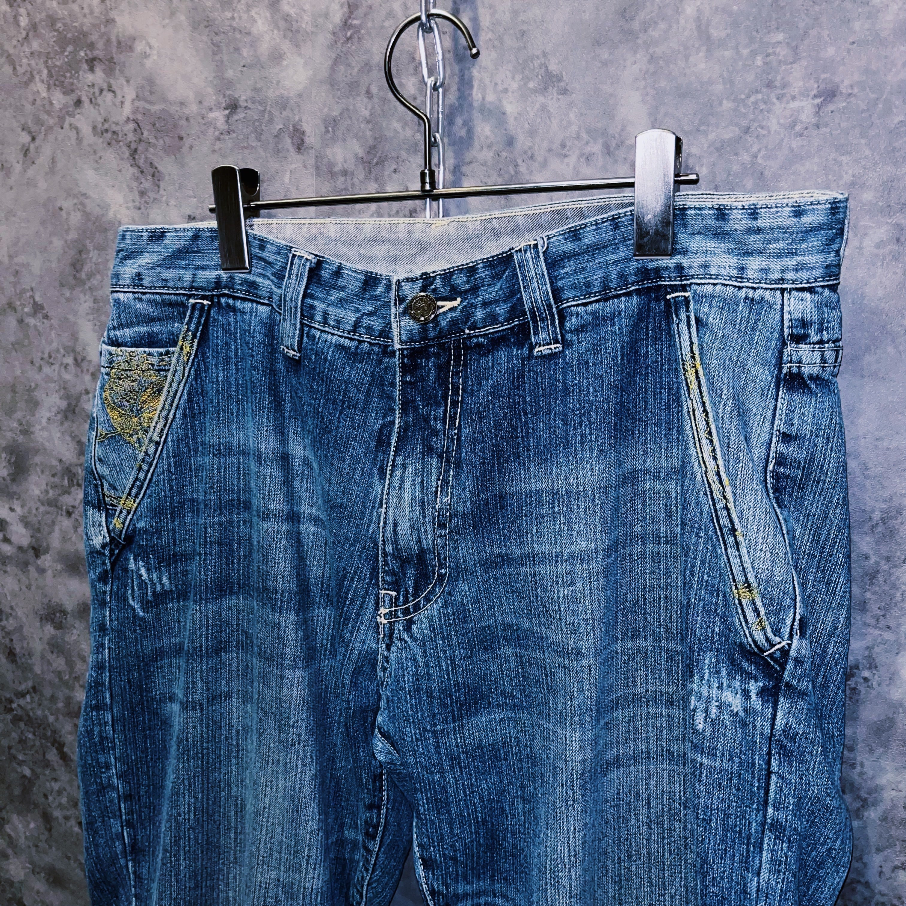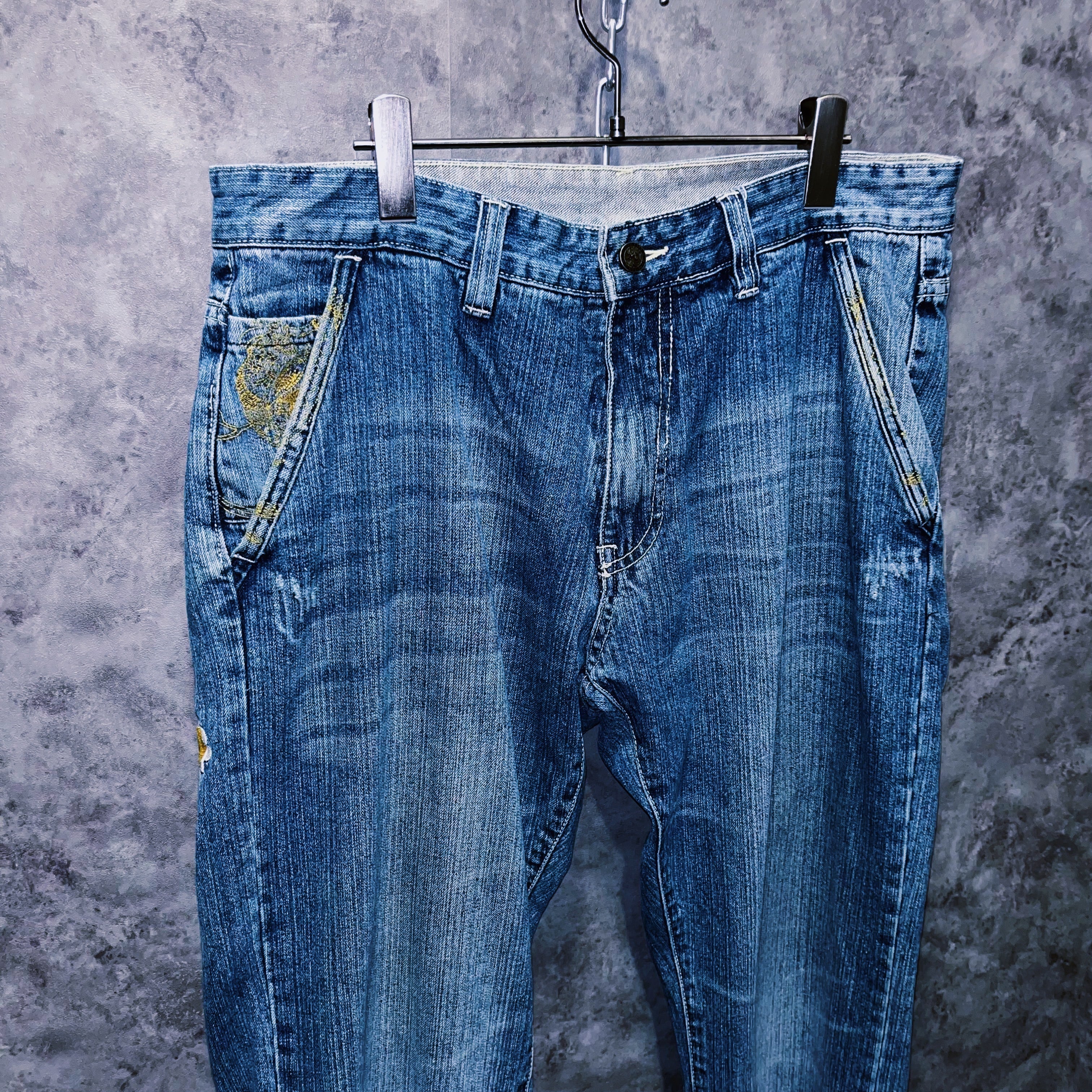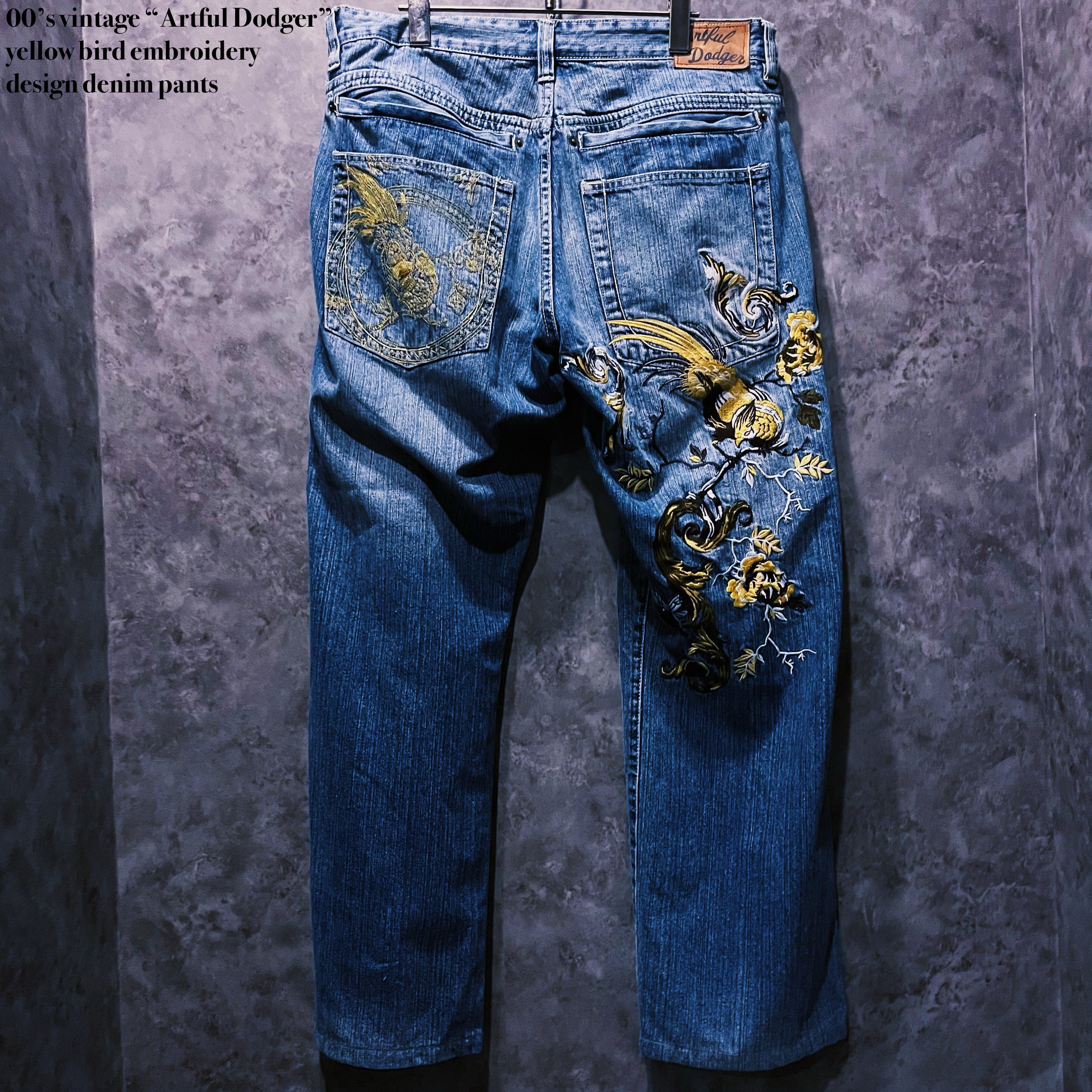 00‘sヴィンテージ“Artful Dodger”イエローバードエンブロイダリーデザインデニムパンツ