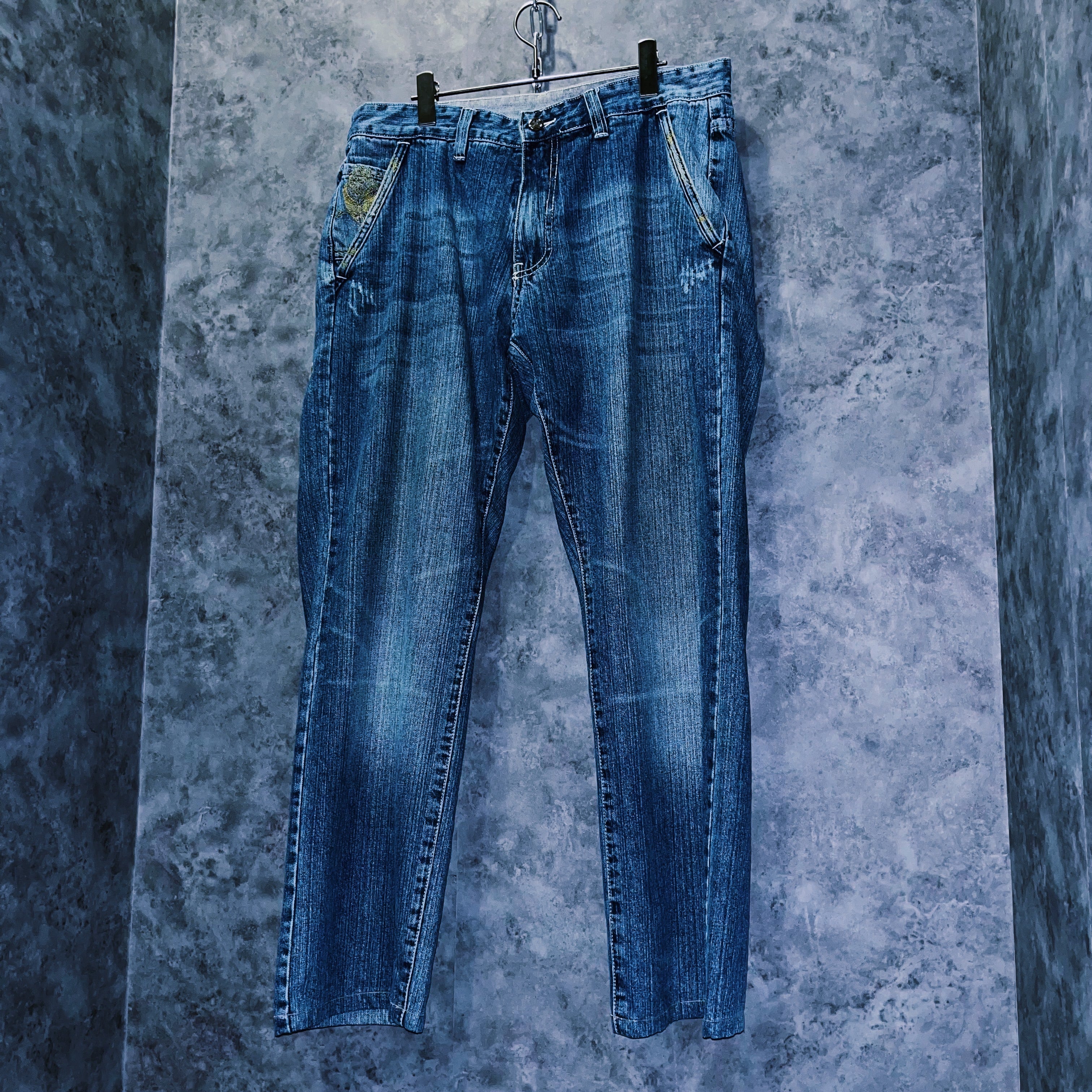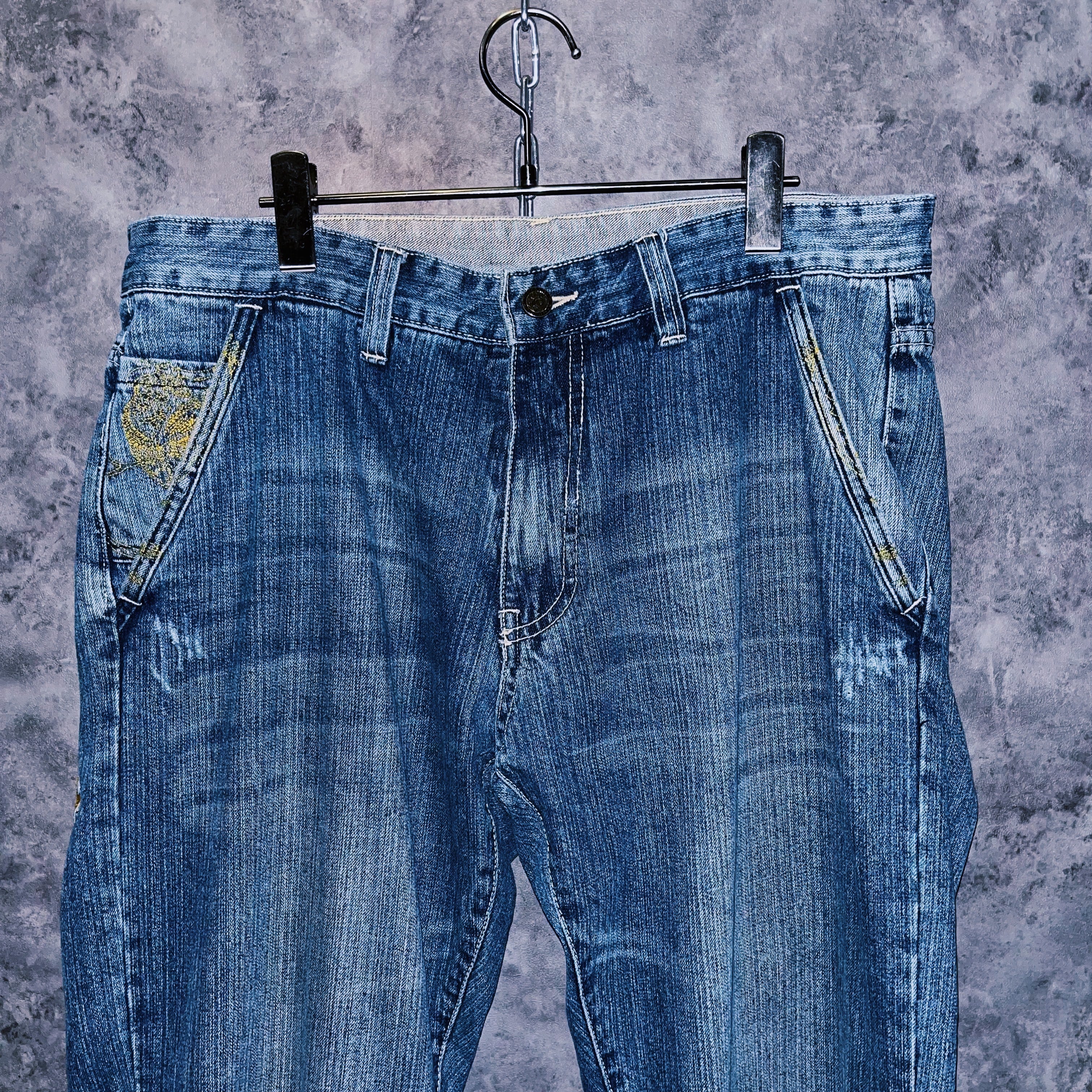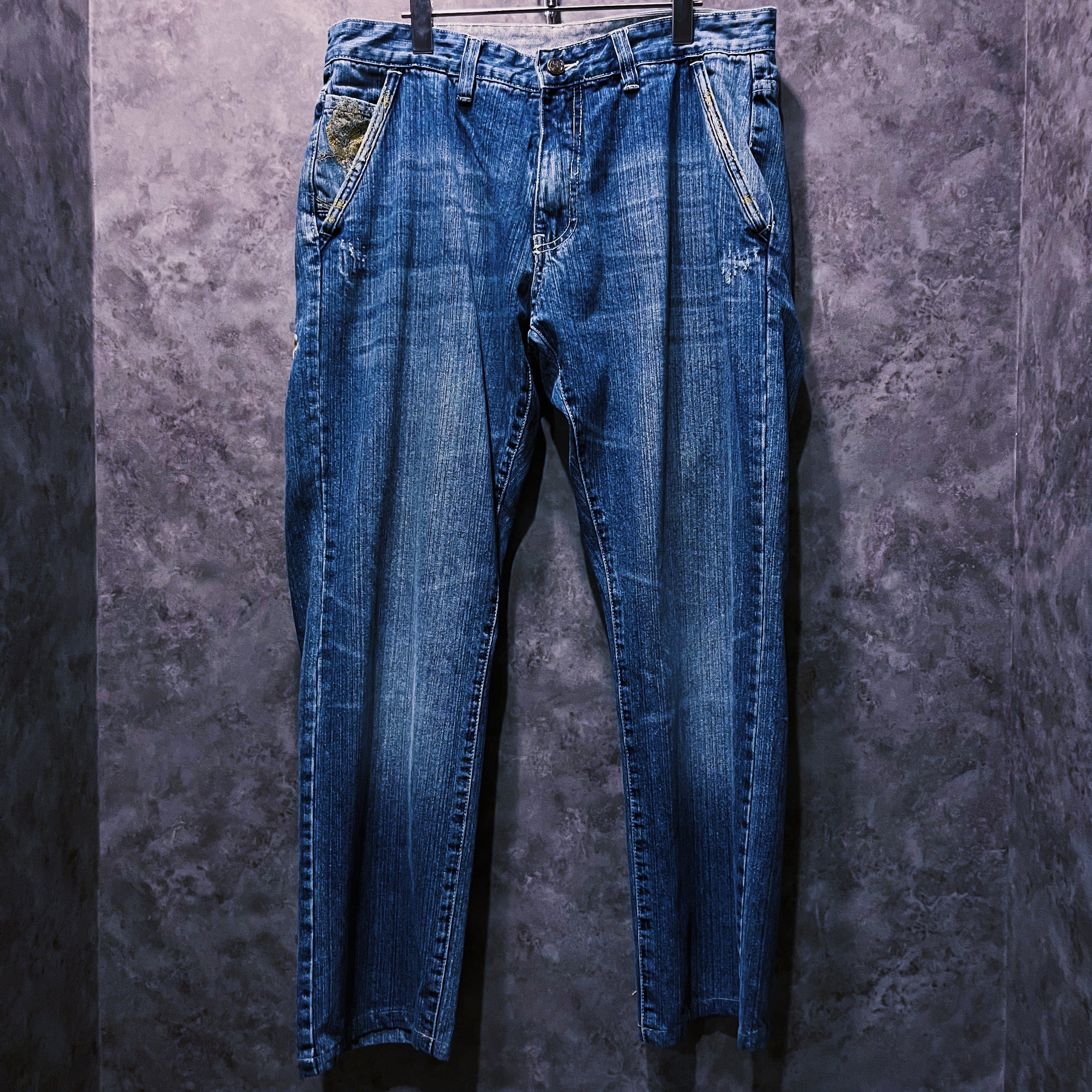 00‘sヴィンテージ“Artful Dodger”イエローバードエンブロイダリーデザインデニムパンツ