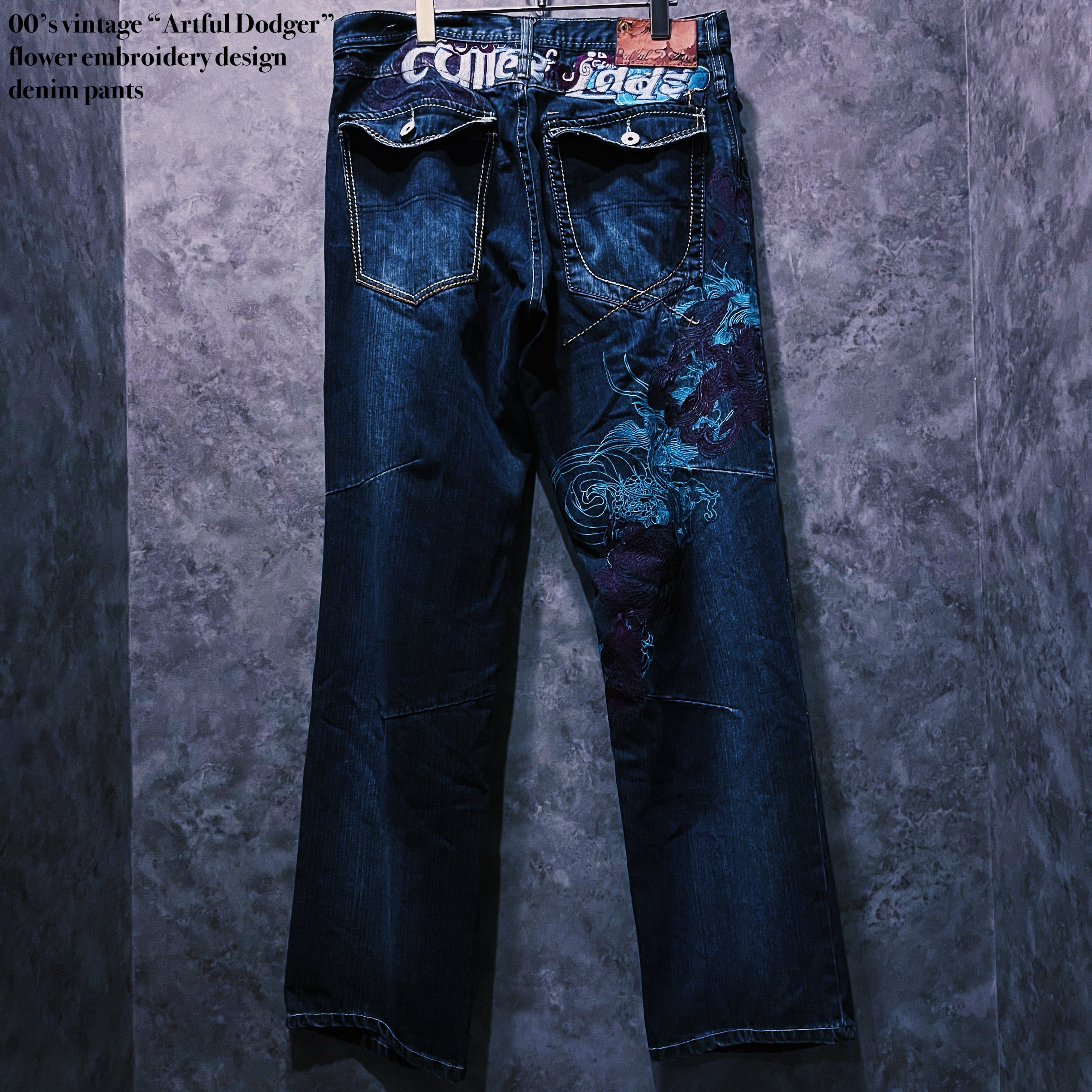 00‘sヴィンテージ“Artful Dodger”フラワーエンブロイダリーデザインデニムパンツ