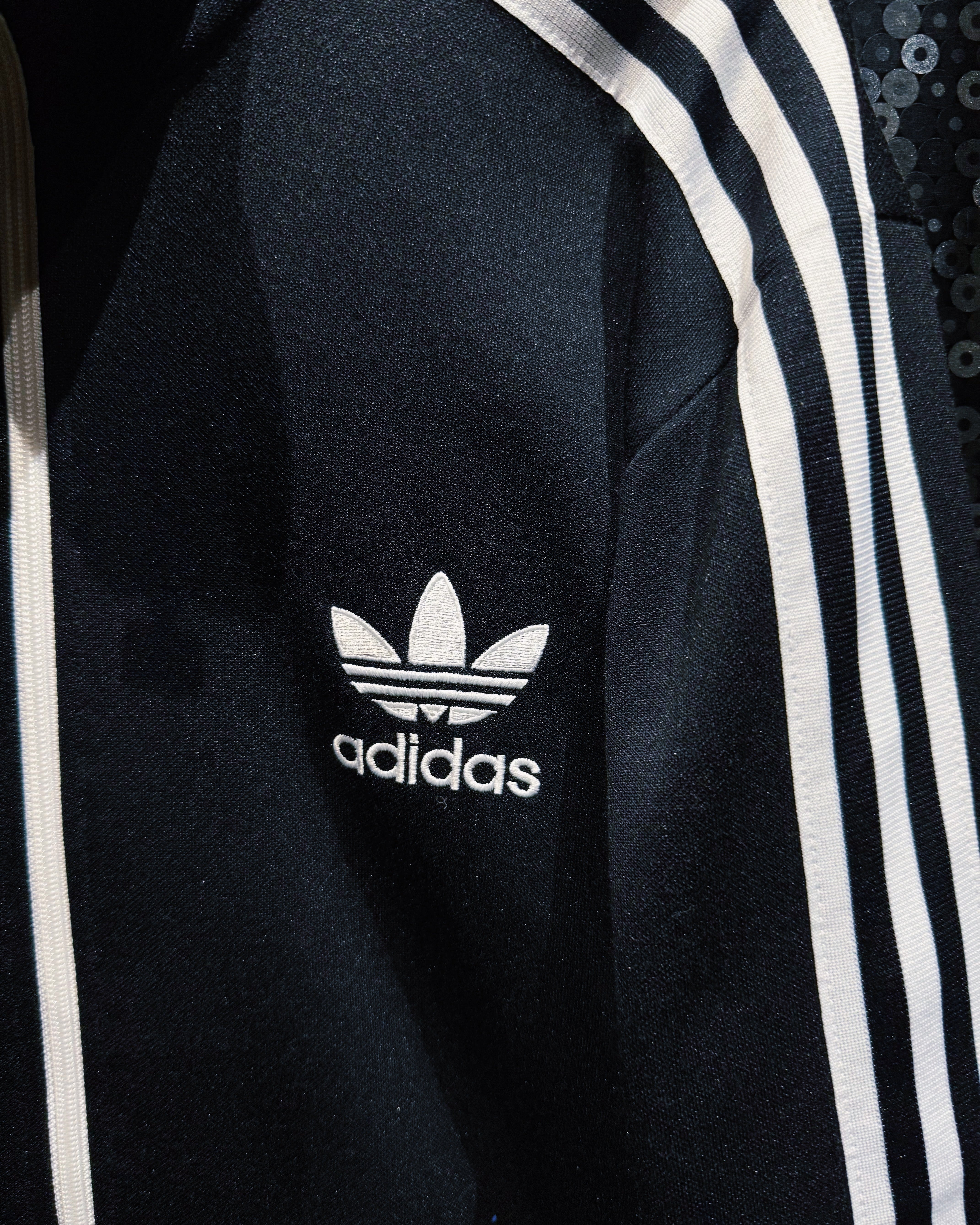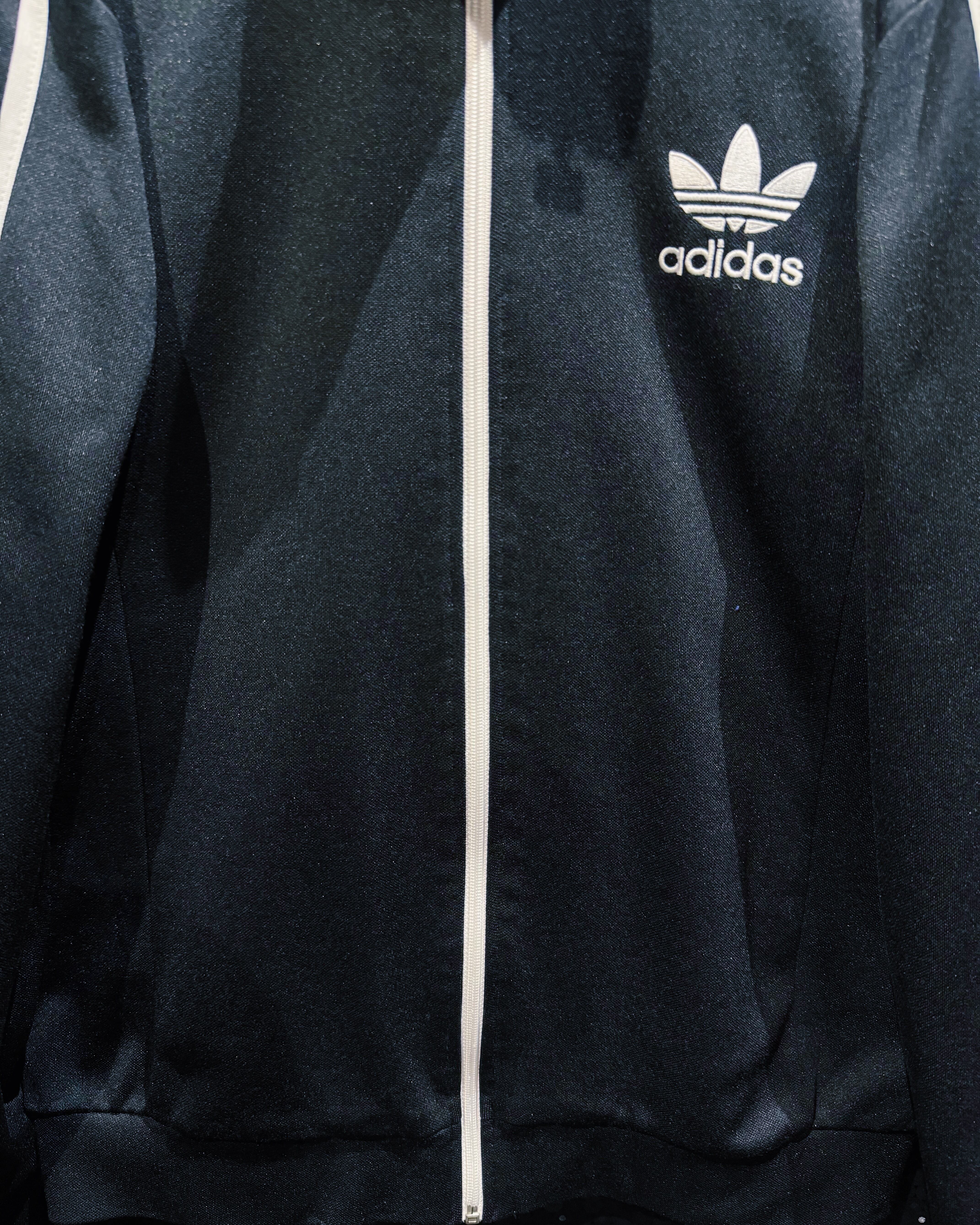 adidas originalsを象徴する、ブラック×ホワイトの定番トラックジャケット。漆黒のボディに走るホワイトのスリーストライプと、胸元のトレフォイル刺繍ロゴが際立つミニマルなデザイン。
