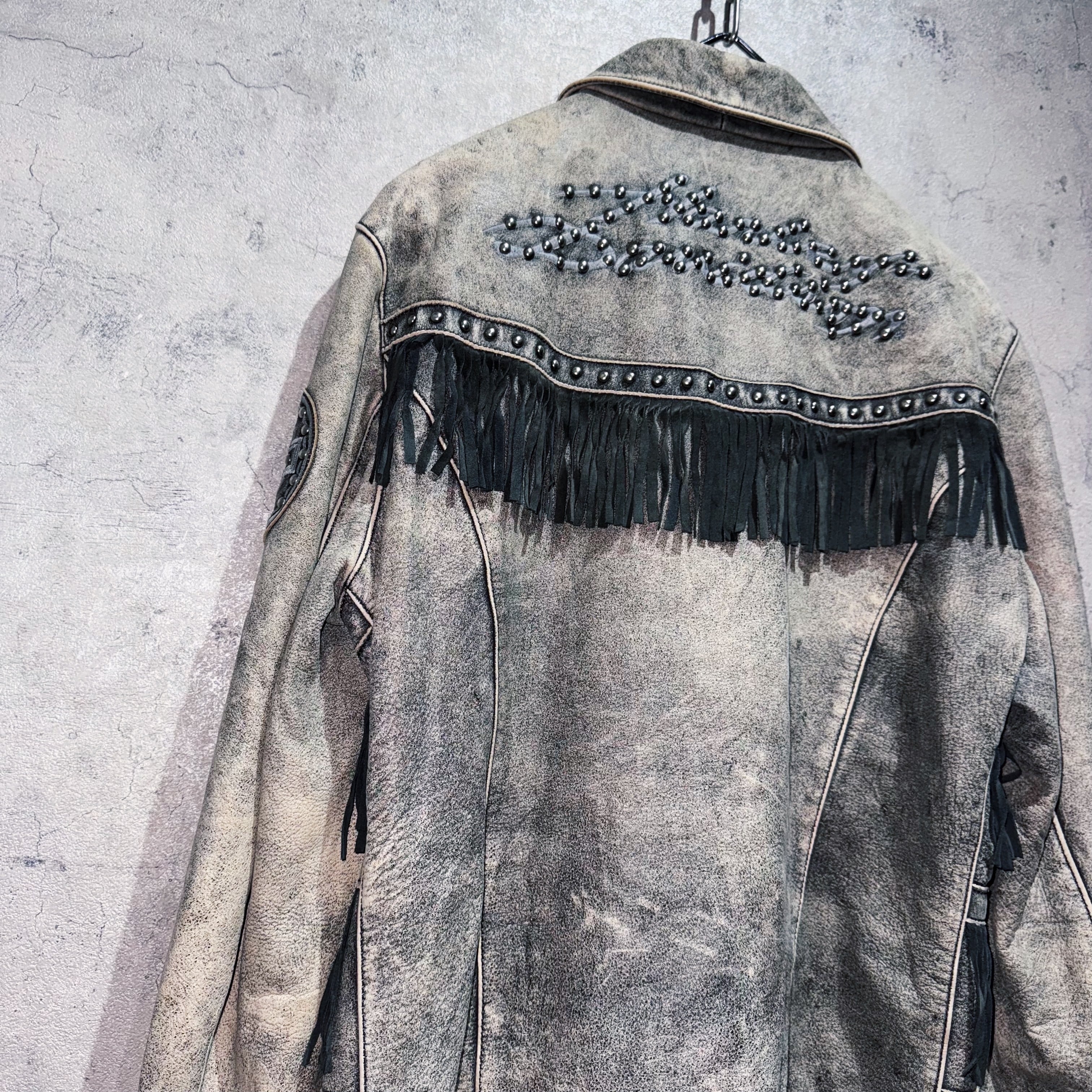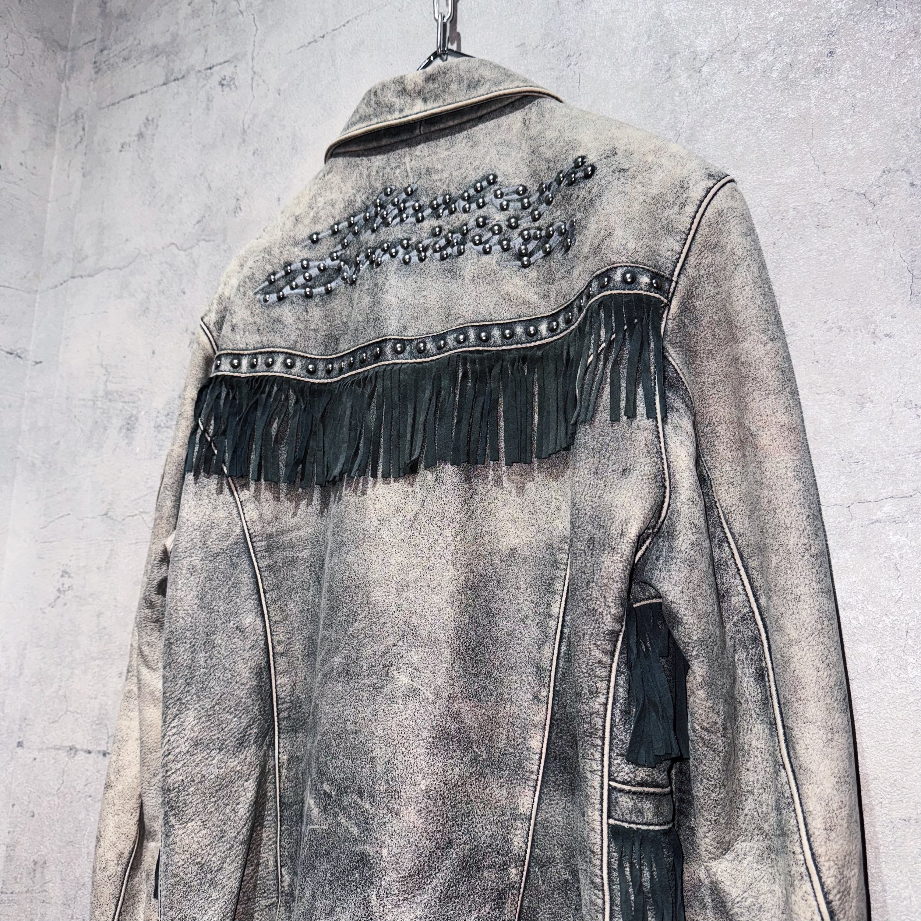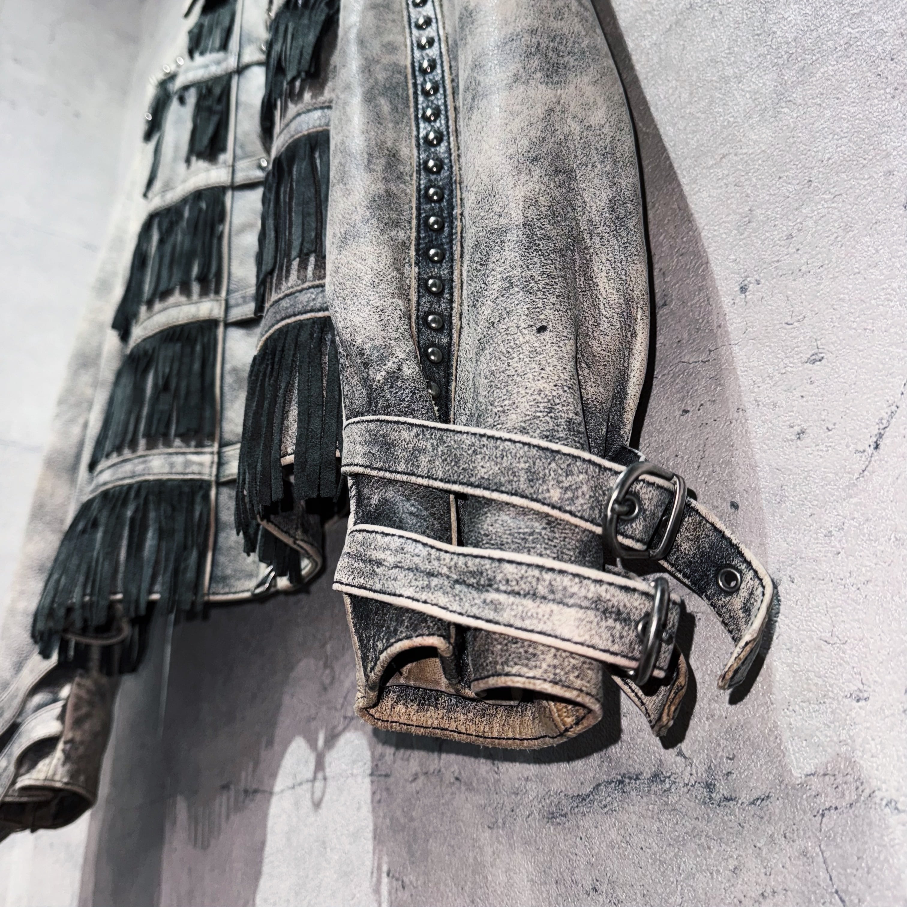 色褪せた退廃的な本革をボディに、フロントと背面にあしらわれたフリンジ、袖のラインと背面にしもあしらったスタッズデザインでパンク且つグランジさも漂うレザージャケット。
